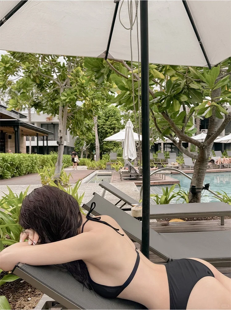 比基尼作为夏日海滩与泳池的时尚符号,始终在性感与个性的边界演绎着独特魅力。图中这款黑色系比基尼,以简约色调为基底,在设计细节处迸发巧思,成为时尚爱好者展现自我风格的绝佳载体。\n