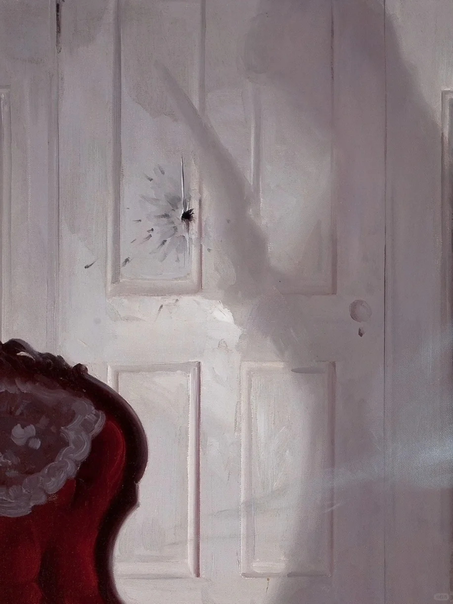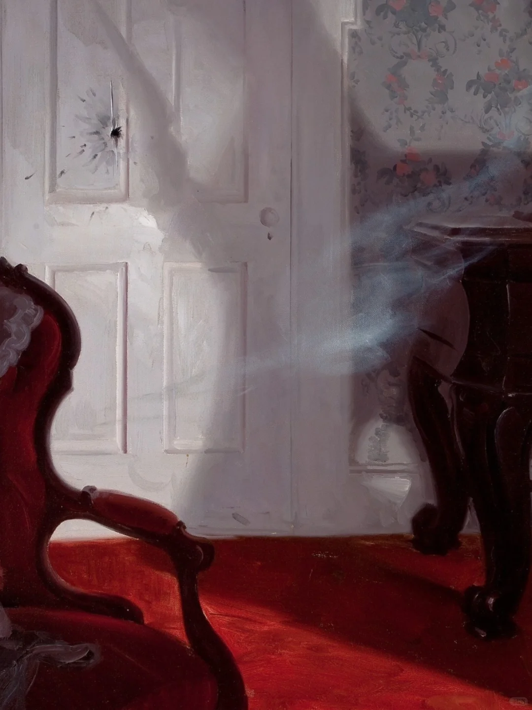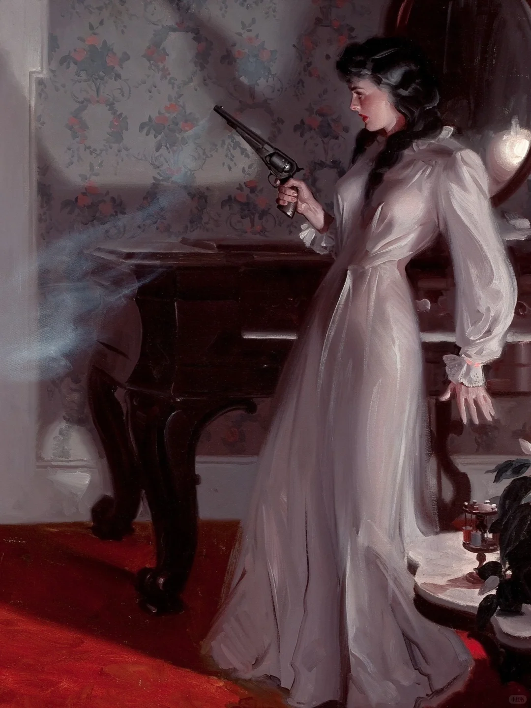 汤姆·洛弗尔(美)《黑暗中的一枪》(1943年)。\n \n画面弥漫着浓重的紧张感。一位身着浅色睡袍的女子优雅而又镇定地站在一间装饰华丽的维多利亚风格房间里,一盏煤油灯散发的光芒戏剧性地照亮了她的身体。\n \n周围的细节十分丰富:深红色的地毯、带软垫的椅子、印有精致花卉图案的墙纸、一面只反射灯光却无其他影像的镜子。\n \n然而,女子的注意力却投向别处。她一只手握着左轮手枪,枪身仍在冒烟——蓝灰色的烟缕在空中划出一道诡异的弧线。房间的白色板门上有一个弹孔,周围布满蛛网状的裂纹。她脸上的表情难以捉摸——没有惊慌,没有胜利,只有一种可怖的静止,仿佛连她自己也不确定刚刚发生了什么。\n \n画中没有血迹,没有尸体,也看不到入侵者。但暴力已经发生,只是藏在画面之外,留给观者的是其诡异的余波,是风暴后的寂静。画作标题《黑暗中的一枪》加深了这种模糊性:这是简单的盲目开了一枪,还是象征着冒险、绝望与恐惧?\n \n优雅与暴力之间的张力也显而易见。女子那件长长的白色睡袍乍一看像婚纱——纯净,甚至脆弱,但她握枪的手沉稳有力,显然并非需要拯救的少女。她的影子被拉得很长,为整幅画增添了黑色的电影质感。这间屋子虽美,却让人感到压抑。\n \n洛弗尔以历史题材和西部场景画闻名,而在此画中,他展现了另一种戏剧性。1943年该画创作时,正处于二战最激烈时期,或许反映了战时的焦虑,家庭内部的恐惧以及普通公民意外成为守护者的转变。\n \n#光影油画 #名画 #每日分享一幅名画作品 #世界名画 #艺术欣赏 #艺术分享 #艺术与情感 #遇见艺术 #浪漫主义 #第二次世界大战