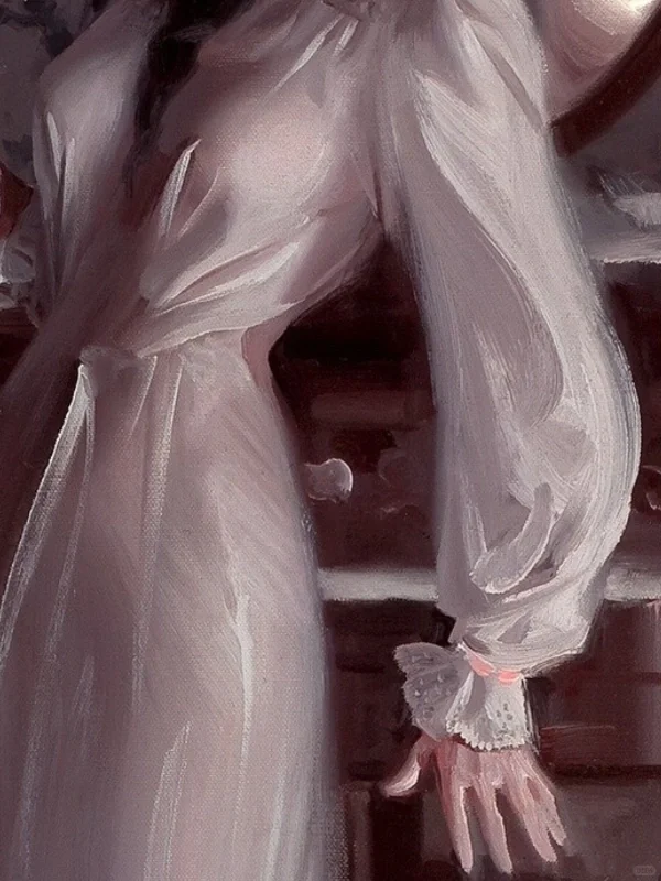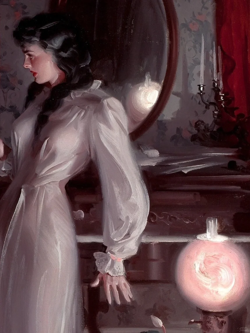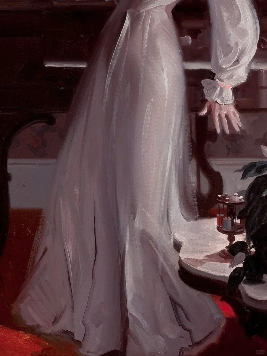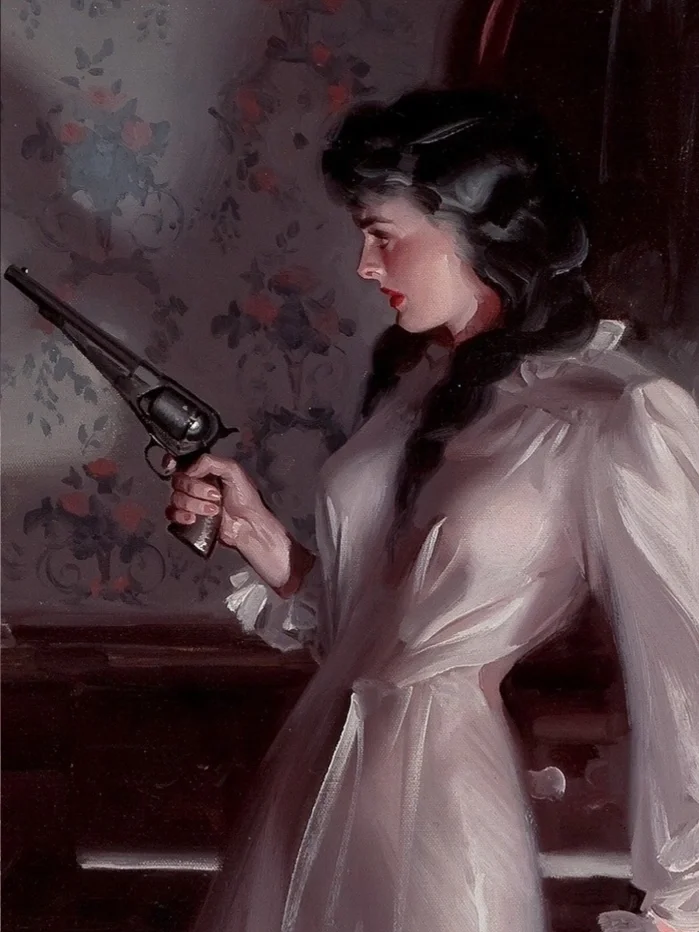 汤姆·洛弗尔(美)《黑暗中的一枪》(1943年)。\n \n画面弥漫着浓重的紧张感。一位身着浅色睡袍的女子优雅而又镇定地站在一间装饰华丽的维多利亚风格房间里,一盏煤油灯散发的光芒戏剧性地照亮了她的身体。\n \n周围的细节十分丰富:深红色的地毯、带软垫的椅子、印有精致花卉图案的墙纸、一面只反射灯光却无其他影像的镜子。\n \n然而,女子的注意力却投向别处。她一只手握着左轮手枪,枪身仍在冒烟——蓝灰色的烟缕在空中划出一道诡异的弧线。房间的白色板门上有一个弹孔,周围布满蛛网状的裂纹。她脸上的表情难以捉摸——没有惊慌,没有胜利,只有一种可怖的静止,仿佛连她自己也不确定刚刚发生了什么。\n \n画中没有血迹,没有尸体,也看不到入侵者。但暴力已经发生,只是藏在画面之外,留给观者的是其诡异的余波,是风暴后的寂静。画作标题《黑暗中的一枪》加深了这种模糊性:这是简单的盲目开了一枪,还是象征着冒险、绝望与恐惧?\n \n优雅与暴力之间的张力也显而易见。女子那件长长的白色睡袍乍一看像婚纱——纯净,甚至脆弱,但她握枪的手沉稳有力,显然并非需要拯救的少女。她的影子被拉得很长,为整幅画增添了黑色的电影质感。这间屋子虽美,却让人感到压抑。\n \n洛弗尔以历史题材和西部场景画闻名,而在此画中,他展现了另一种戏剧性。1943年该画创作时,正处于二战最激烈时期,或许反映了战时的焦虑,家庭内部的恐惧以及普通公民意外成为守护者的转变。\n \n#光影油画 #名画 #每日分享一幅名画作品 #世界名画 #艺术欣赏 #艺术分享 #艺术与情感 #遇见艺术 #浪漫主义 #第二次世界大战