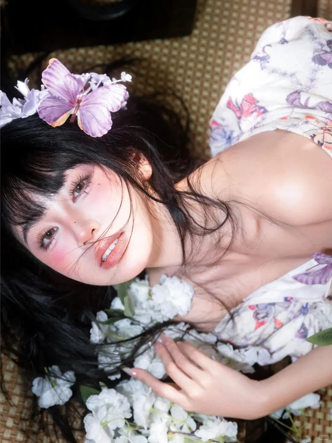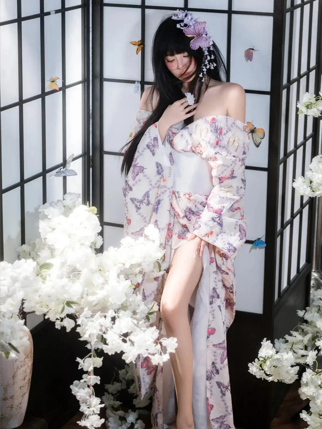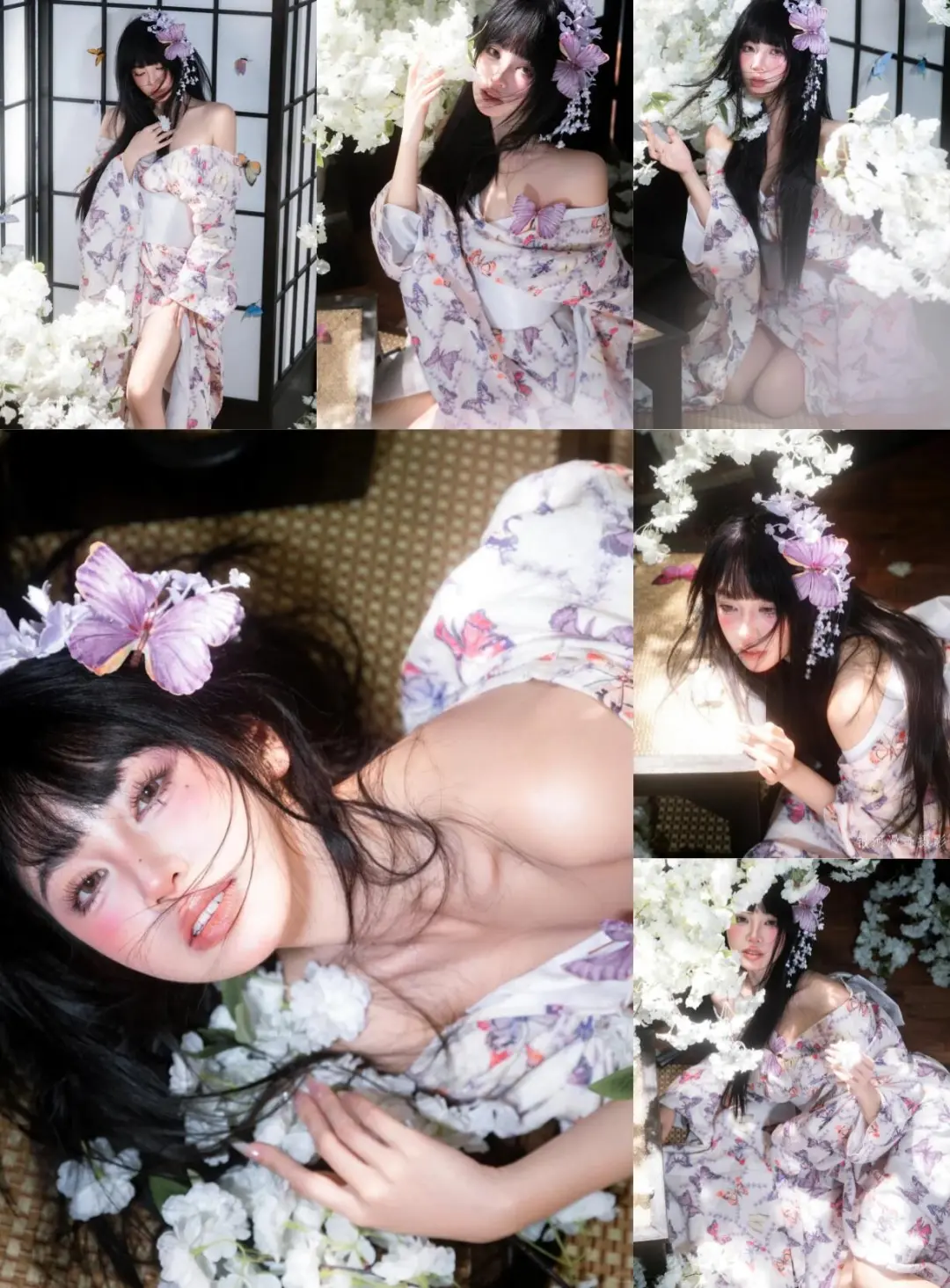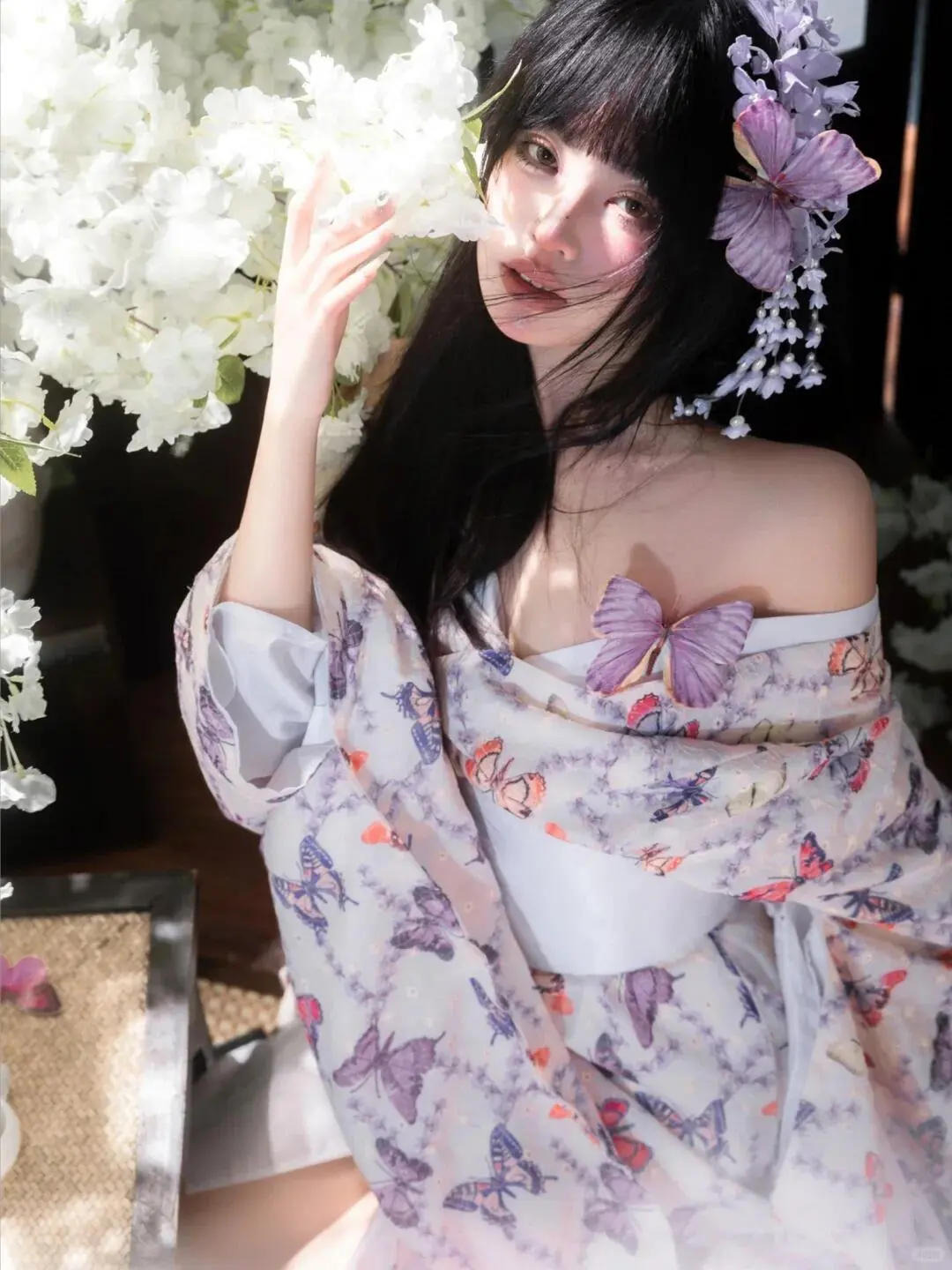 身着印花和服,搭配上娇艳的花朵头饰