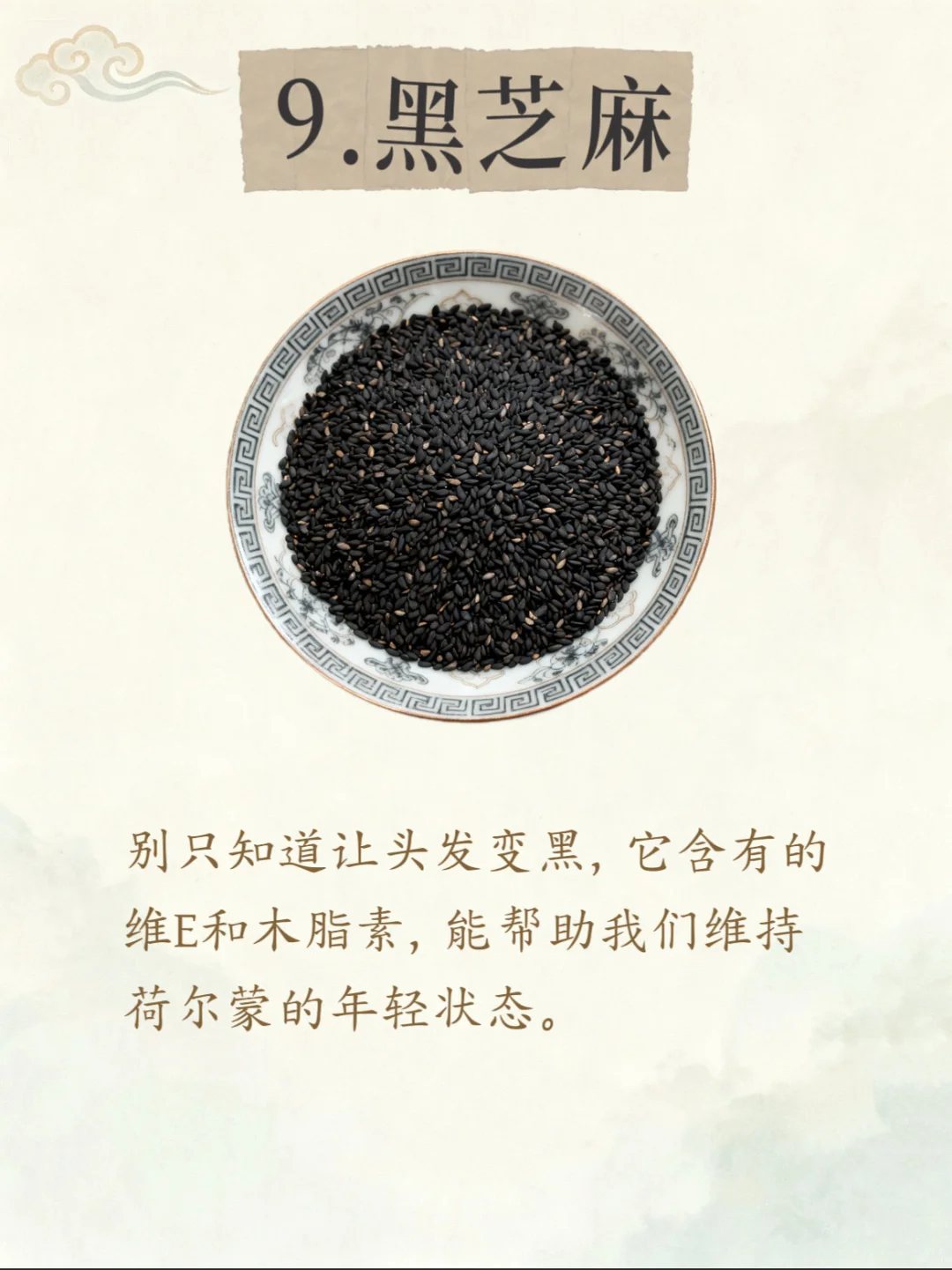 9. 黑芝麻:别只知道让头发变黑,它含有的维E和木脂素,能帮助我们维持荷尔蒙的年轻状态。