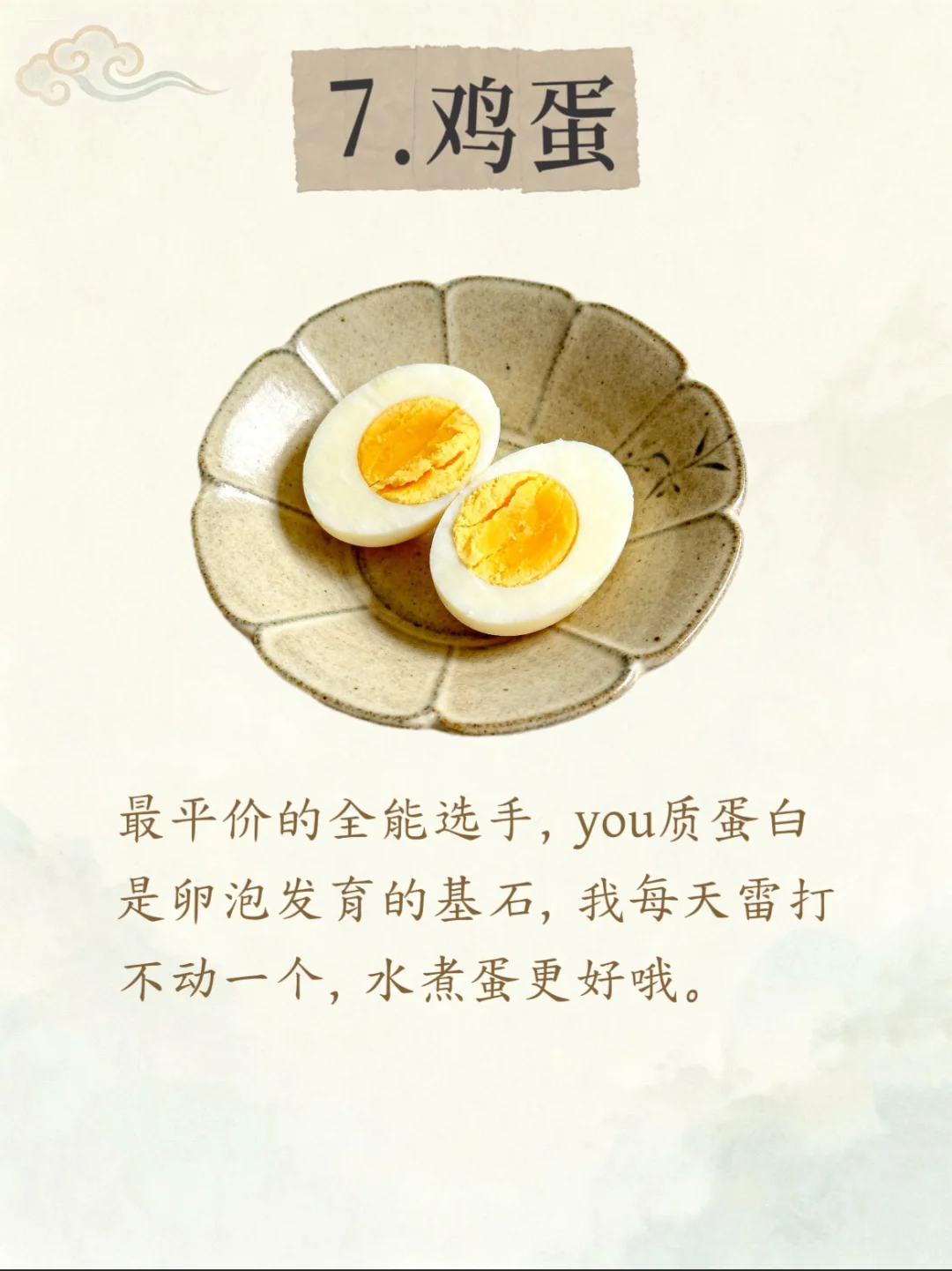 7. 鸡蛋:最平价的全能选手,you质蛋白是卵泡发育的基石,我每天雷打不动一个,水煮蛋更好哦。