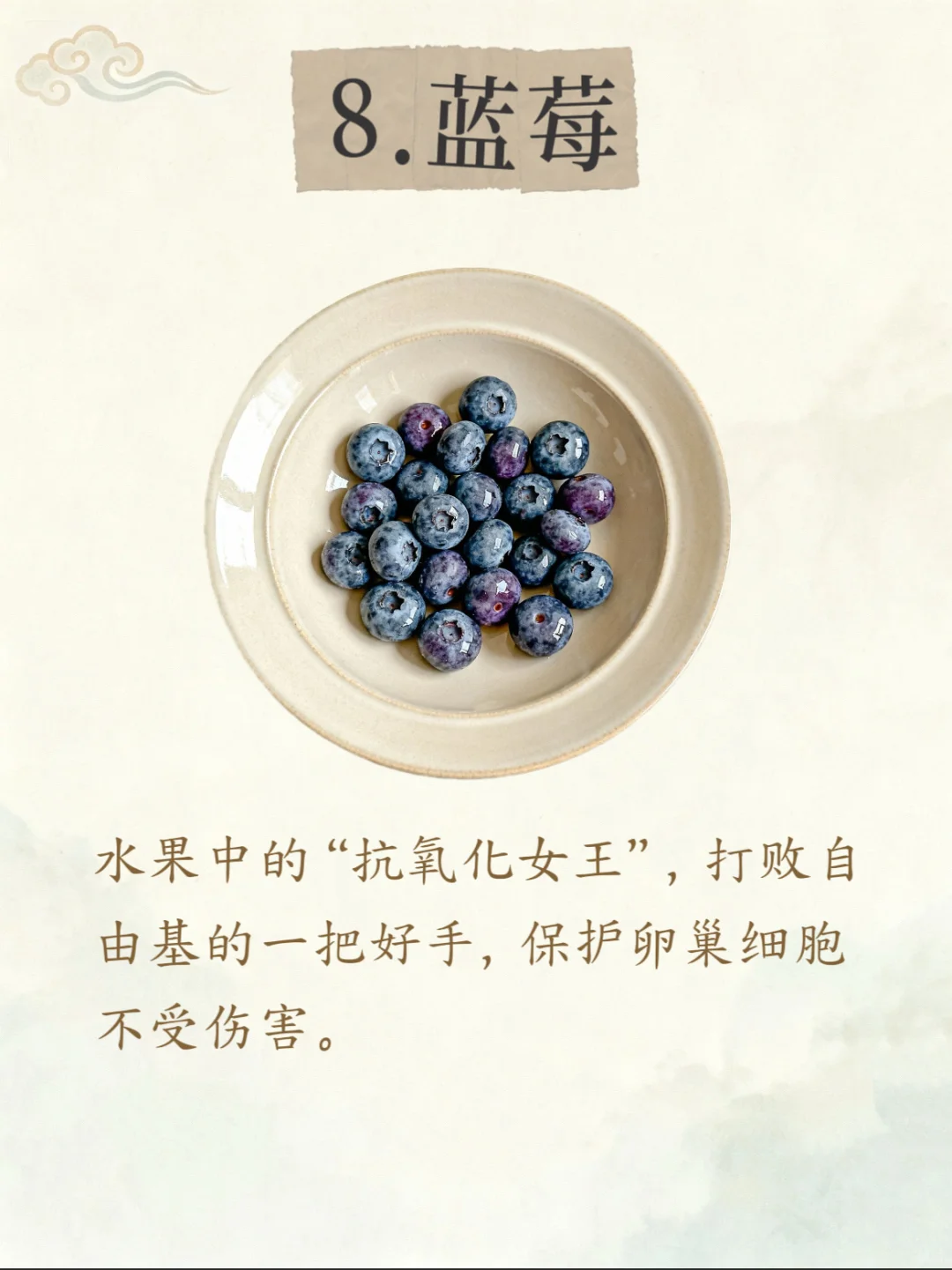 8. 蓝莓:水果中的“抗氧化女王”,打败自由基的一把好手,保护卵巢细胞不受伤害。
