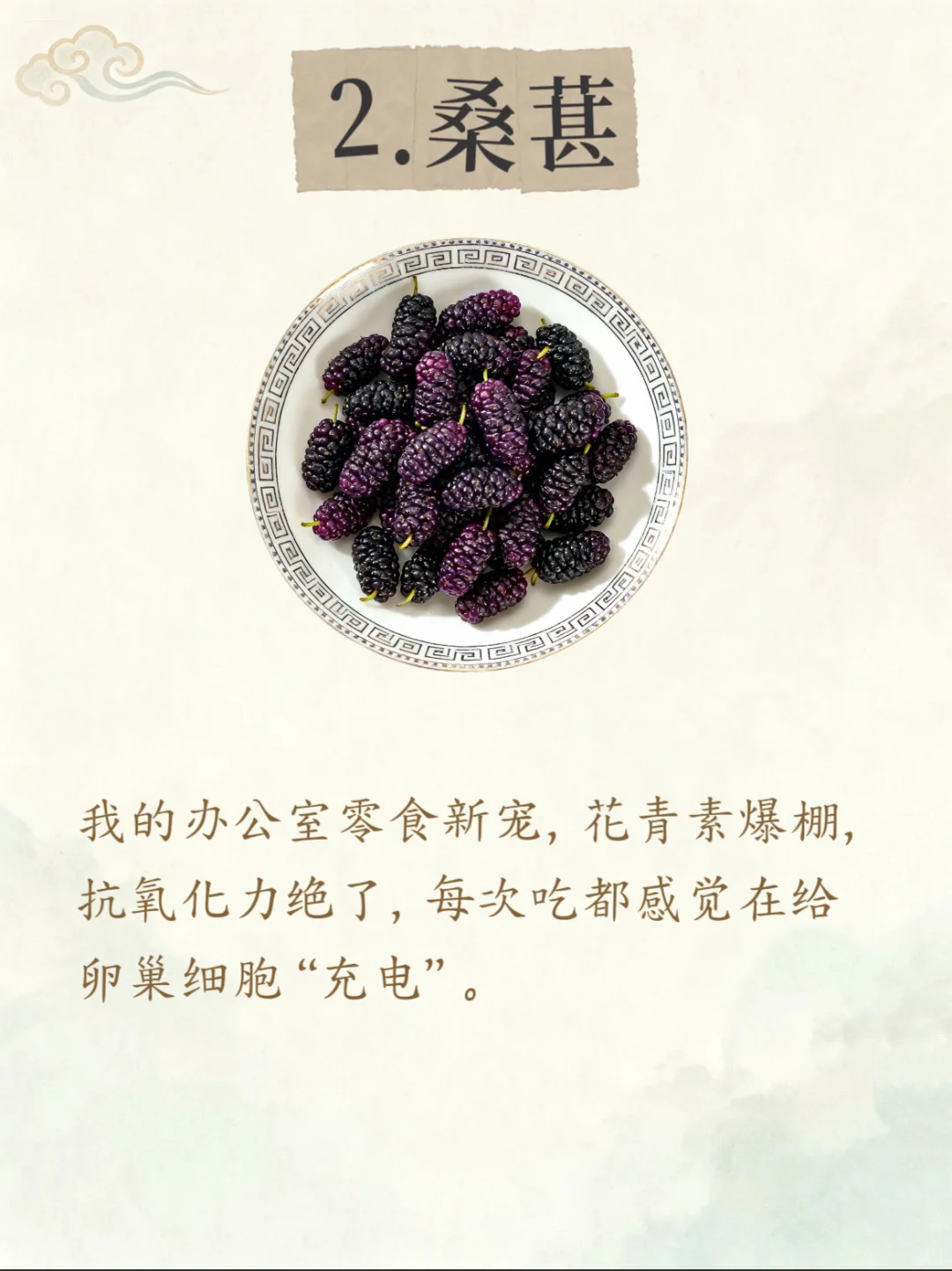 2. 桑葚:我的办公室零食新宠,花青素爆棚,抗氧化力绝了,每次吃都感觉在给卵巢细胞“充电”。