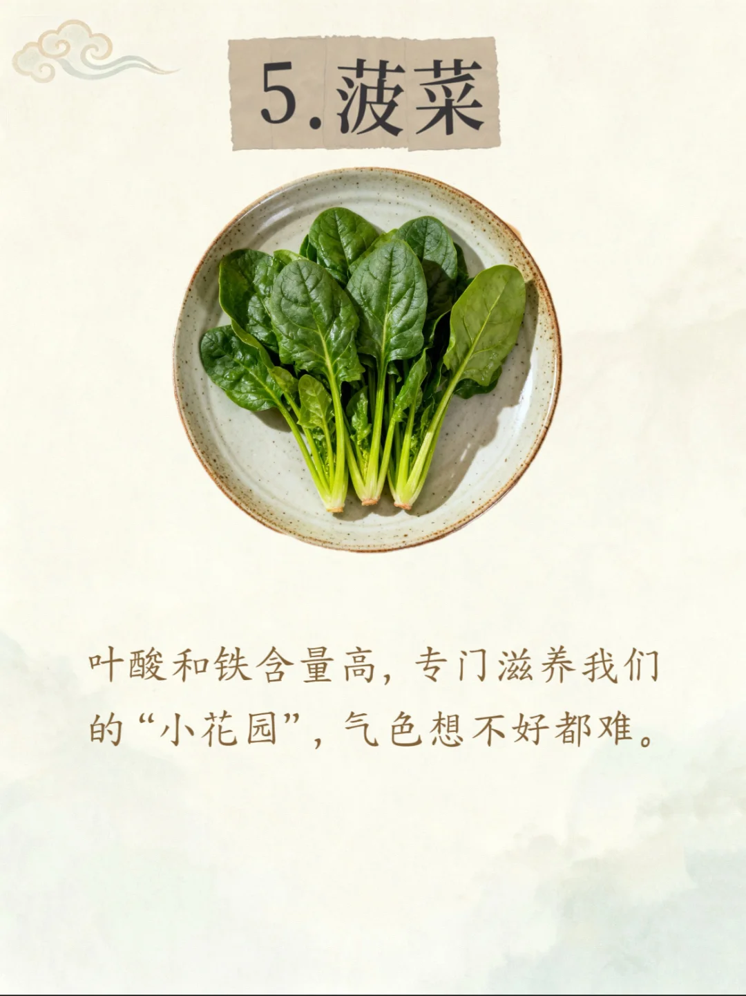 5. 菠菜:叶酸和铁含量高,专门滋养我们的“小花园”,气色想不好都难。