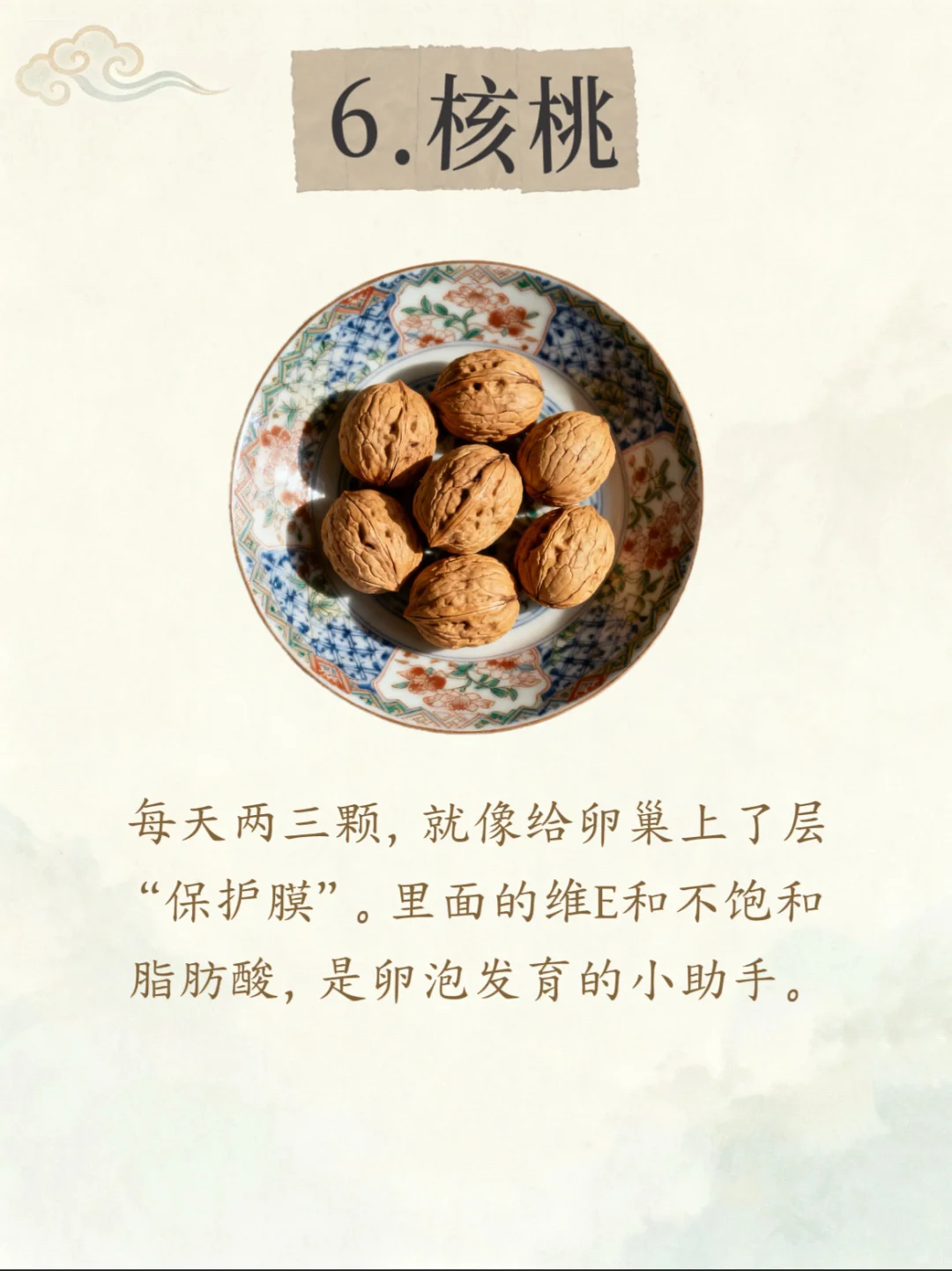 6. 核桃:每天两三颗,就像给卵巢上了层“保护膜”。里面的维E和不饱和脂肪酸,是卵泡发育的小助手。