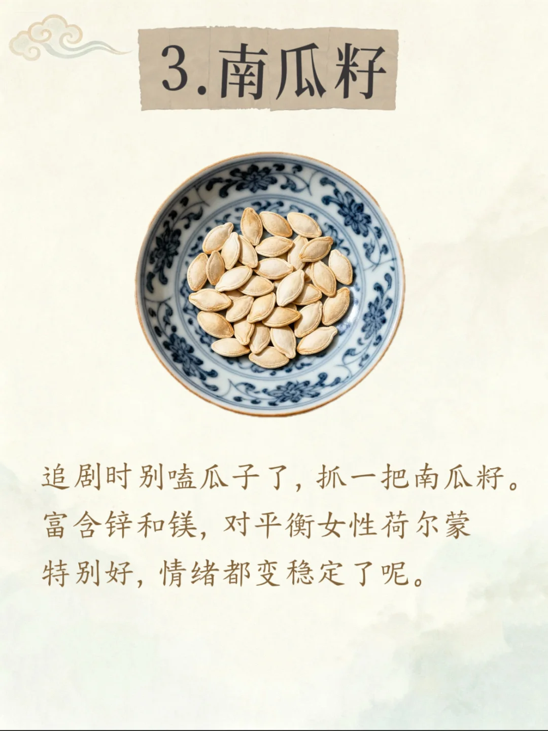 3. 南瓜籽:追剧时别嗑瓜子了,抓一把南瓜籽。富含锌和镁,对平衡女性荷尔蒙特别好,情绪都变稳定了呢。