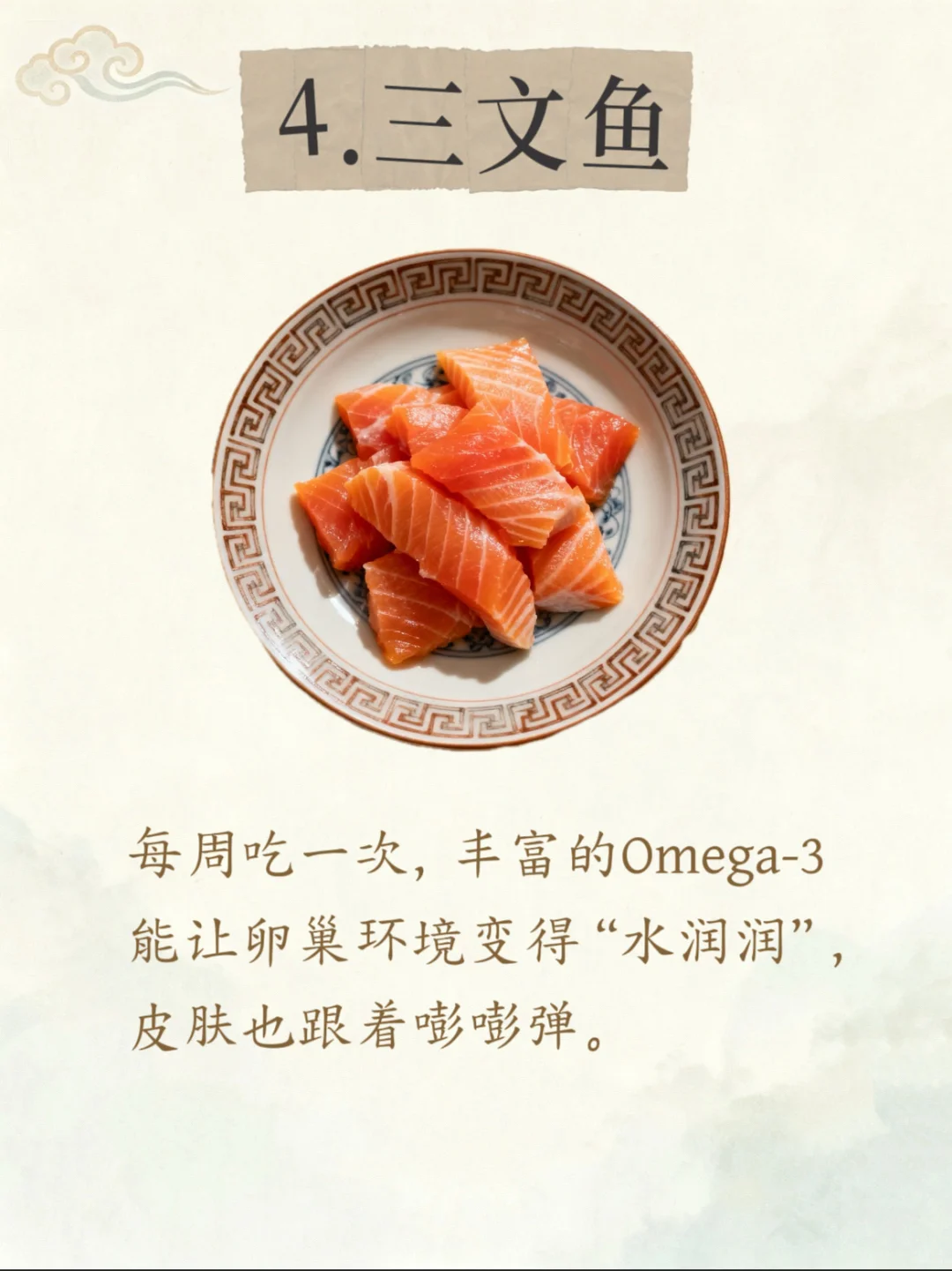 4. 三文鱼:每周吃一次,丰富的Omega-3能让卵巢环境变得“水润润”,皮肤也跟着嘭嘭弹。