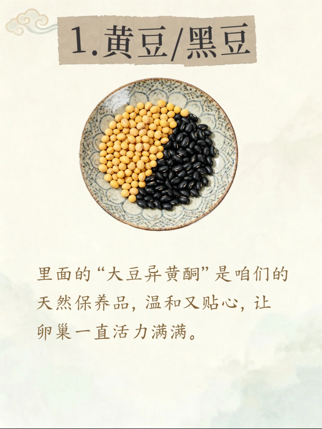 1. 黄豆/黑豆:里面的“大豆异黄酮”是咱们的天然保养品,温和又贴心,让卵巢一直活力满满。