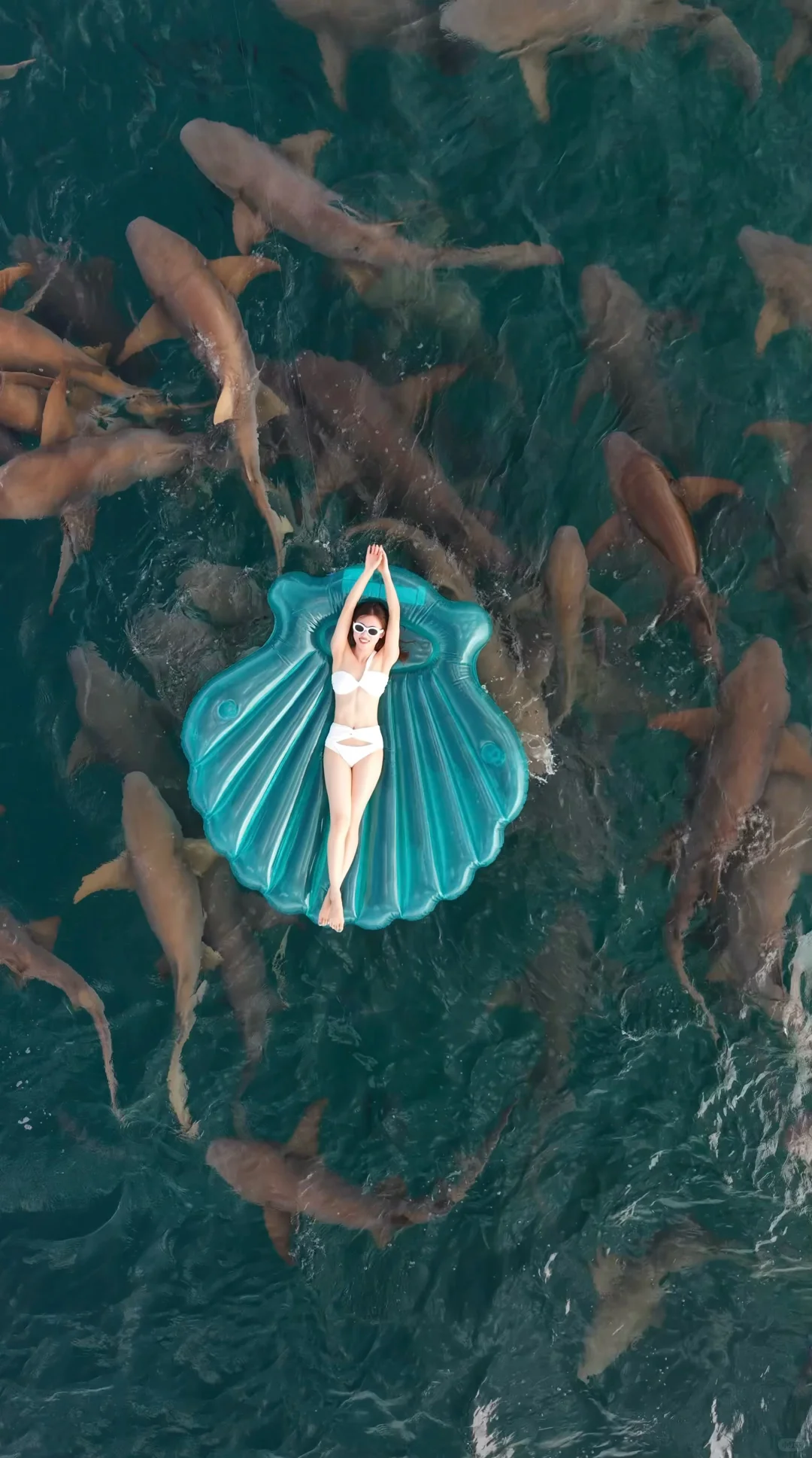 p2白色泳衣(看到很多姐妹在shark trip出海都是用的粉色贝壳。我反倒喜欢这个蓝色的!穿白色在蓝色贝壳上跟海水也比较契合!)