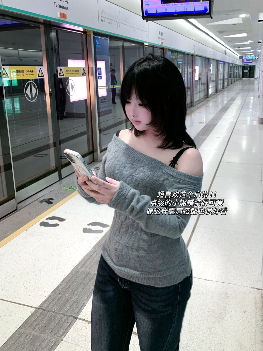 颜值在线又显胸大,蝴蝶结内衣肩带搭配斜肩上衣又可爱又性感真的很喜欢