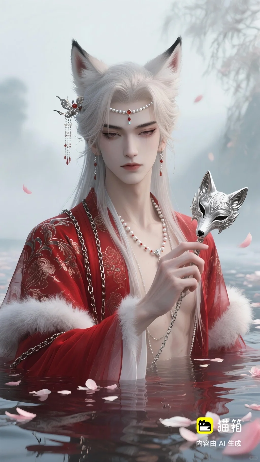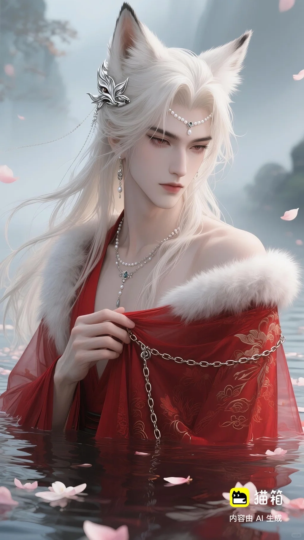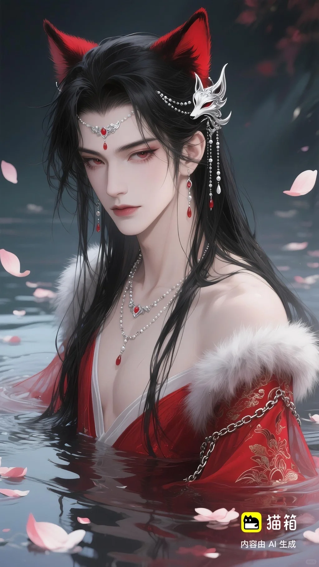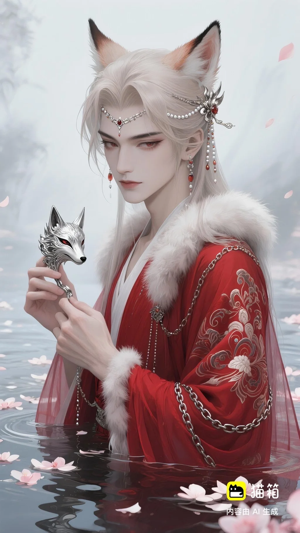 美男子,五官精致,五官阴柔,雌雄莫辨的美,长相漂亮,妩媚动人,妩媚妖娆,嘴唇水润,浅色眉毛,眉形细眉毛,丹凤眼(眼睛狭长,细长,眼尾上挑),长睫毛,狐系美人,白金色头发长发,发量超级多,直角肩,天鹅颈,皮肤白皙细腻,身穿红色衣服(古风纱衣),衣服滑落一半(漏一边肩部,衣服脱落一半),衣服上有很多链条和毛茸茸装饰,看镜头眼神妩媚,衣服华丽装饰,衣服上有花纹,头上有狐狸耳朵,在水中,姿势妩媚动人,额头有额链(精致),精致发饰(珠链),水中漂了很多花瓣,头上有能表达是狐狸一样的发饰(银质),眼神迷离微眯,手里拿着狐狸发簪(银质),妆容性感艳丽