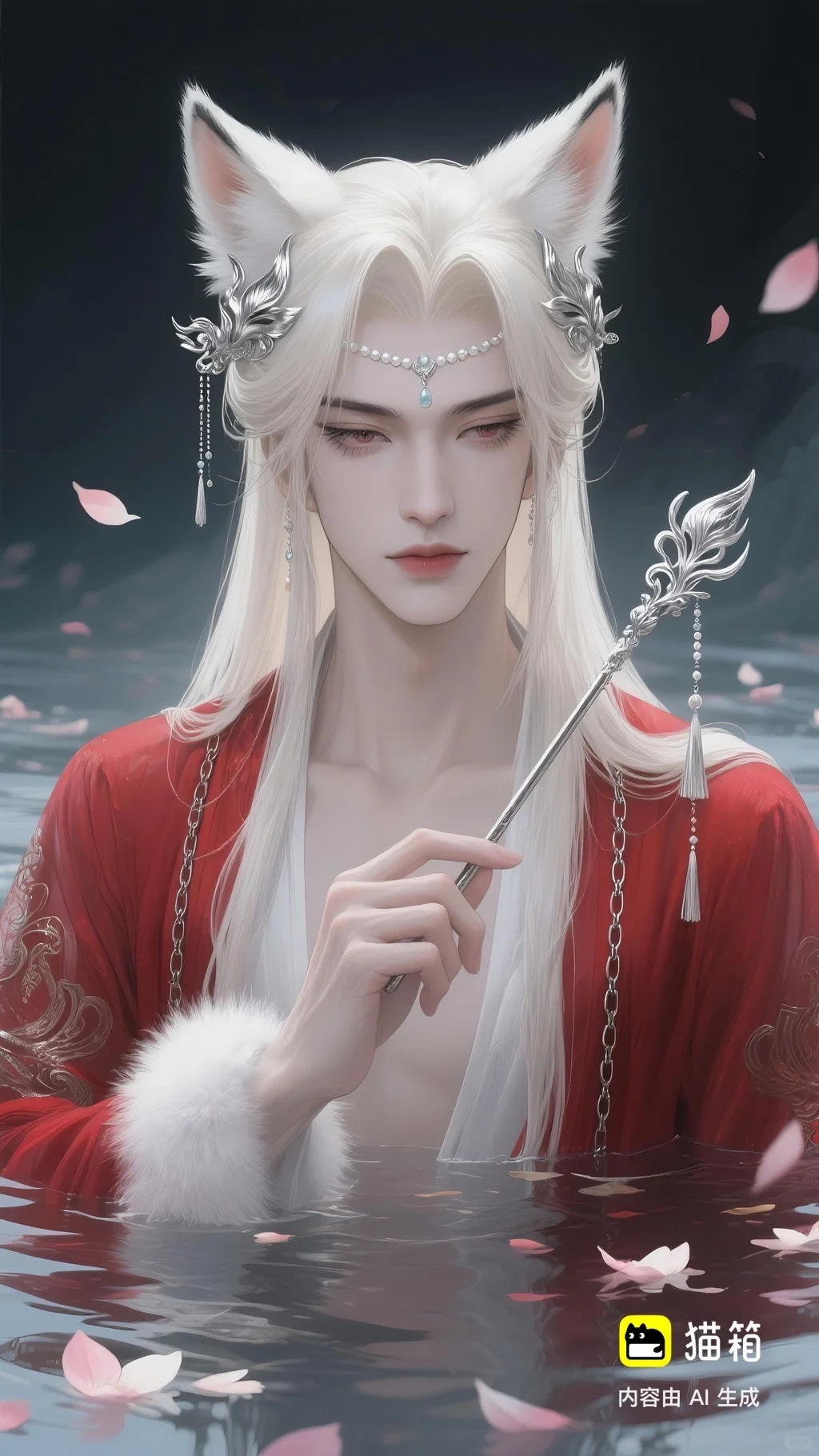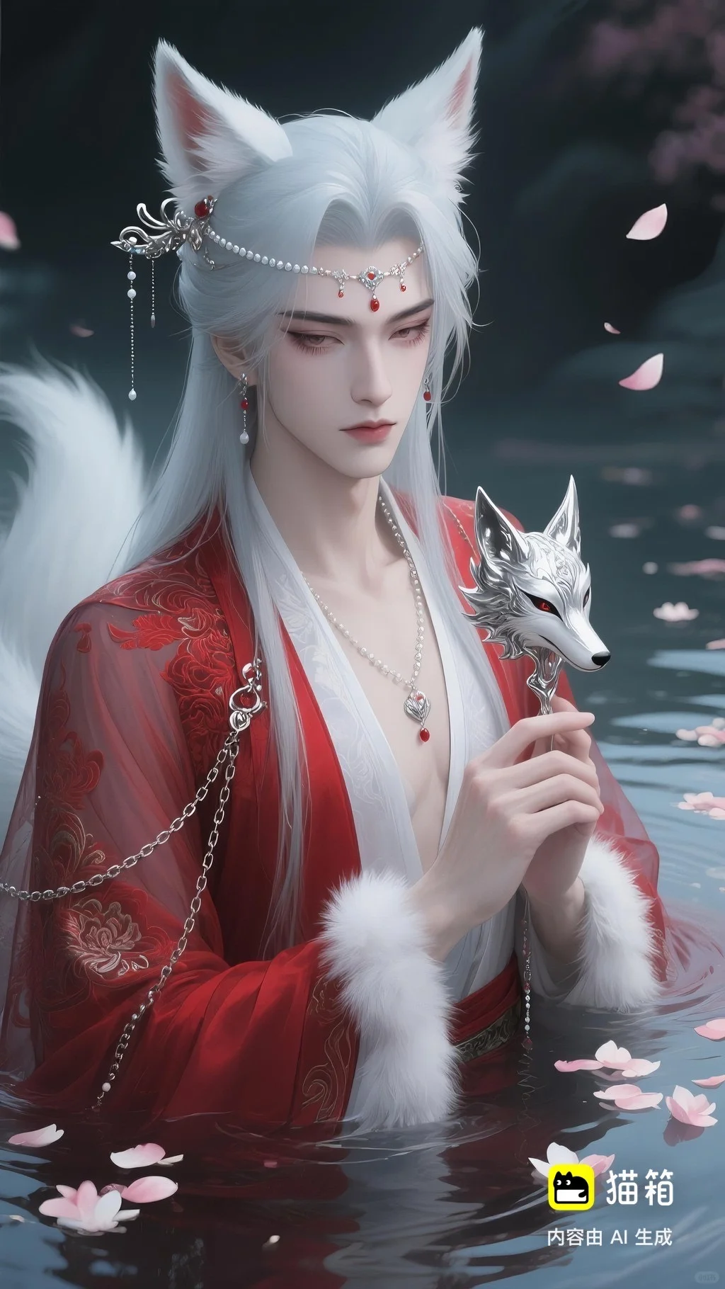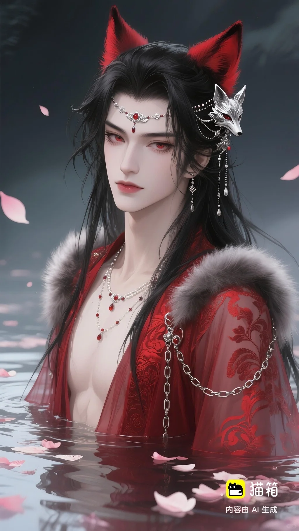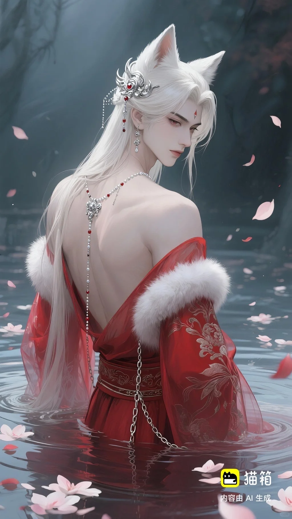 美男子,五官精致,五官阴柔,雌雄莫辨的美,长相漂亮,妩媚动人,妩媚妖娆,嘴唇水润,浅色眉毛,眉形细眉毛,丹凤眼(眼睛狭长,细长,眼尾上挑),长睫毛,狐系美人,白金色头发长发,发量超级多,直角肩,天鹅颈,皮肤白皙细腻,身穿红色衣服(古风纱衣),衣服滑落一半(漏一边肩部,衣服脱落一半),衣服上有很多链条和毛茸茸装饰,看镜头眼神妩媚,衣服华丽装饰,衣服上有花纹,头上有狐狸耳朵,在水中,姿势妩媚动人,额头有额链(精致),精致发饰(珠链),水中漂了很多花瓣,头上有能表达是狐狸一样的发饰(银质),眼神迷离微眯,手里拿着狐狸发簪(银质),妆容性感艳丽