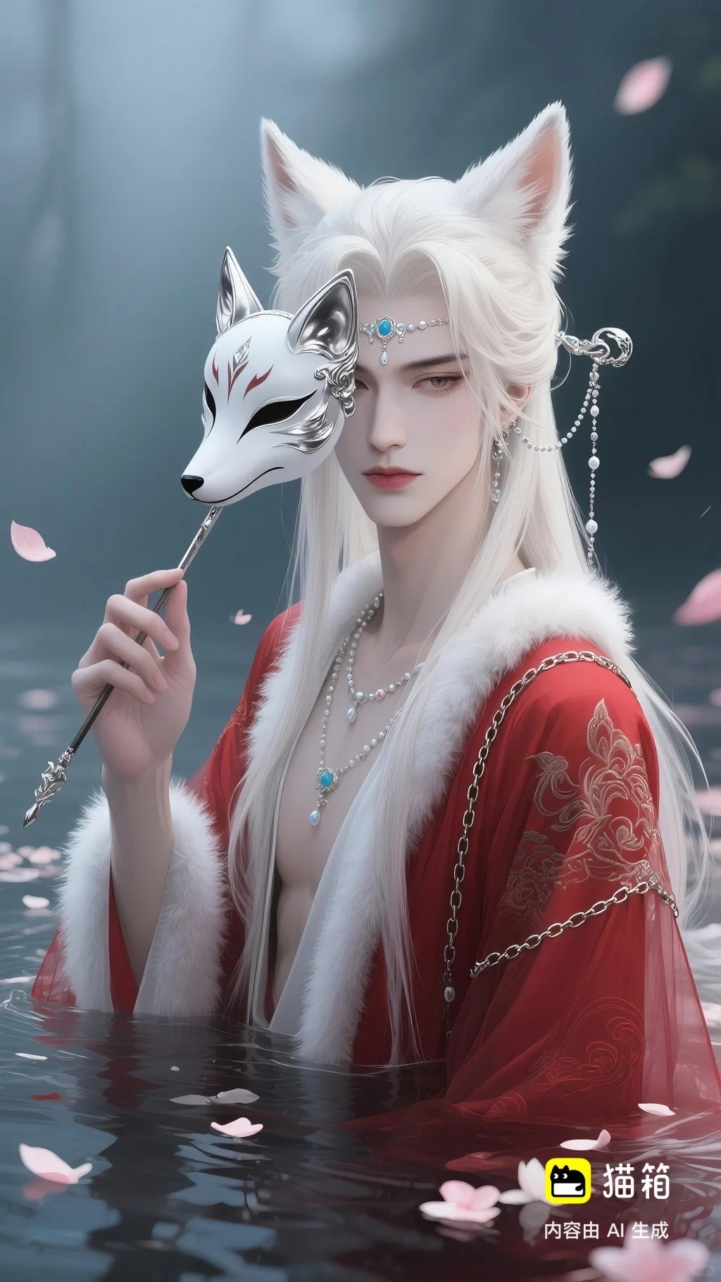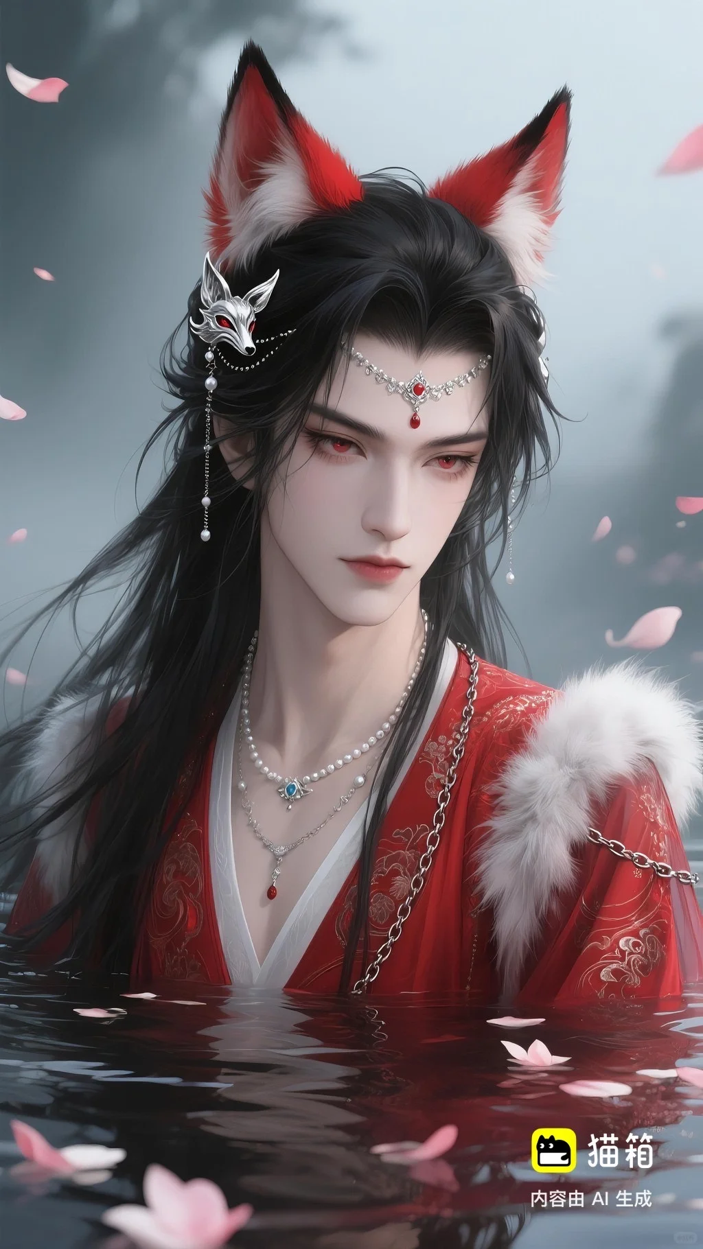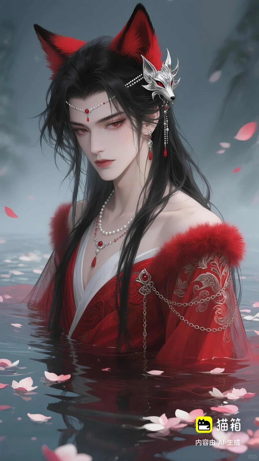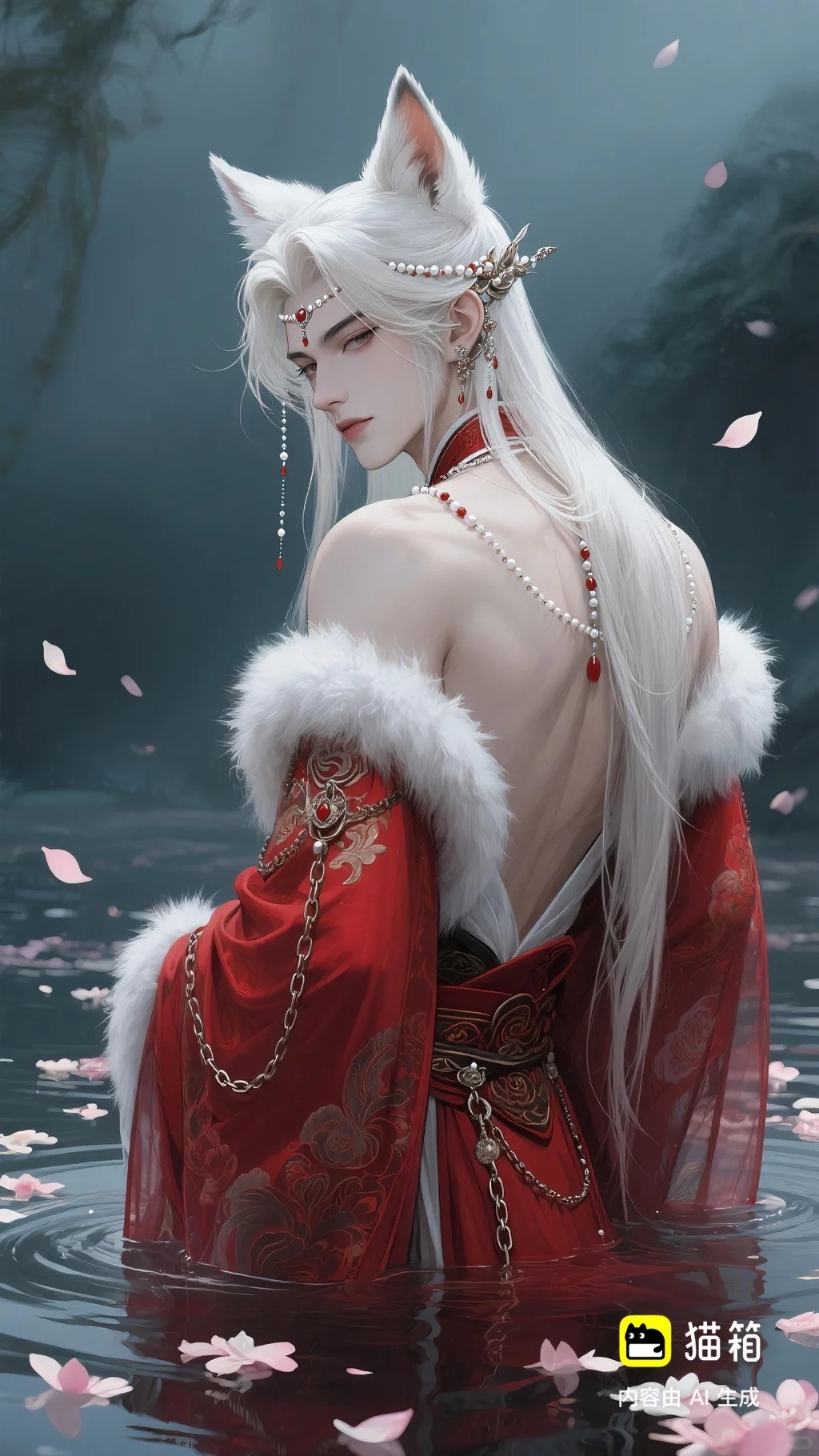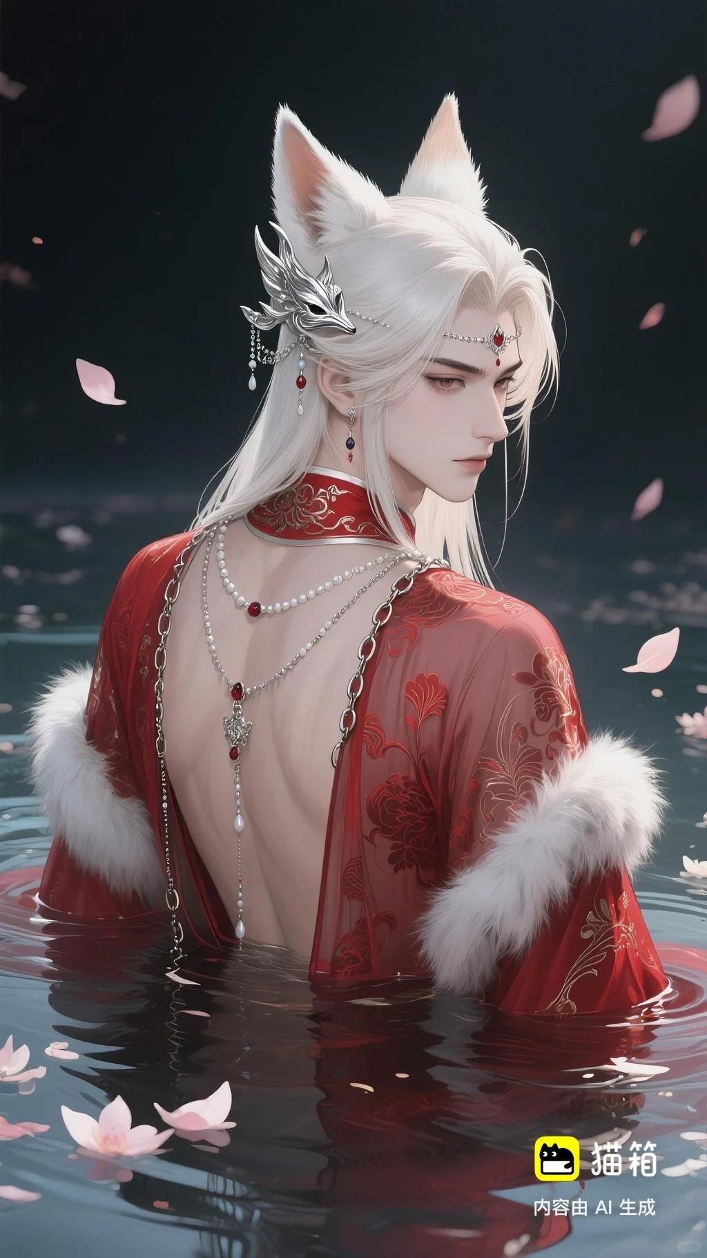 美男子,五官精致,五官阴柔,雌雄莫辨的美,长相漂亮,妩媚动人,妩媚妖娆,嘴唇水润,浅色眉毛,眉形细眉毛,丹凤眼(眼睛狭长,细长,眼尾上挑),长睫毛,狐系美人,白金色头发长发,发量超级多,直角肩,天鹅颈,皮肤白皙细腻,身穿红色衣服(古风纱衣),衣服滑落一半(漏一边肩部,衣服脱落一半),衣服上有很多链条和毛茸茸装饰,看镜头眼神妩媚,衣服华丽装饰,衣服上有花纹,头上有狐狸耳朵,在水中,姿势妩媚动人,额头有额链(精致),精致发饰(珠链),水中漂了很多花瓣,头上有能表达是狐狸一样的发饰(银质),眼神迷离微眯,手里拿着狐狸发簪(银质),妆容性感艳丽