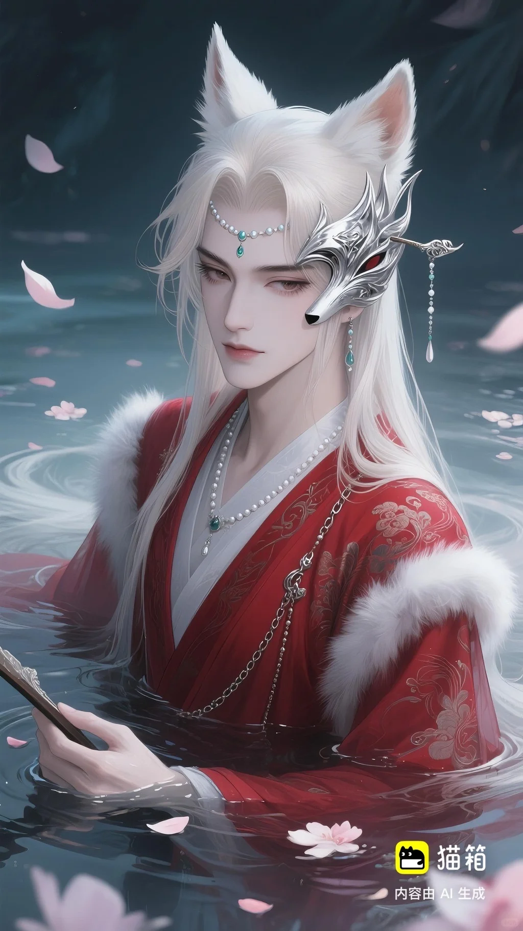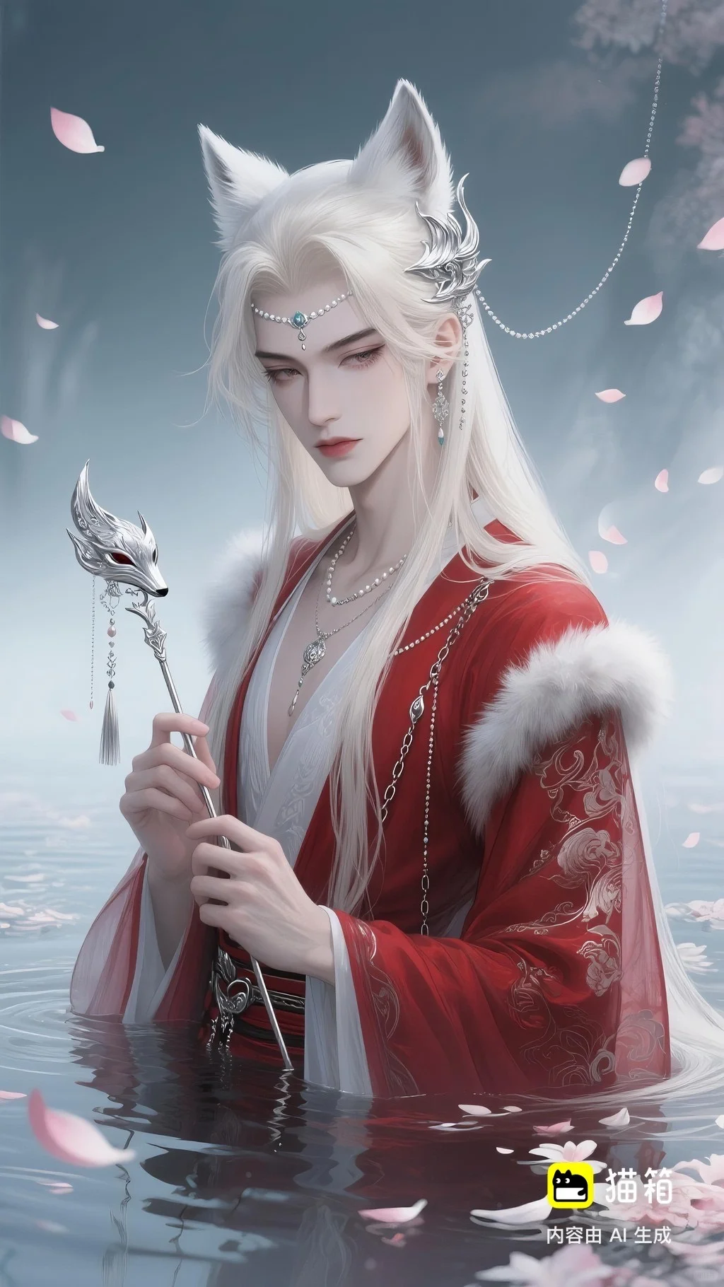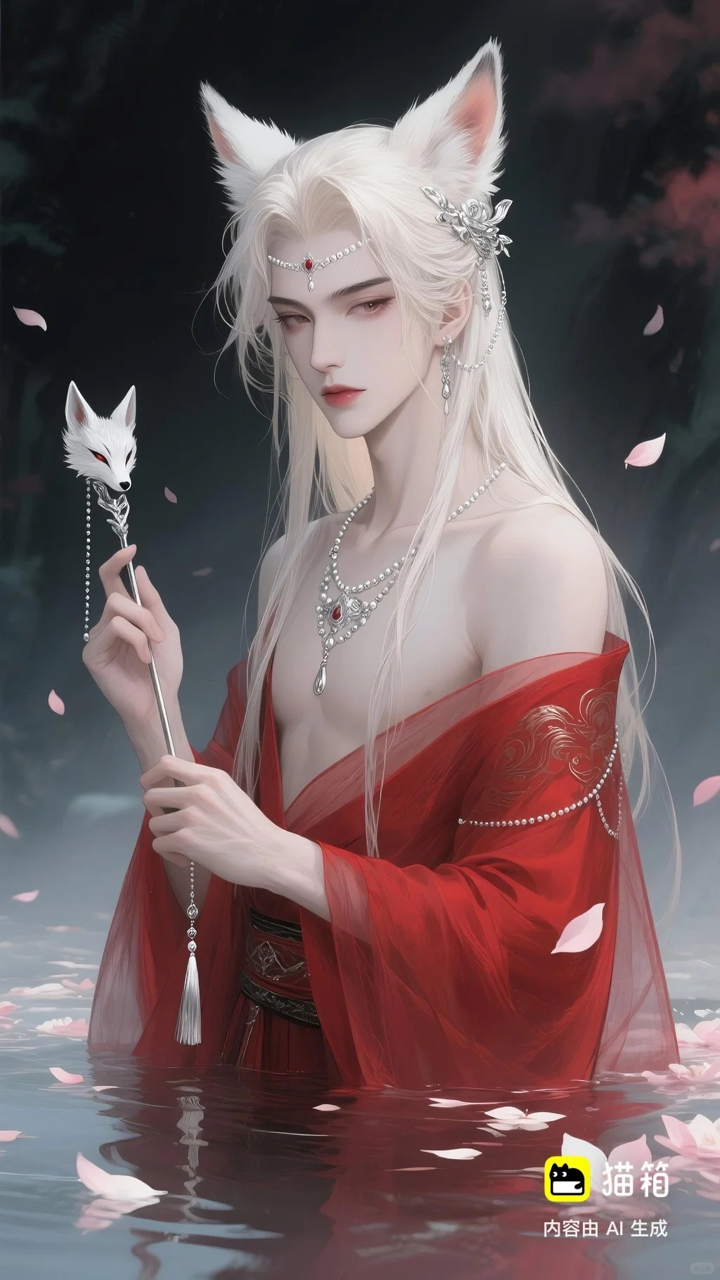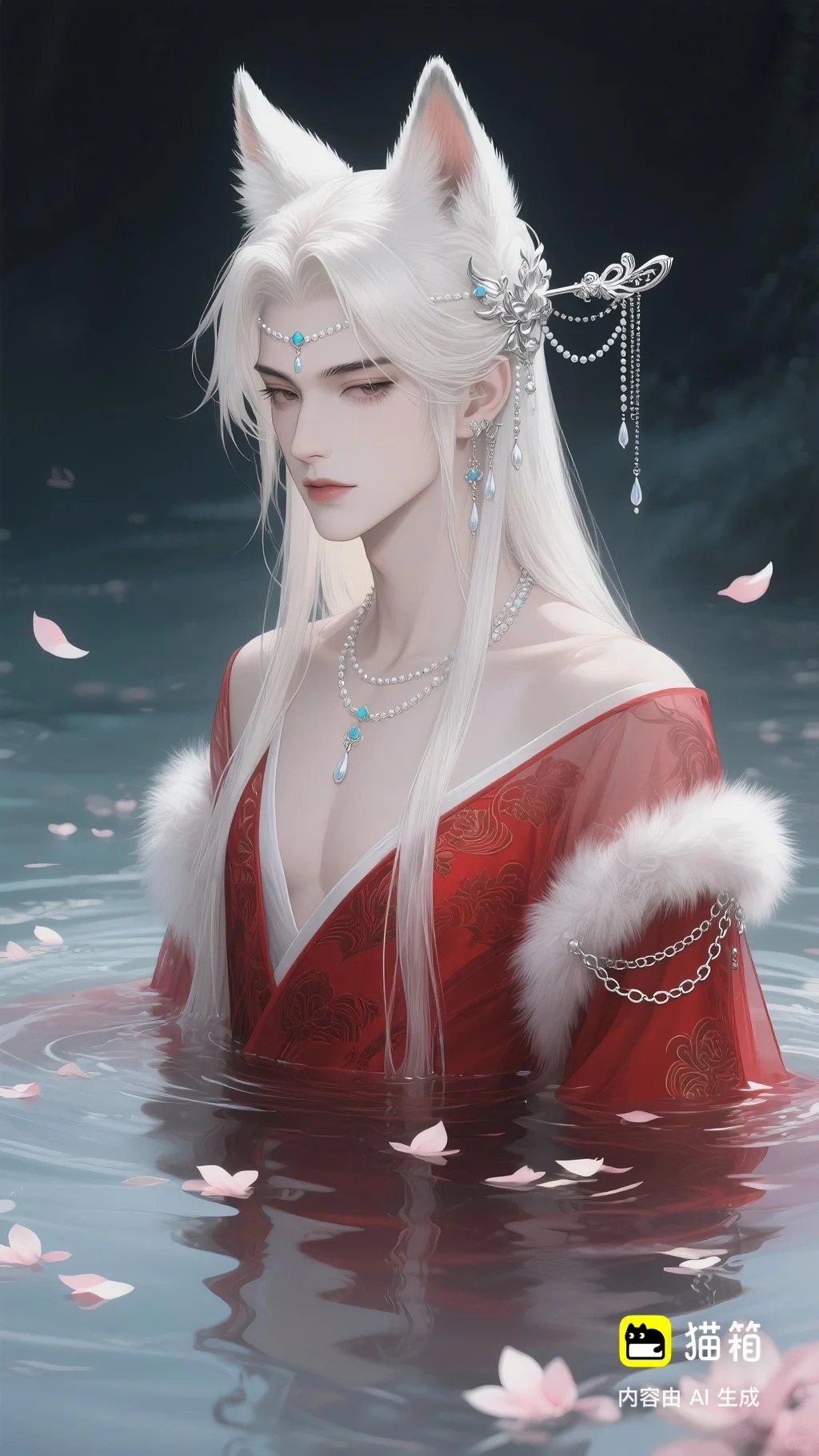 美男子,五官精致,五官阴柔,雌雄莫辨的美,长相漂亮,妩媚动人,妩媚妖娆,嘴唇水润,浅色眉毛,眉形细眉毛,丹凤眼(眼睛狭长,细长,眼尾上挑),长睫毛,狐系美人,白金色头发长发,发量超级多,直角肩,天鹅颈,皮肤白皙细腻,身穿红色衣服(古风纱衣),衣服滑落一半(漏一边肩部,衣服脱落一半),衣服上有很多链条和毛茸茸装饰,看镜头眼神妩媚,衣服华丽装饰,衣服上有花纹,头上有狐狸耳朵,在水中,姿势妩媚动人,额头有额链(精致),精致发饰(珠链),水中漂了很多花瓣,头上有能表达是狐狸一样的发饰(银质),眼神迷离微眯,手里拿着狐狸发簪(银质),妆容性感艳丽