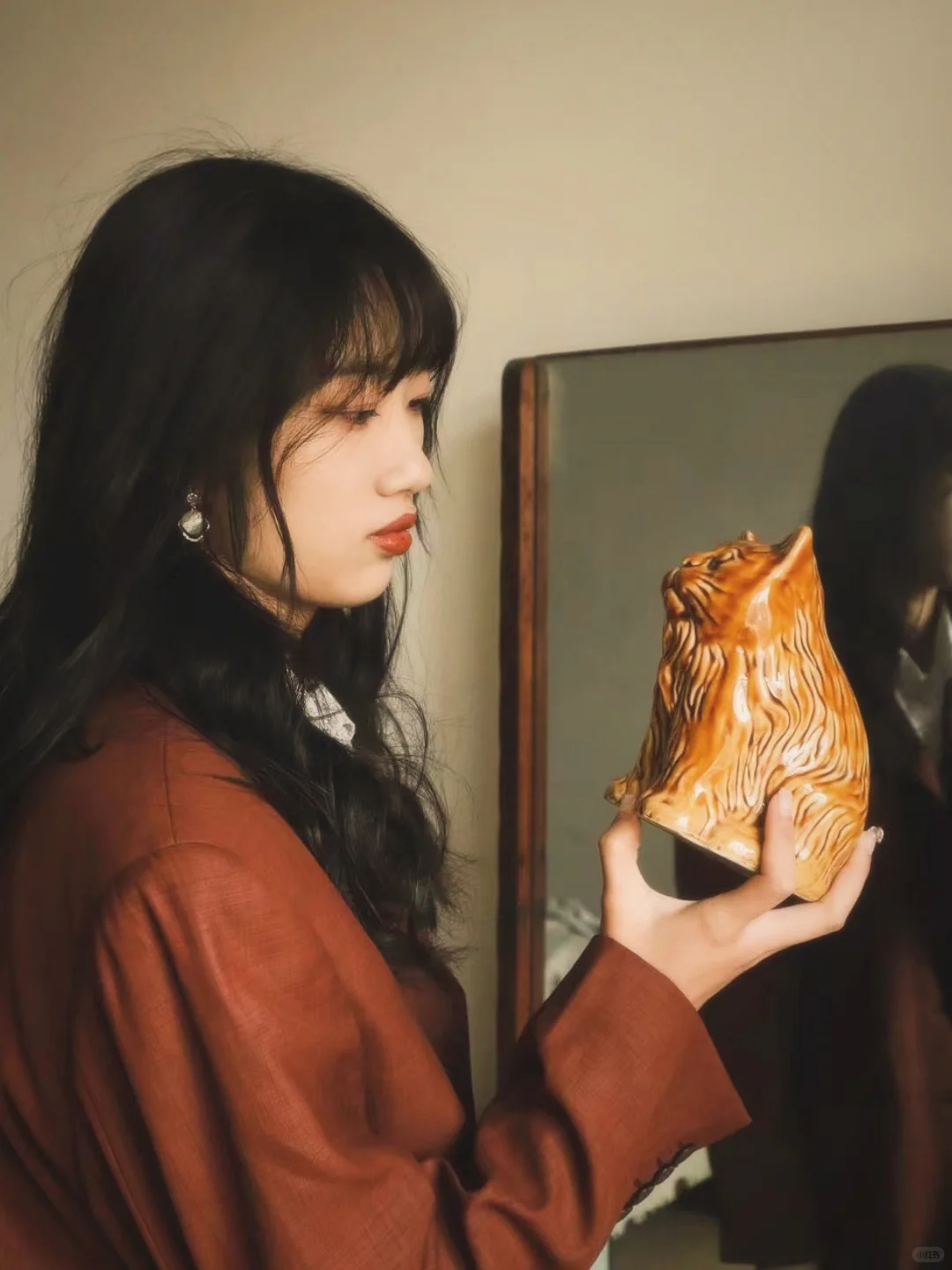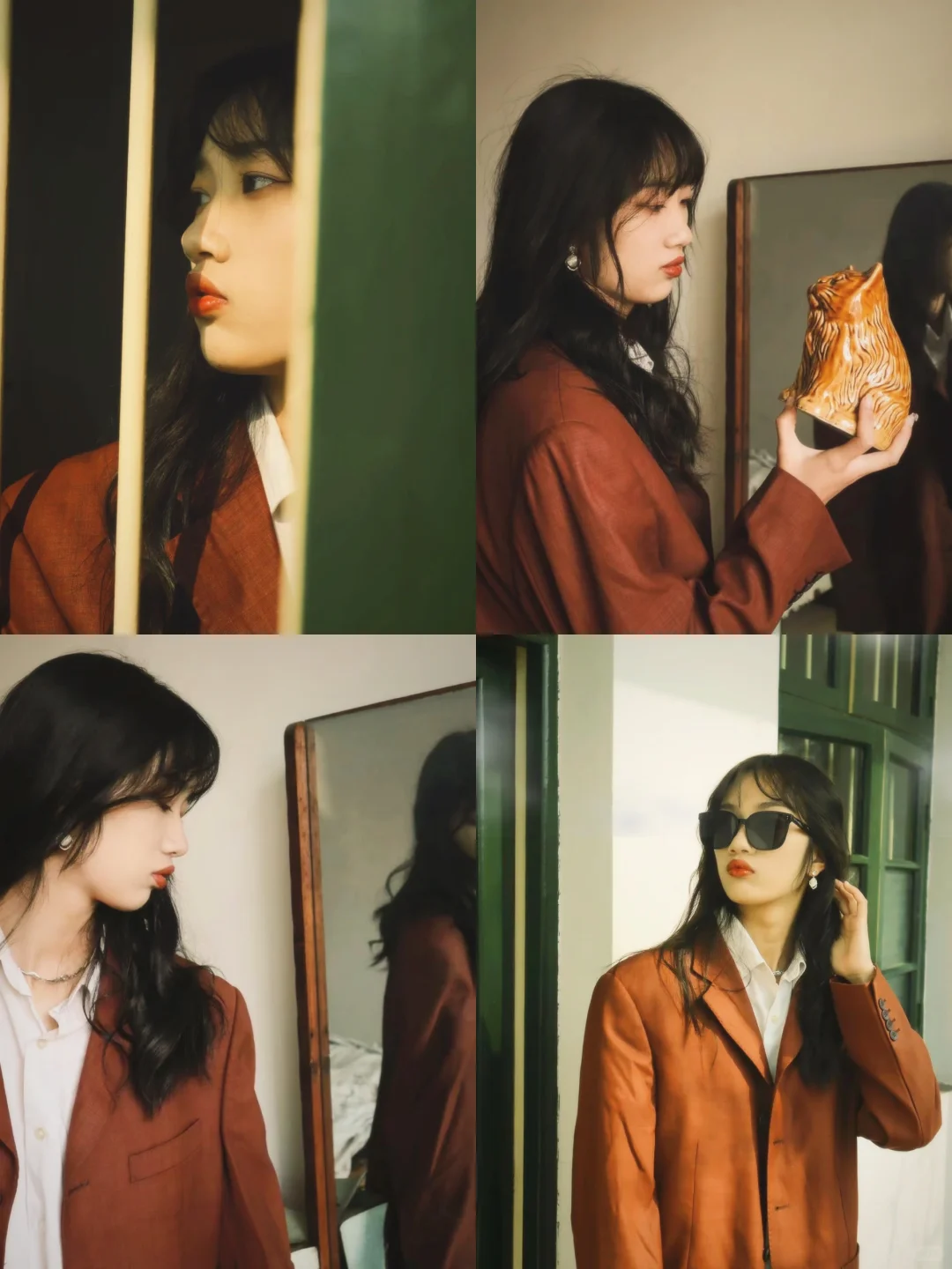 选择了老家作为拍摄地,年代感的镜子、苔绿的窗台,仿佛自带滤镜。后期调成暖色调,让照片更有电影质感。