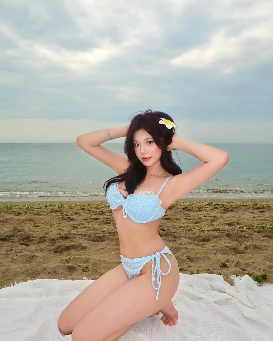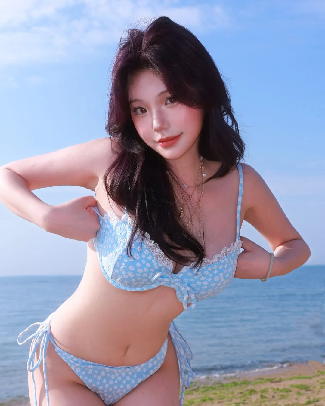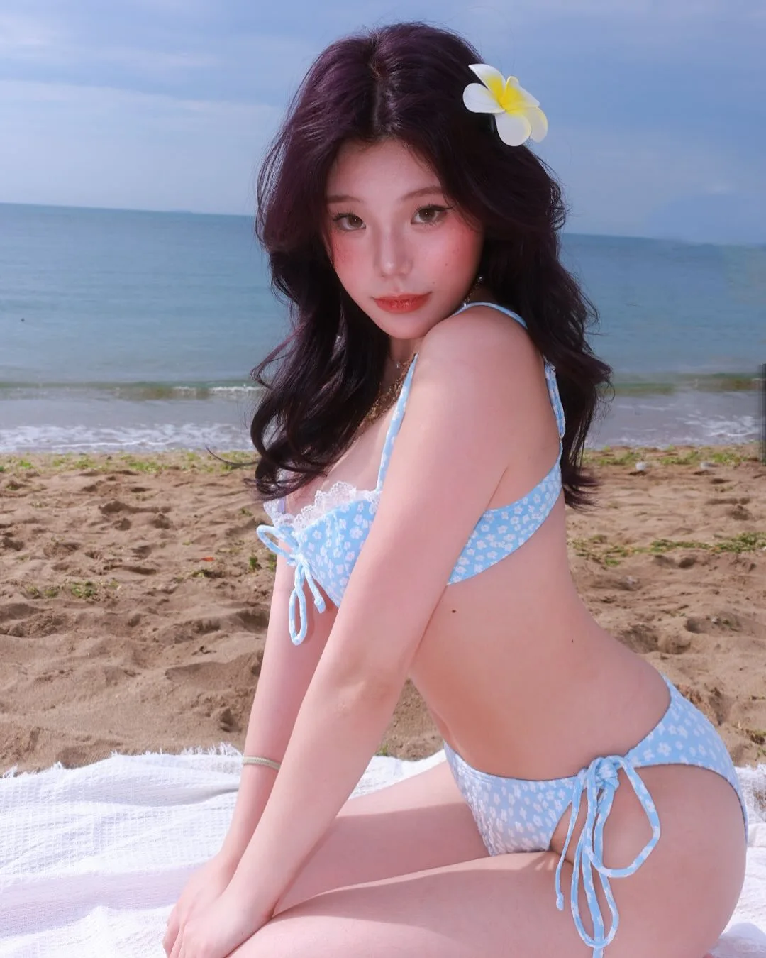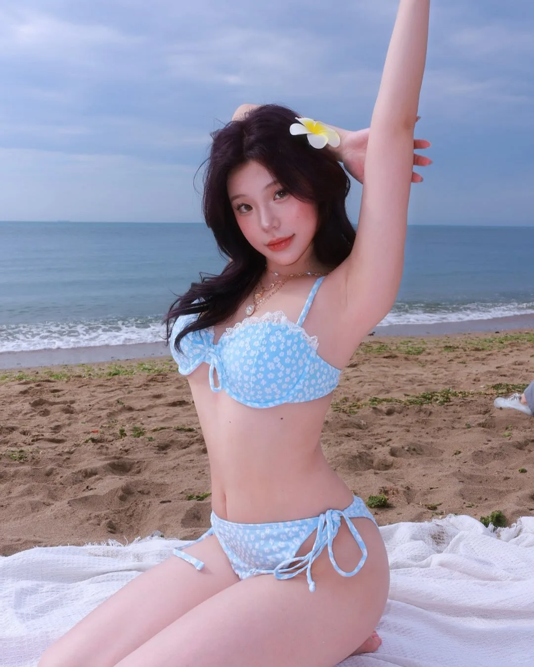 蓝天大海作背景,穿这套浅蓝碎花比基尼,头发别朵小花,整个人都变得温柔又松弛~吹着海风,烦恼都被卷走啦,好爱这种度假的惬意感~✨