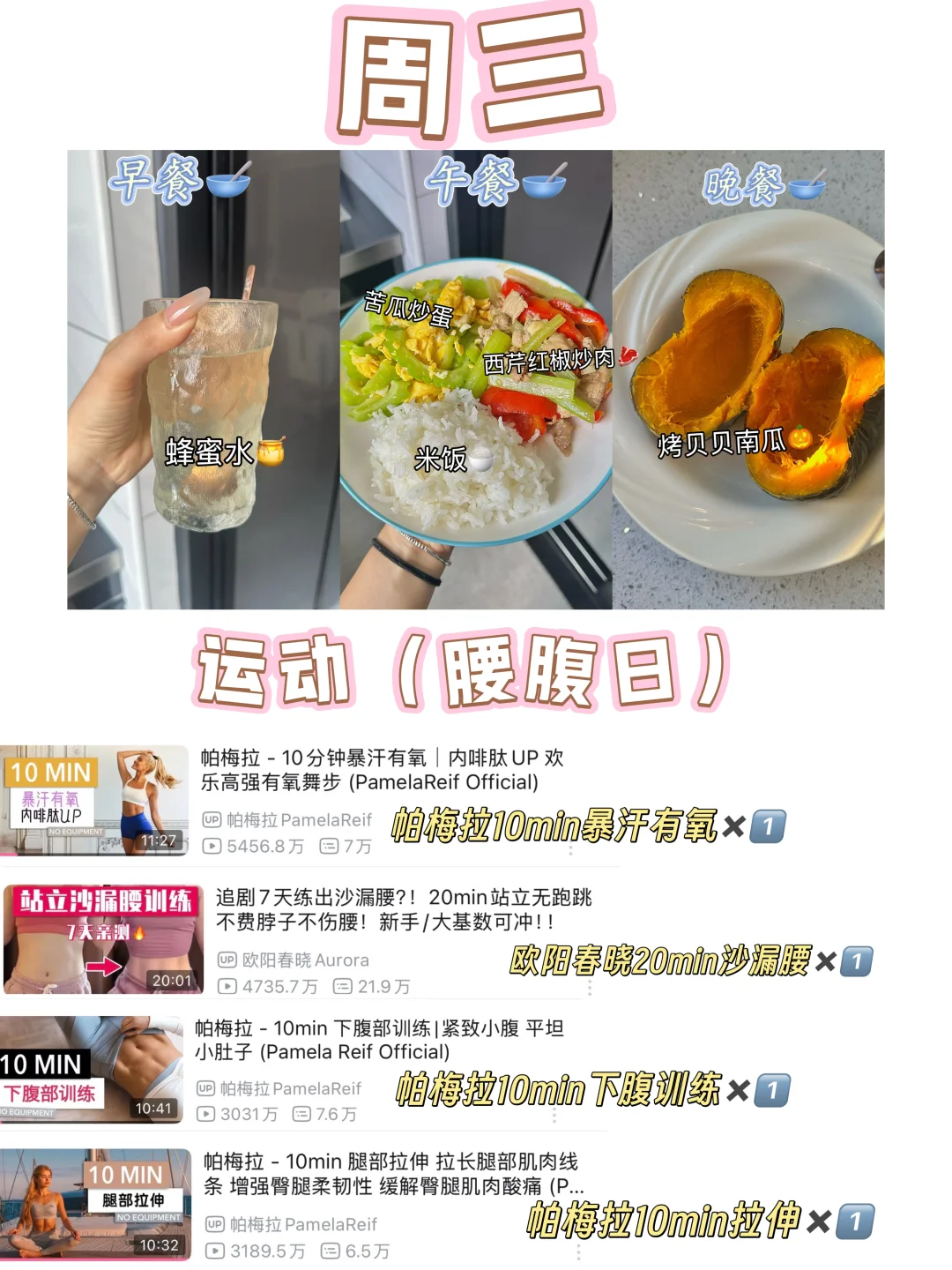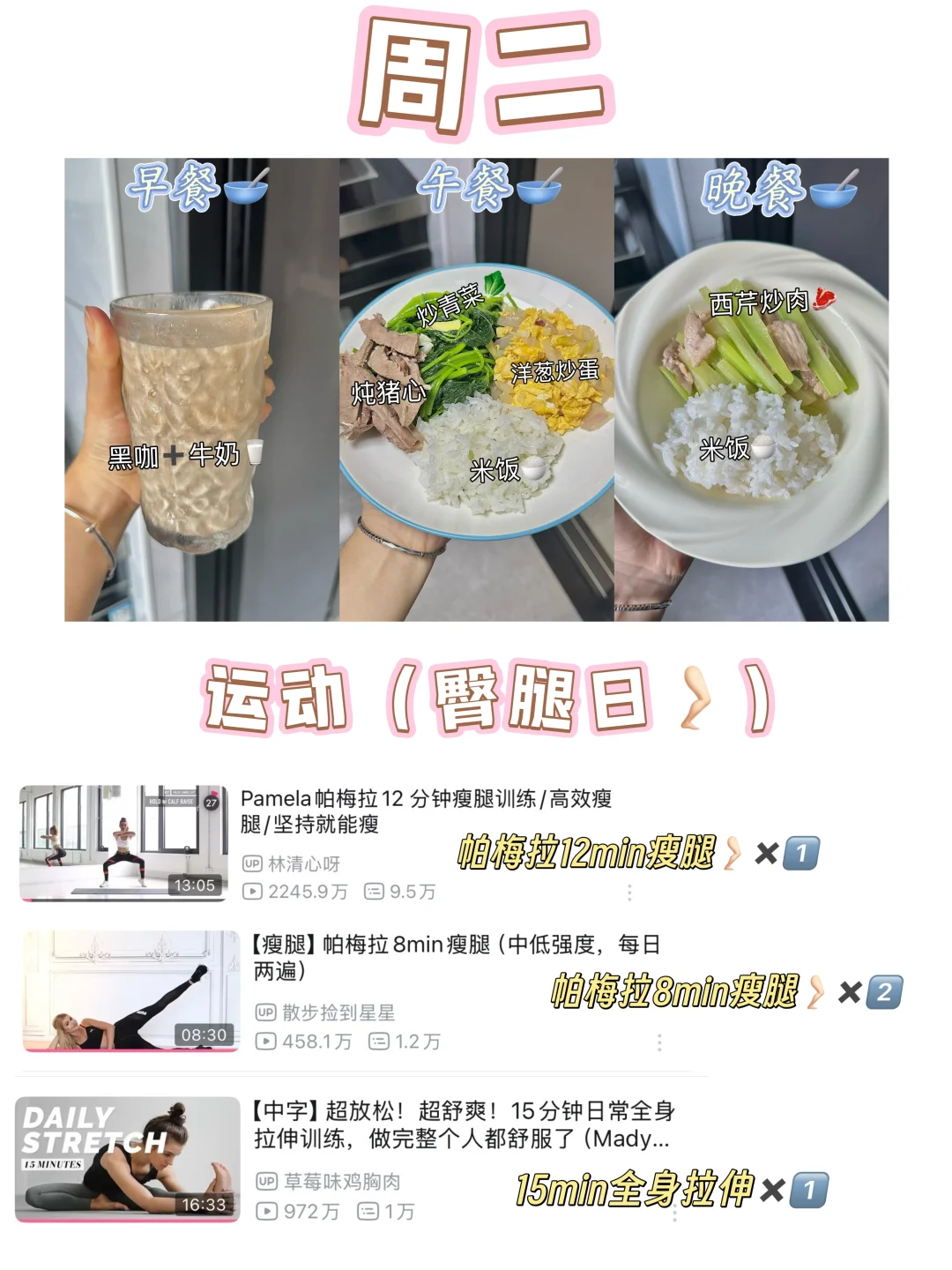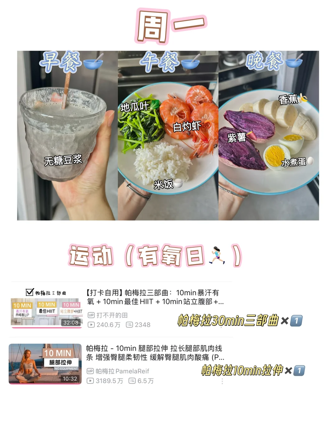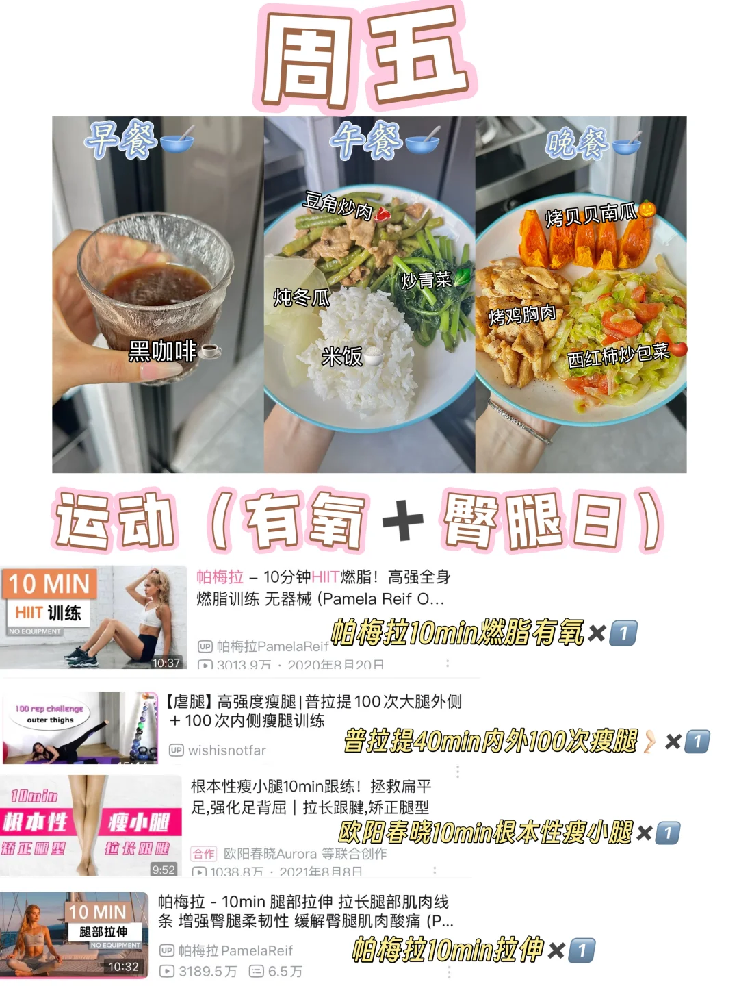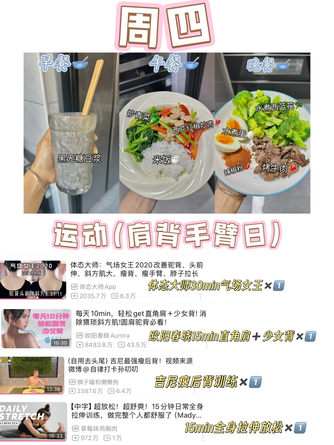这些都是我平时减脂期间吃的和练的,我个人平时因为作息问题所以基本没有吃早餐,就是起床喝一杯黑咖啡,无糖豆浆 ,蜂蜜水或者牛奶就好了,姐妹们平时如果有吃早餐的话正常吃就好,选择优质碳水➕蛋白质➕膳食纤维合理搭配就OK👌🏻