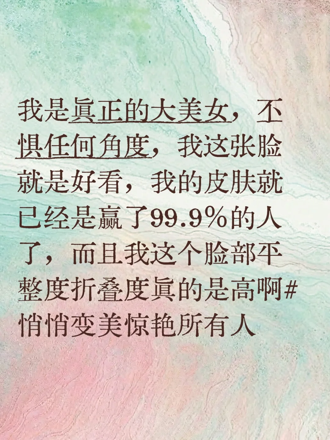 我是真正的大美女,不惧任何角度,我这张脸就是好看,我的皮肤就已经是赢了99.9%的人了,而且我这个脸部平整度折叠度真的是高啊#悄悄变美惊艳所有人