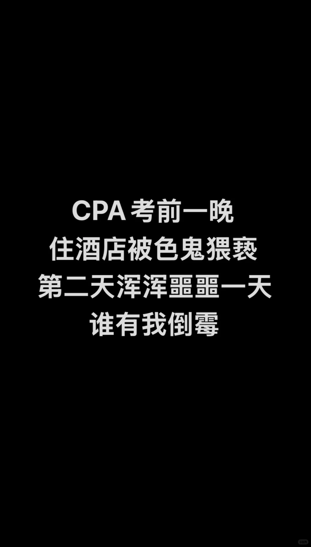 第二天起来想起来还看看手有没有印子啥的 考试就浑浑噩噩的 整个大脑都是空白 睡不好 还巨倒霉!倒霉一天!我真的服了 谁能有我倒霉 你妈骗的不行来强的 我特喵准备了这么久的cpa 天天学七八个小时坐的我肚子和痔疮都出来了 腰都脊柱侧弯了 结果考前一晚来这出 我咋没抽死他!!!#cpa备考 #住酒店遇鬼 #打鬼