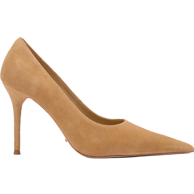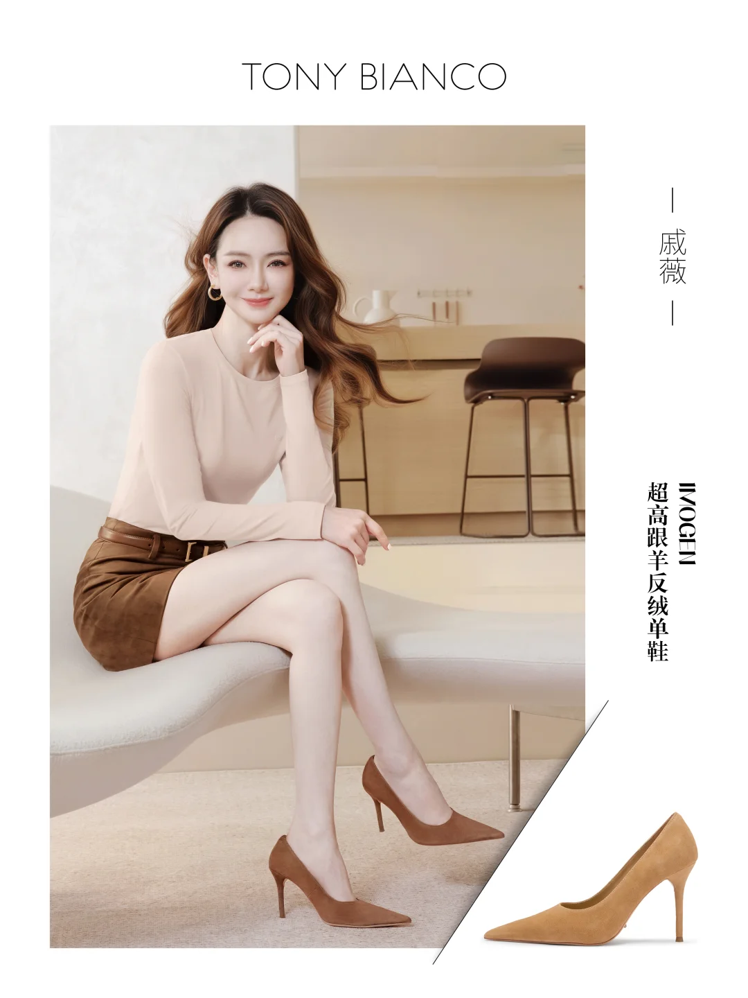 简约上衣与棕色短裙搭配羊反绒高跟鞋,