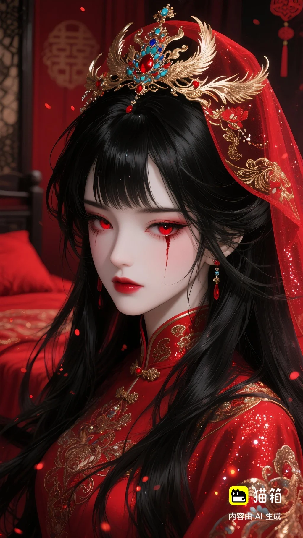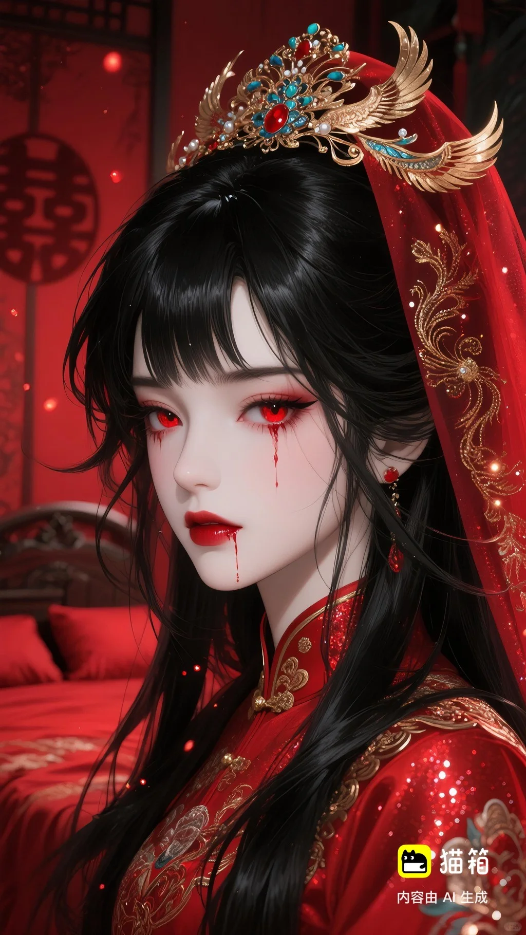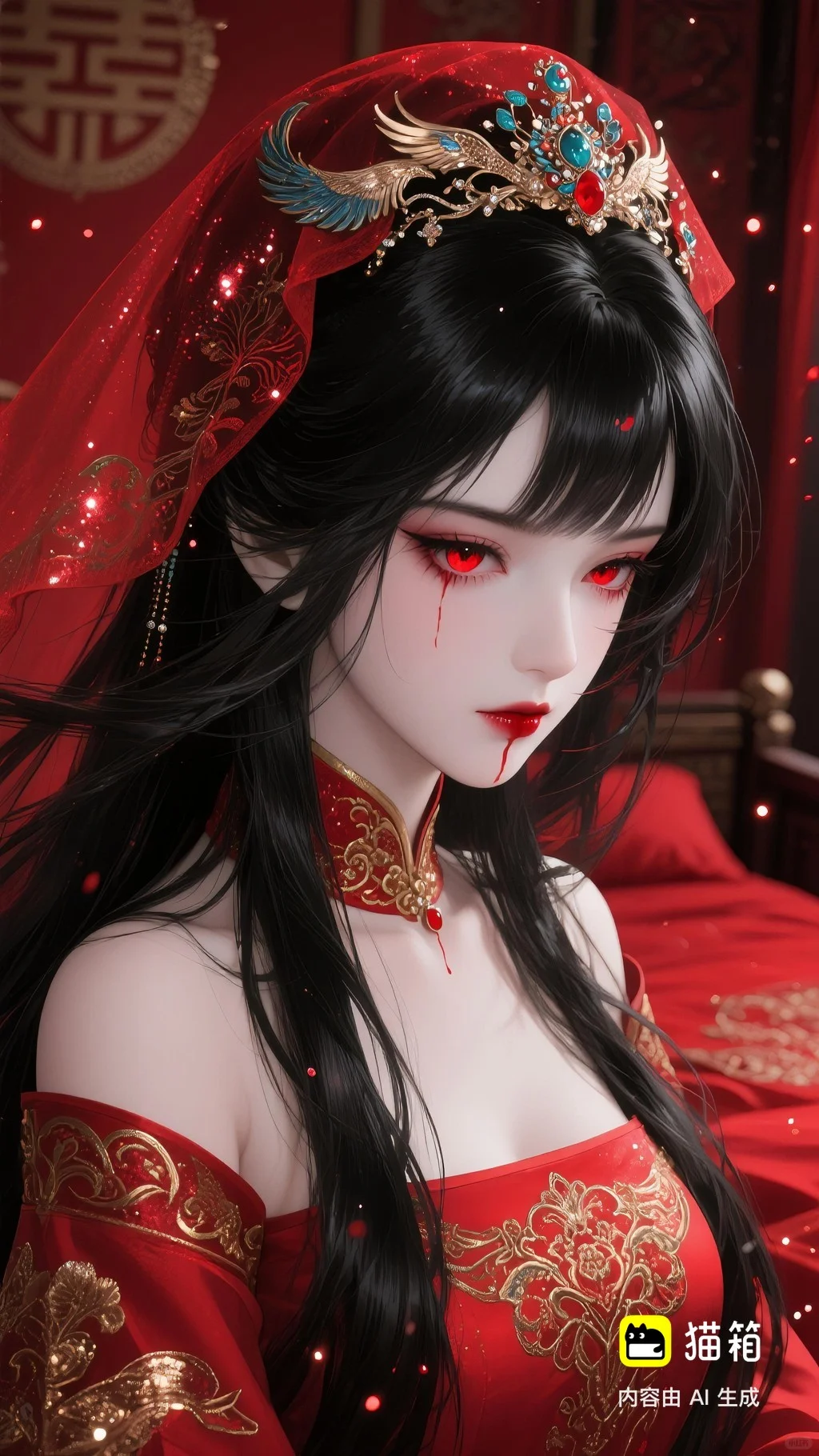 奇幻特效,血色背景。惊悚中式温馨氛围,喜房红床