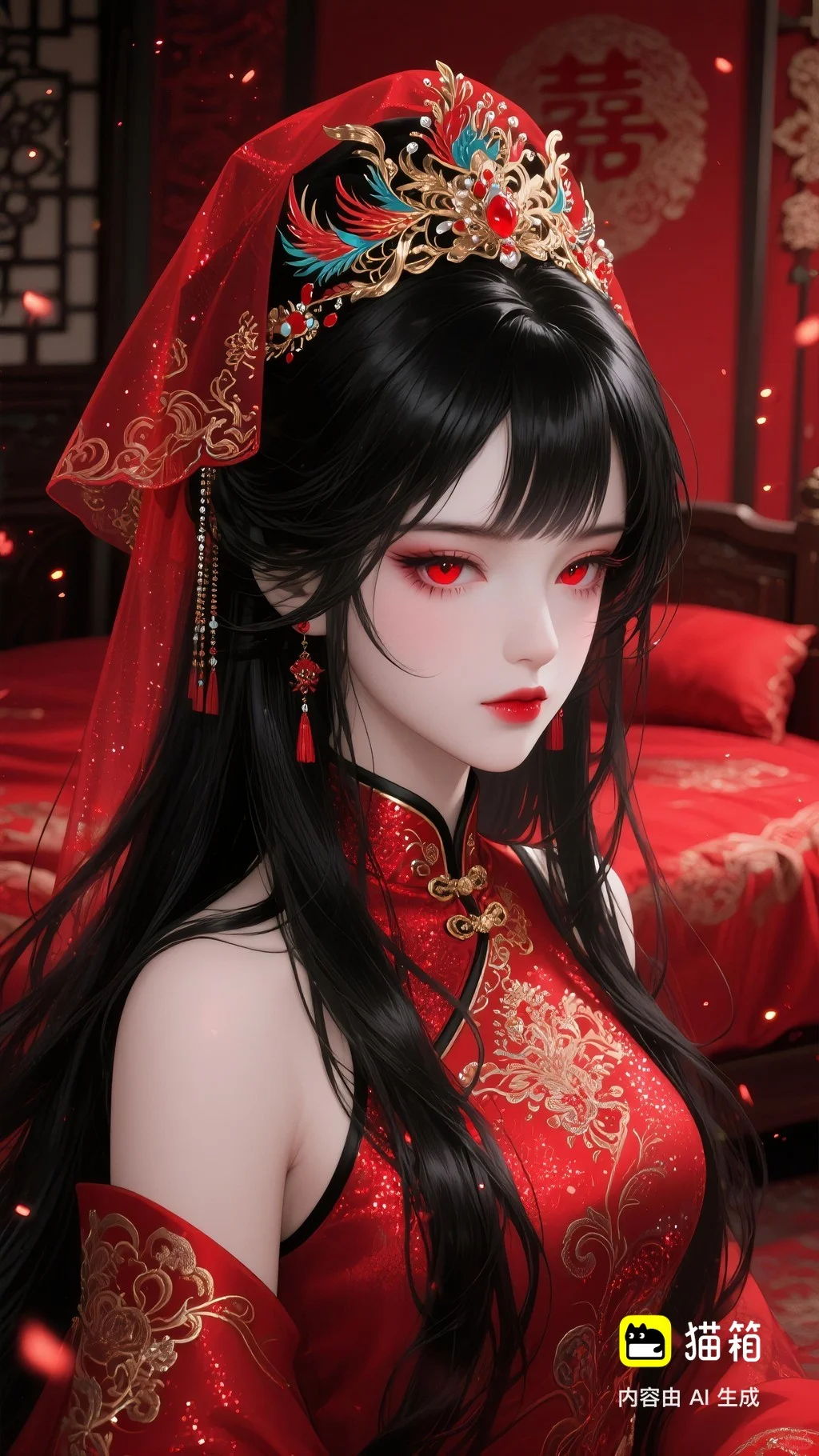 奇幻特效,血色背景。惊悚中式氛围,喜房红床,惨白肤色,鬼气环身,阴森诡异背景。