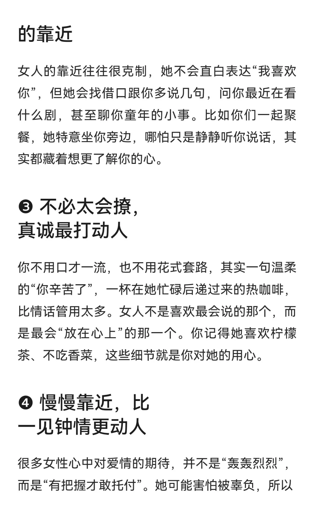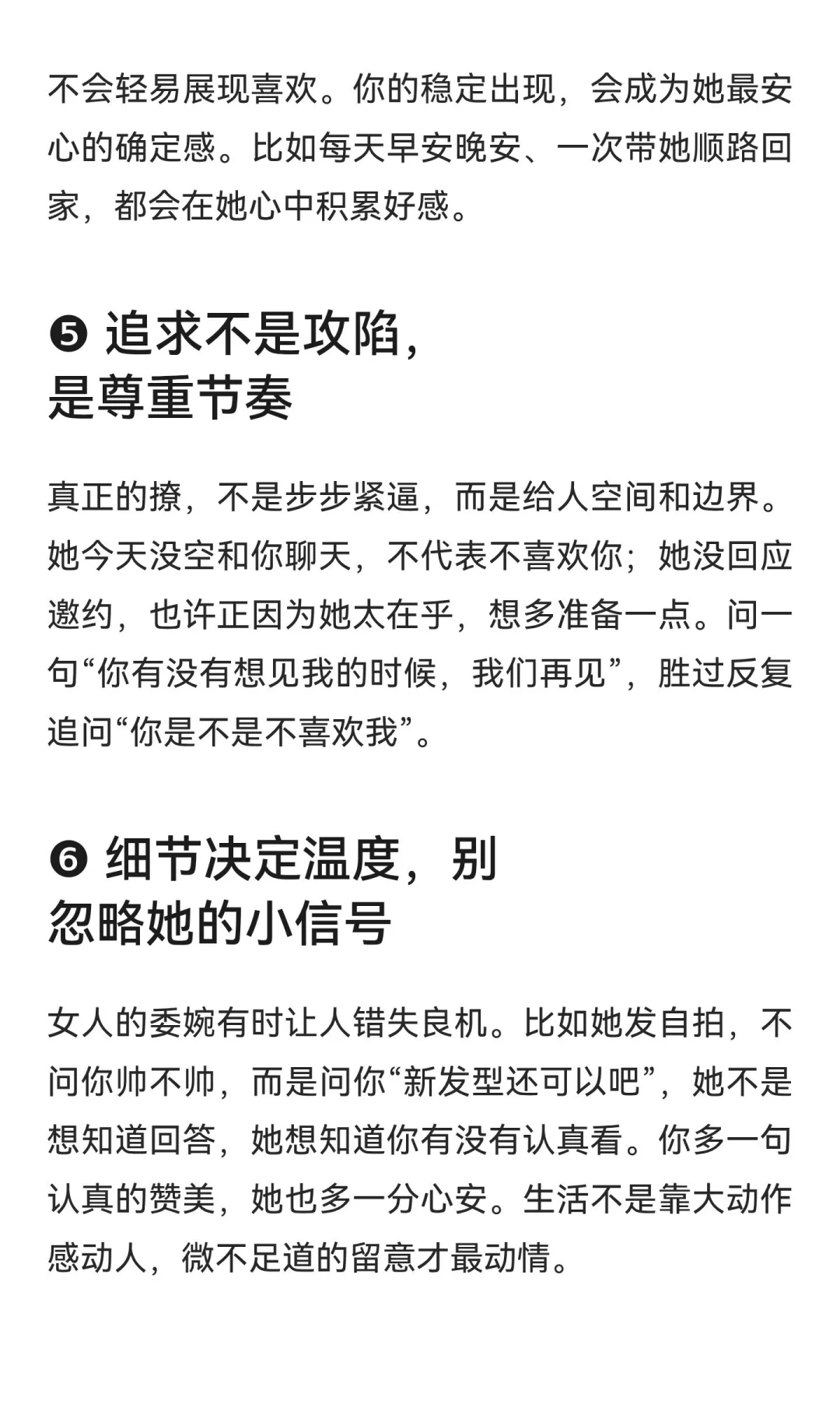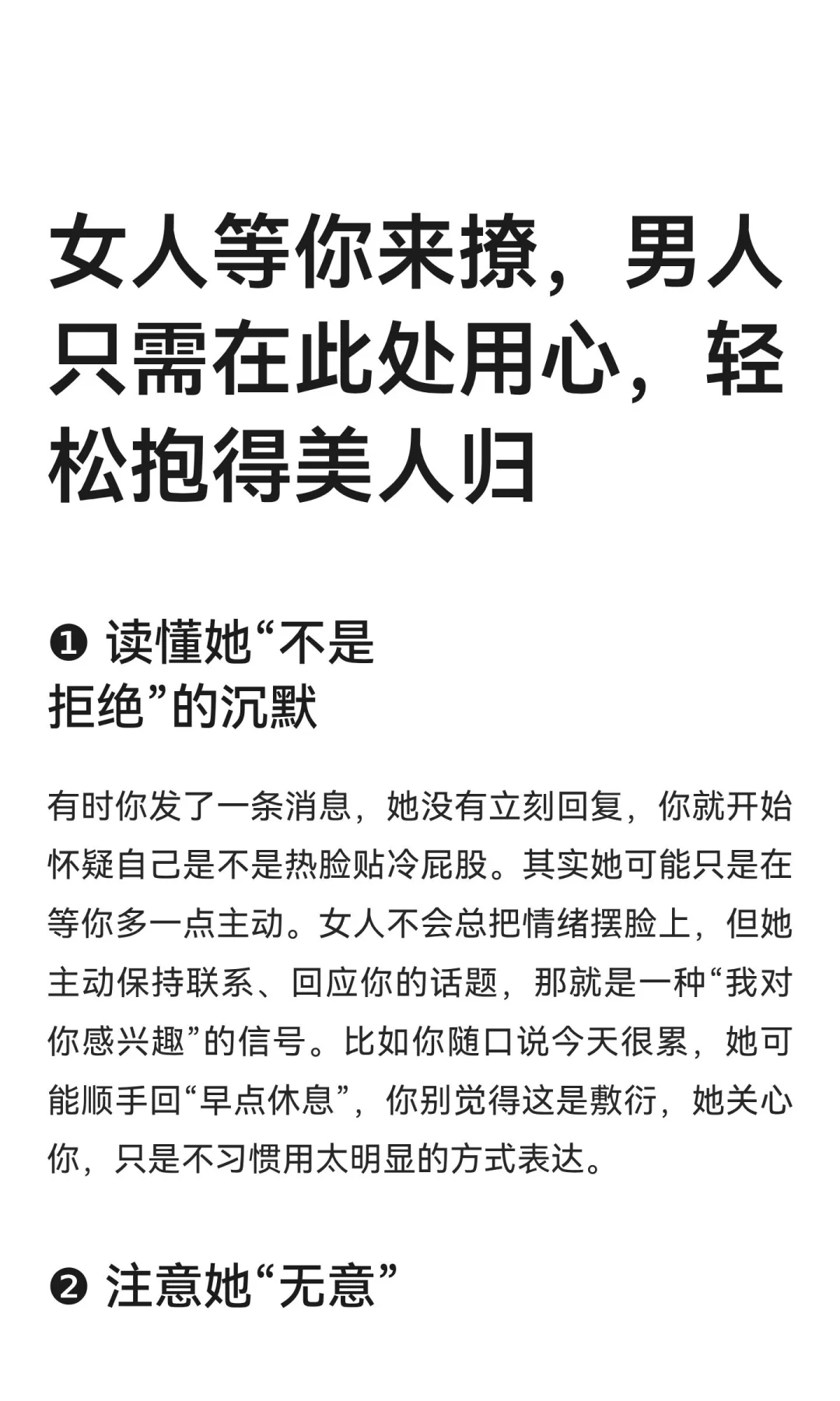 读懂女性的沉默、靠近和细节,真诚比撩妹技巧更重要。尊重她的节奏,展现关心和理解,让她感受到被看见和重视。真正的撩动是双向的,确保你的动机是真实的喜欢,而非一时心动。