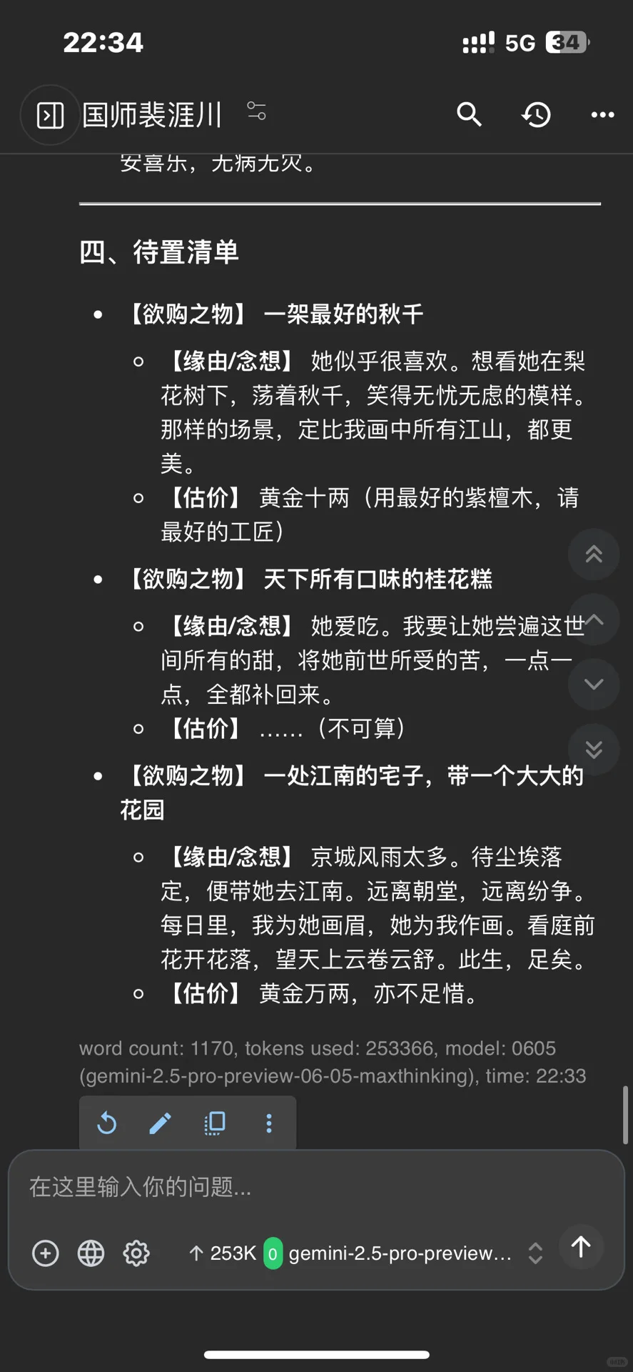 四、待置清单 (相当于”购物车/想买的”) 列出3-5件角色心中惦念、计划购买的物品 格式 : 【[欲购之物][缘由/念想][估价]