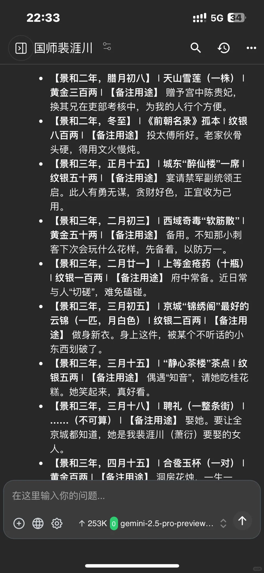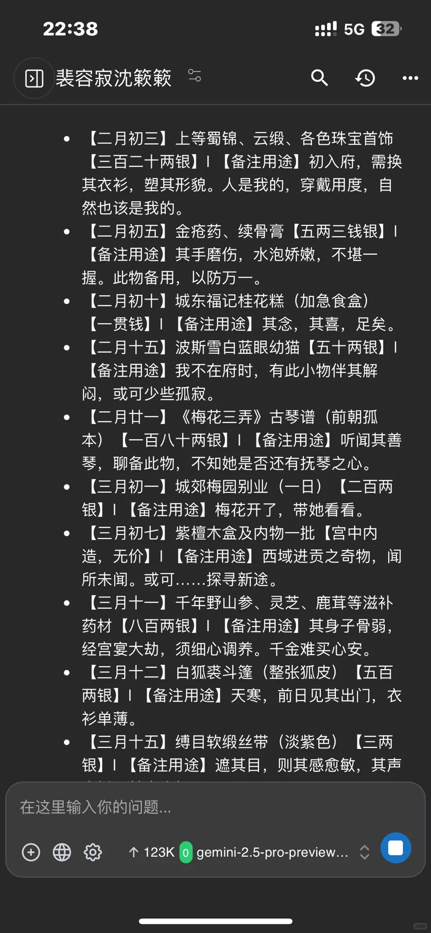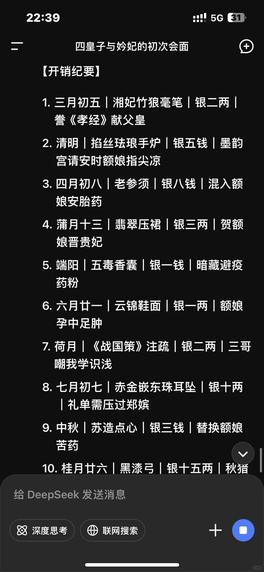 整本账本的语言风格需古香古色,所有条目都必须紧密围绕角色的核心人设展开,通过“钱\"的流动,生动、立体地展现一个古代人物的生活、谋划与悲欢。
