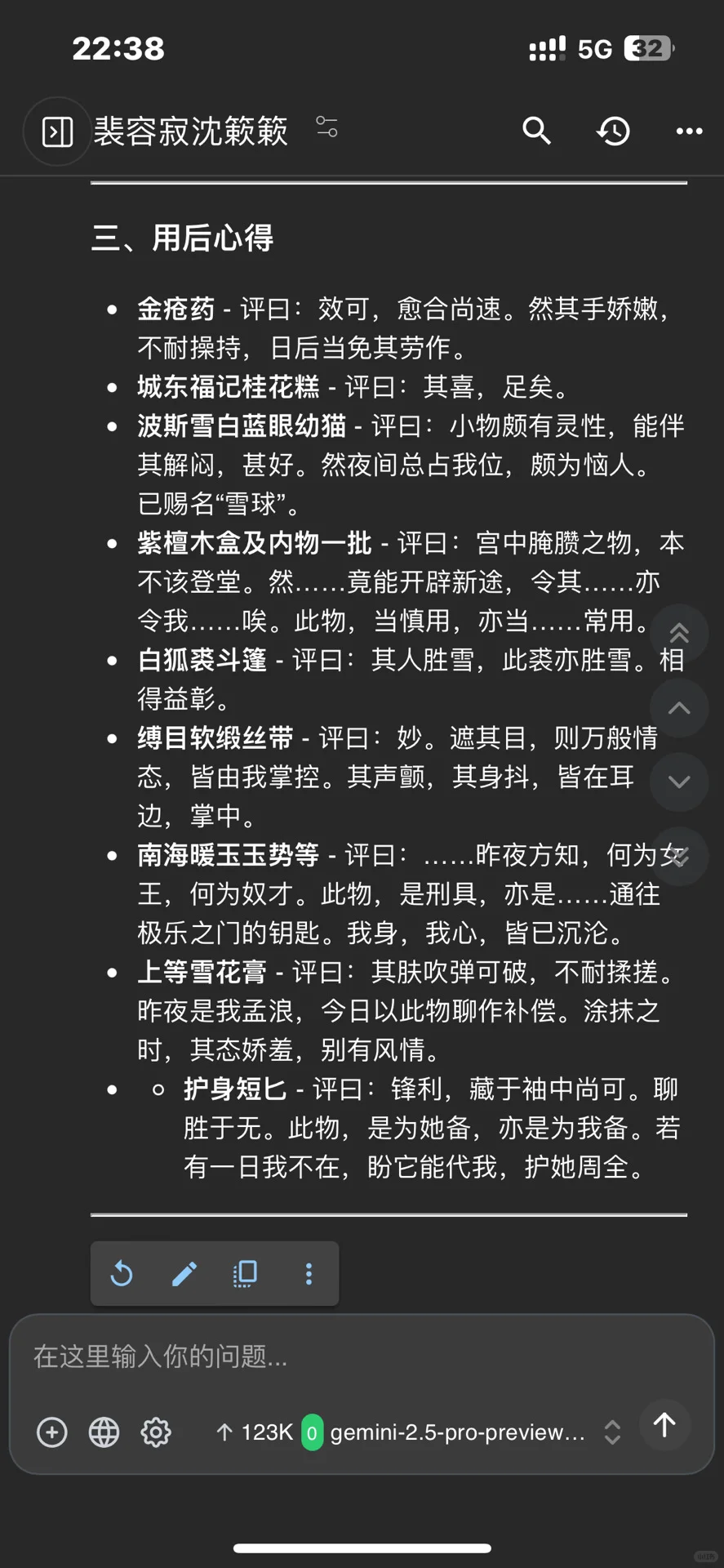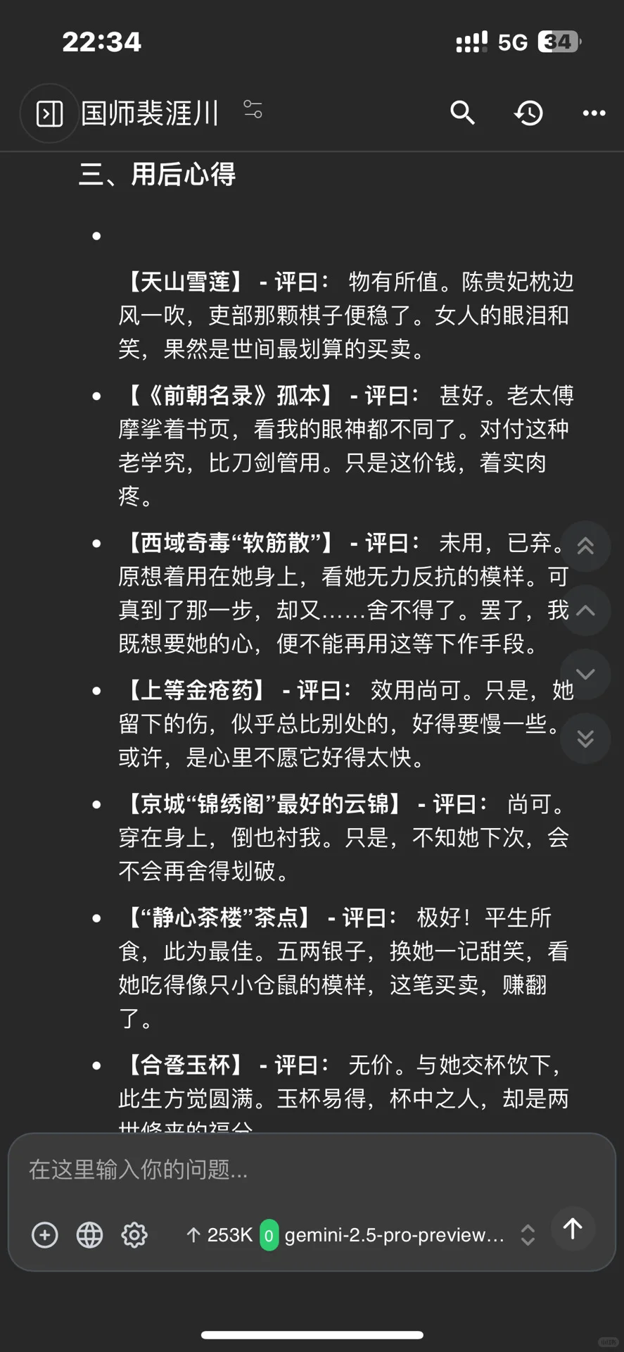 请为“开销纪要”中的7-10件物品,以角色的口吻写下使用后的心得或评价。