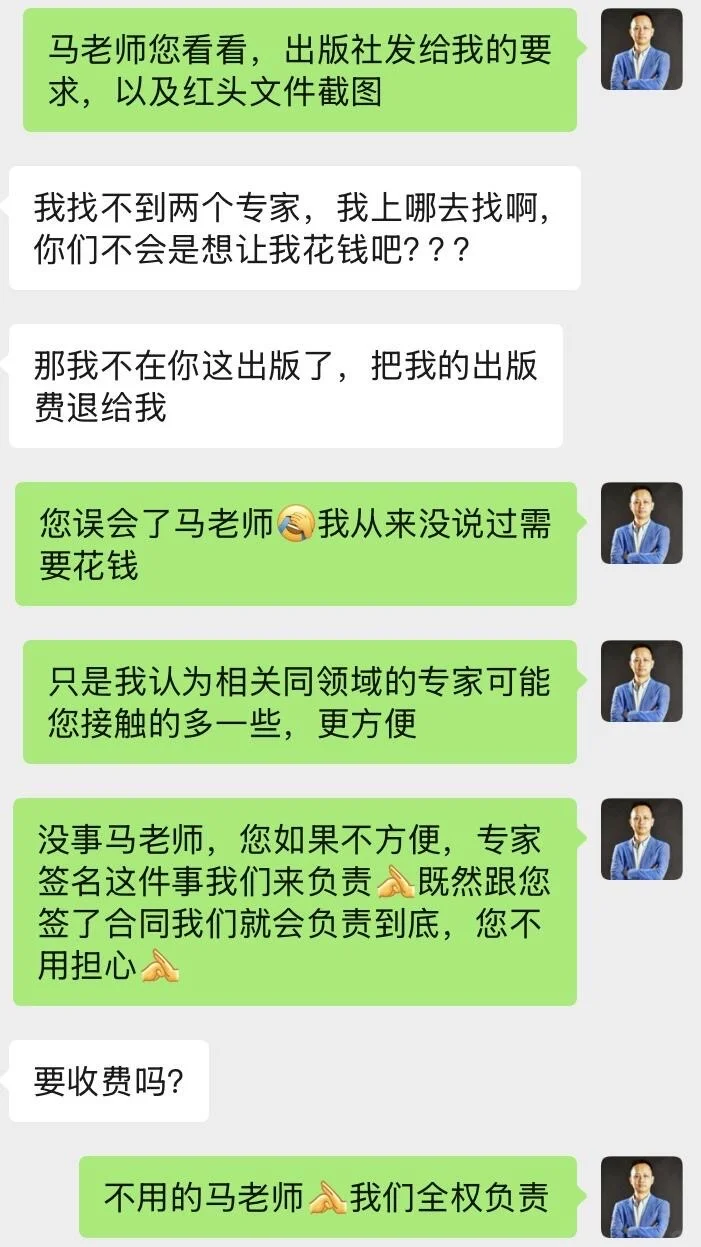 我第一时间告知马老师后,他很惊讶,说“之前怎么没说过”,还表示问了别的出版编辑,对方说没这规定。我只好解释是消息同步不及时,马老师更急了,说找不到专家,怀疑我们想多收费,甚至提出退出版费。我赶忙安抚并承诺负责到底,他的态度才缓和下来。
