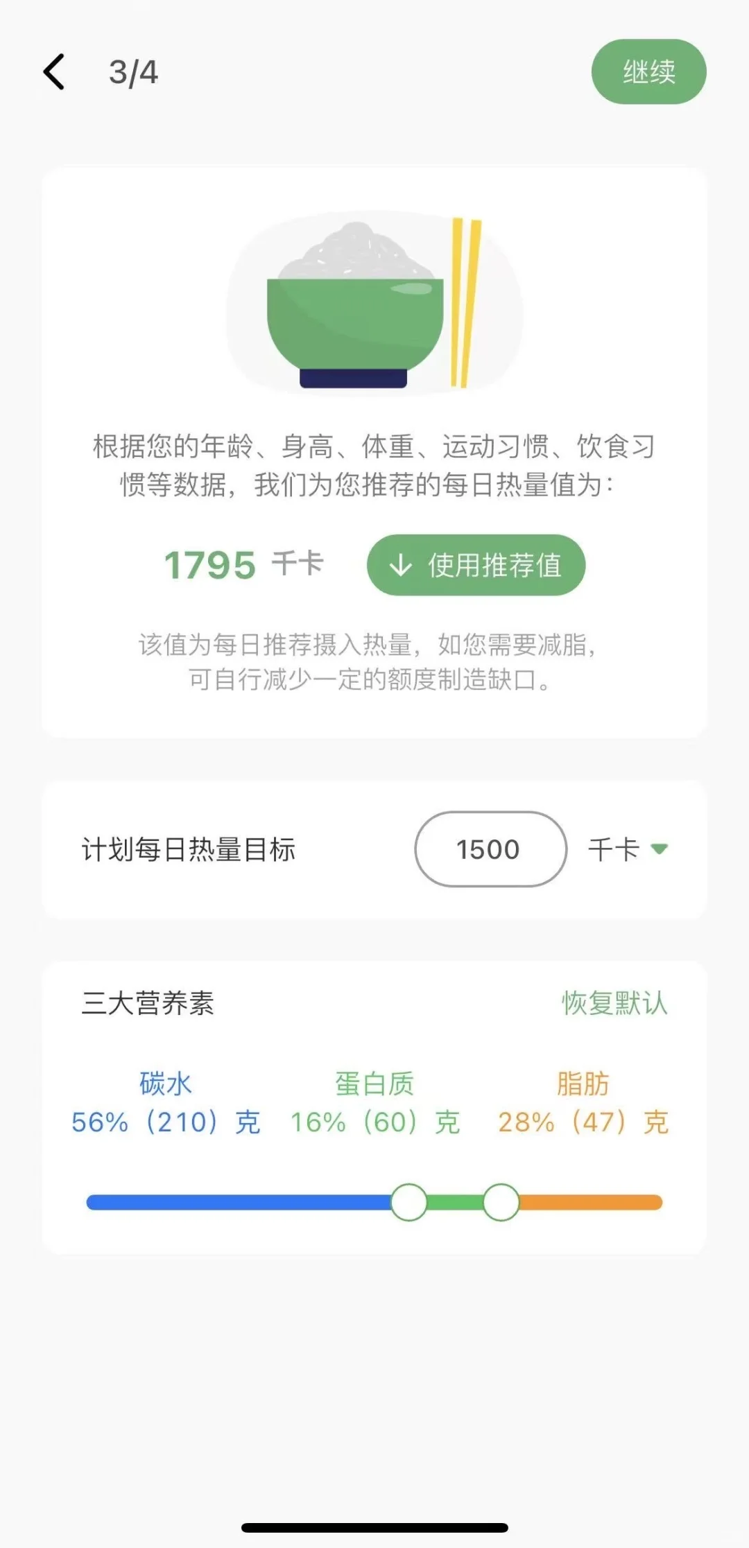 app会根据所填的年龄、身高体重、运动习惯、饮食习惯,推荐每日热量值,这样一来对于每天能吃多少东西心里大致就有数了。而且只要每次吃东西前拍照计算这顿饭的热量值,马上就能知道今天还可以吃多少热量的东西,这对经常嘴馋的我来说算是一个非常实用的功能了~