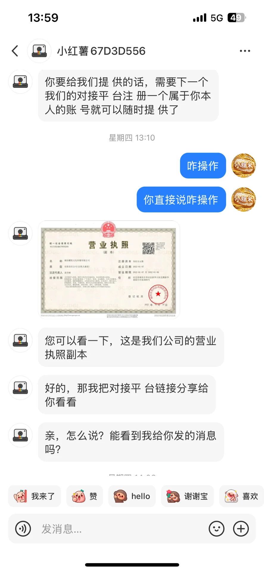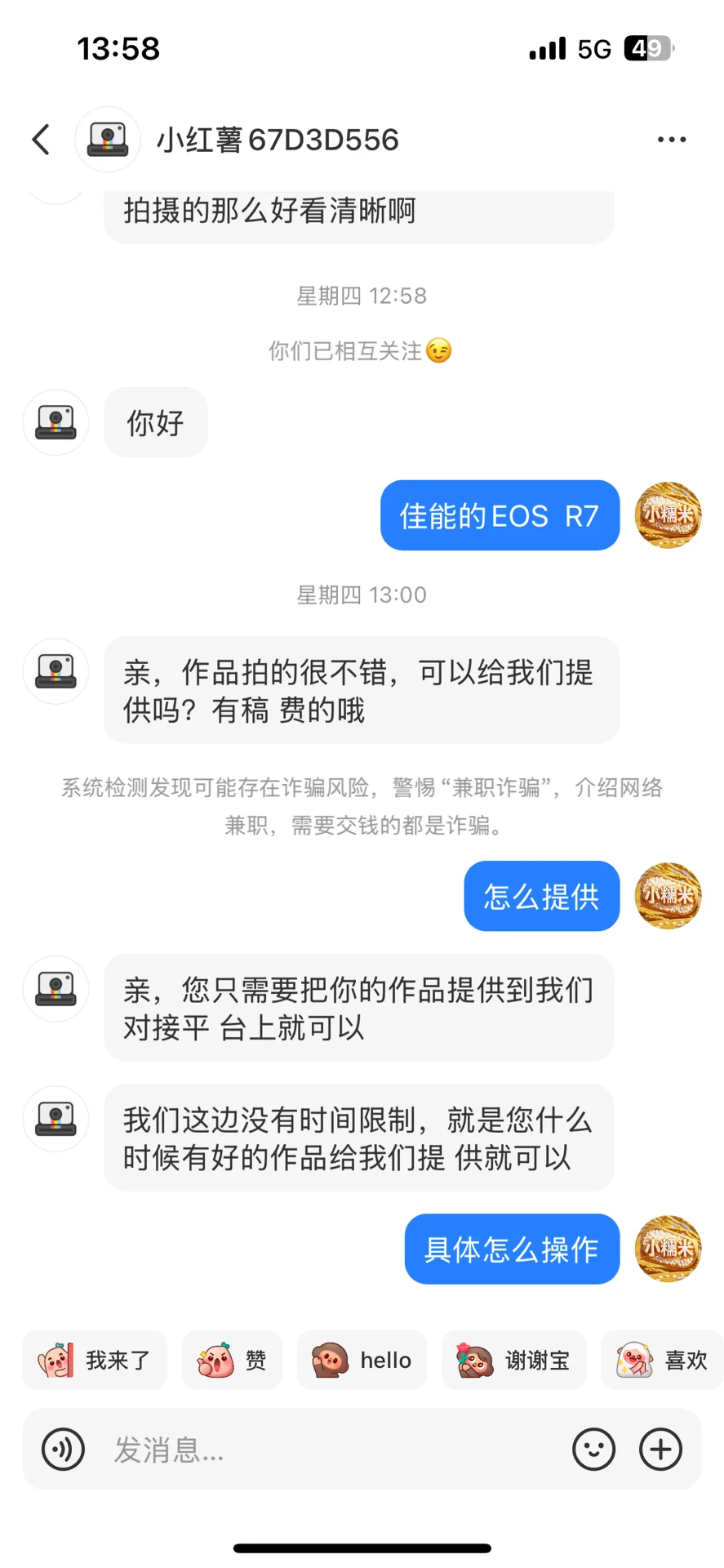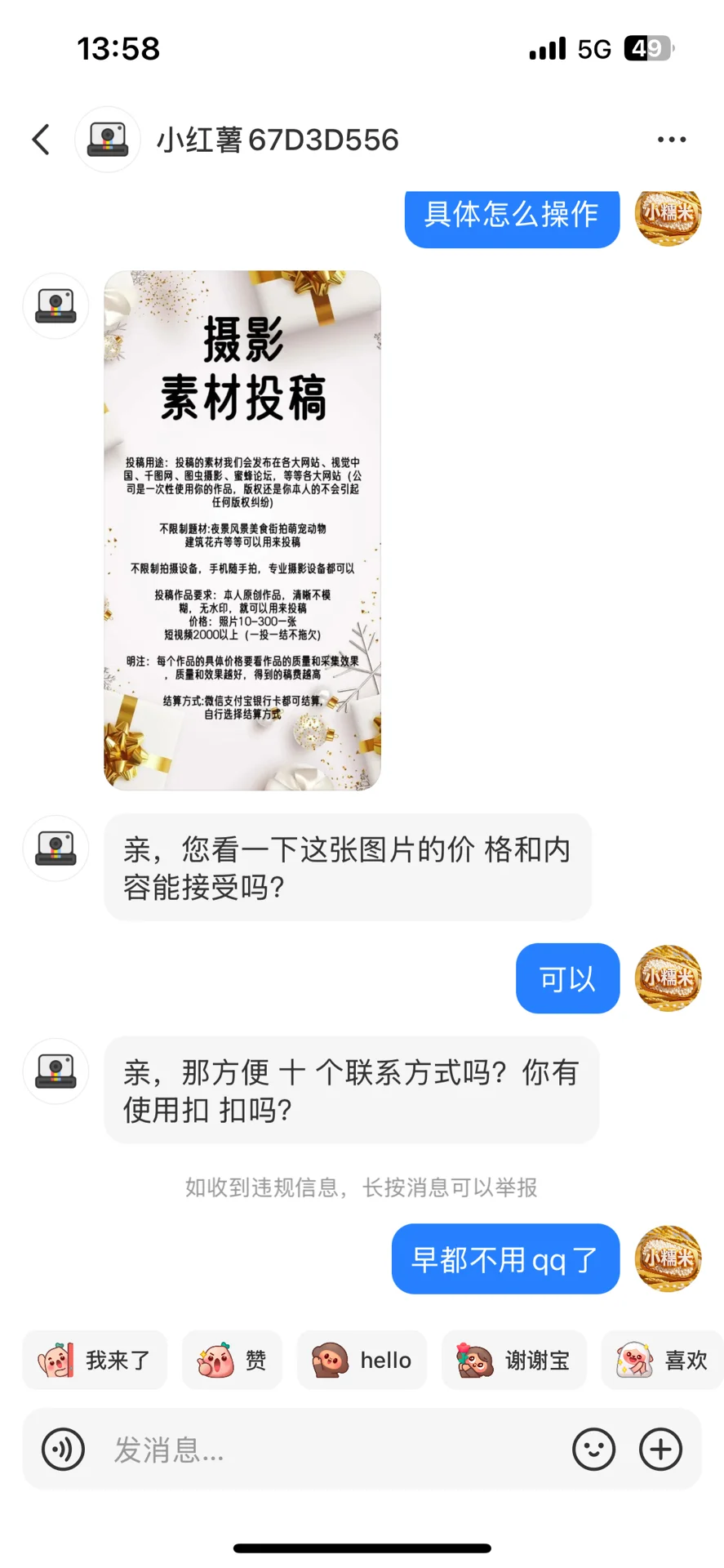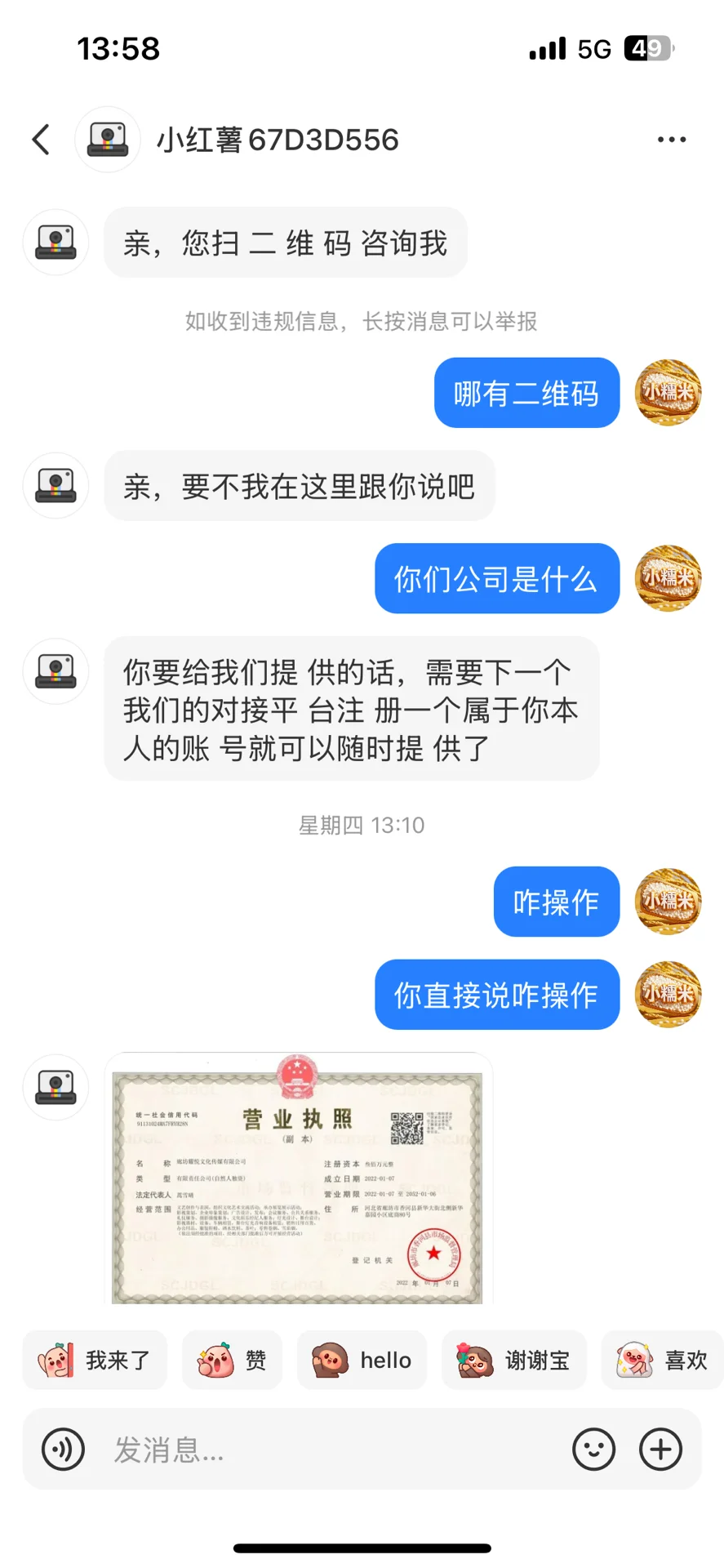 前几天,周末我出去旅游,路上拍了一些风景照。随手我就发了一个小红书。没过多久就有人私信我,问我用什么设备拍的,说我拍的照片清晰好看!然后问我能不能把照片投稿给他们平台,会支付30-300元一张。我就问他怎么操作,结果让我加扣扣,在扣扣上给我发了链接,要下载他们的app。虽然他把他们公司的营业执照发给了我,但是我一听到要加扣扣我就知道是诈骗了,所以我果断举报,结果举报成功还真是诈骗。