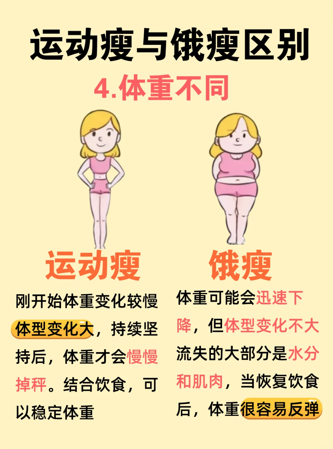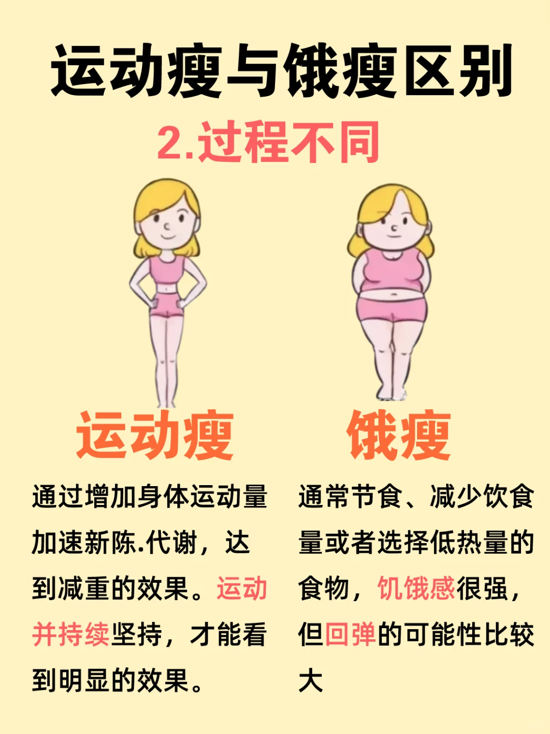 饿瘦:体重可能会迅速下降,但体型变化不大,流失的大部分是水分和肌肉,而不是脂肪,当恢复正常饮食后,体重很容易弹。😣