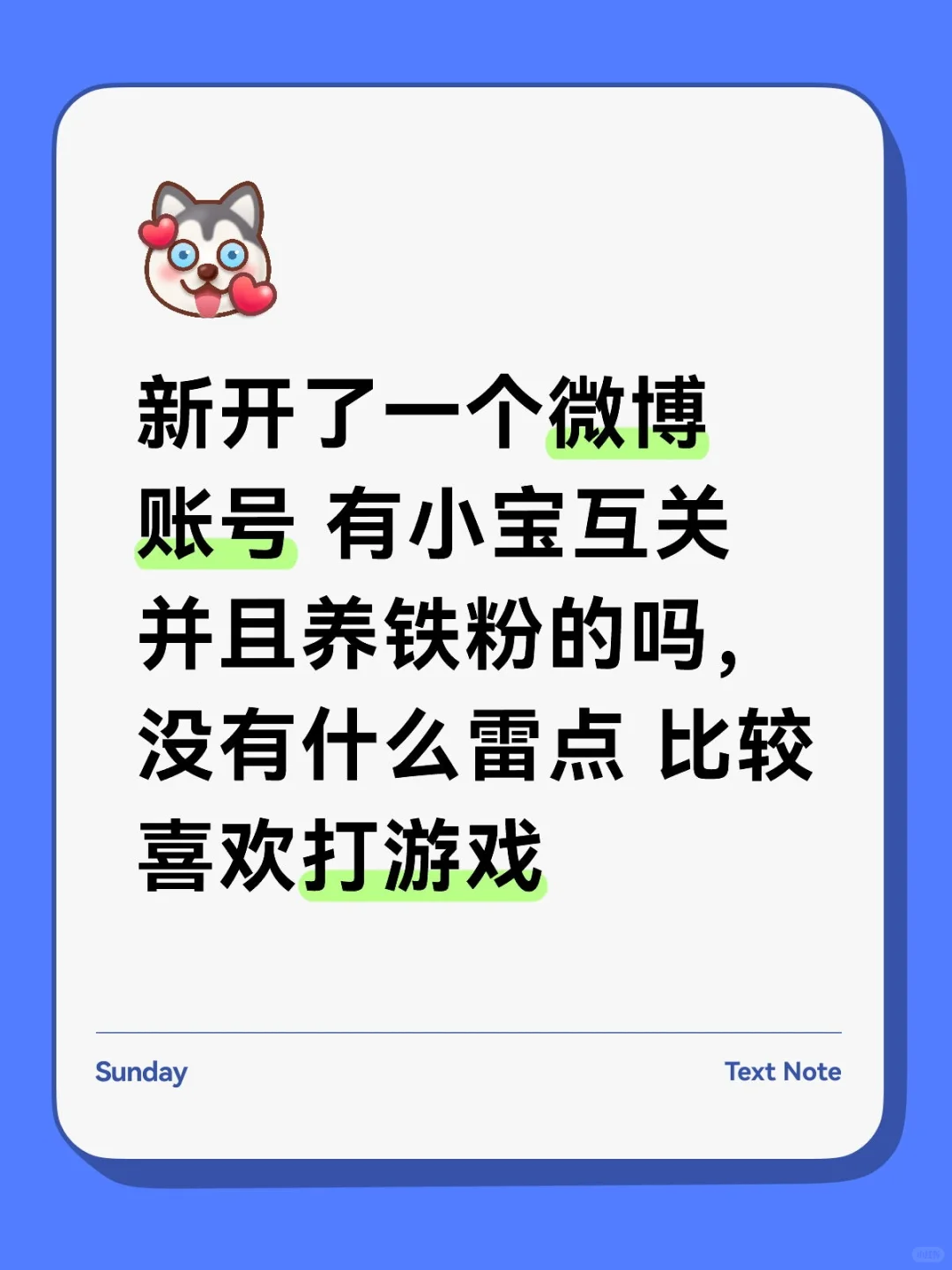 新开了一个微博账号 有小宝互关并且养铁粉的吗,没有什么雷点 比较喜欢打游戏