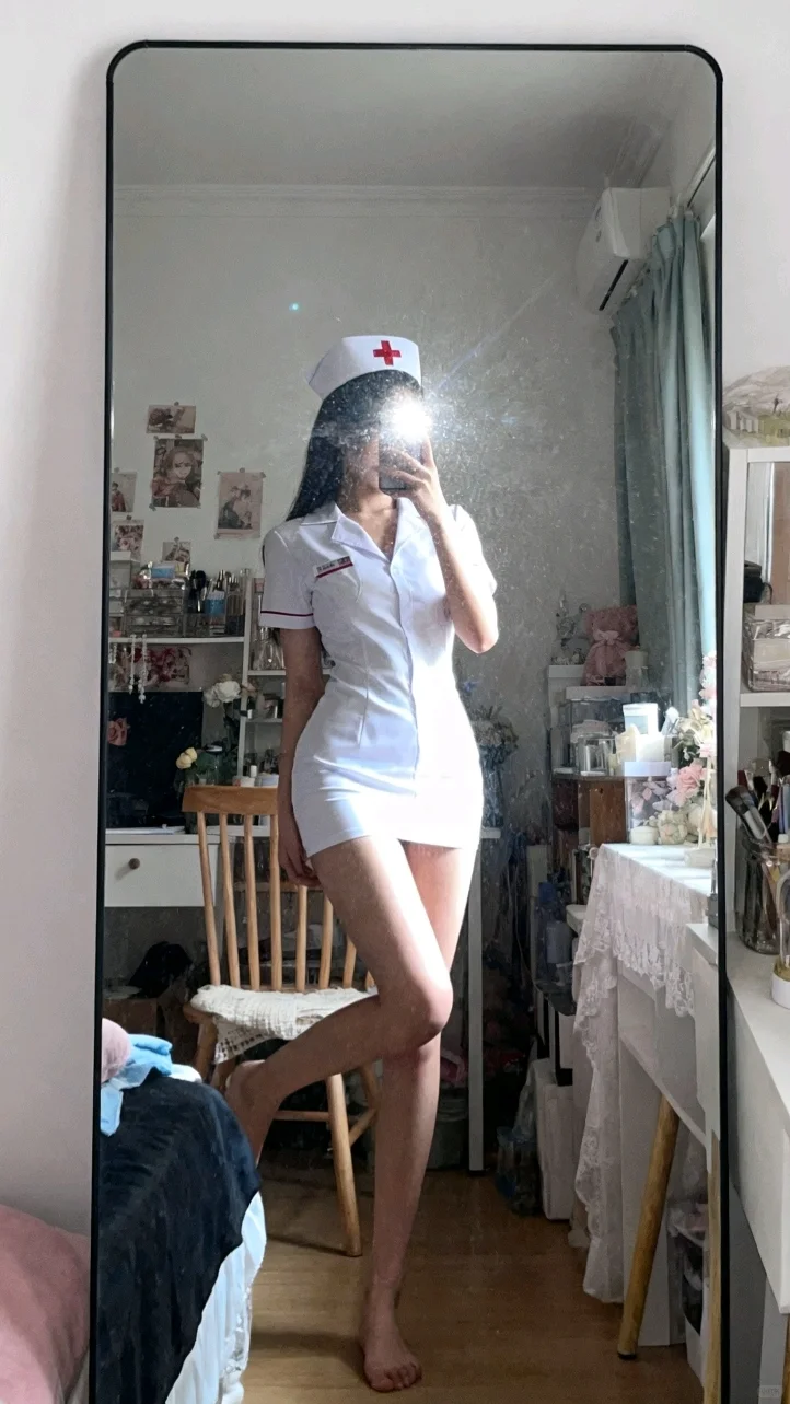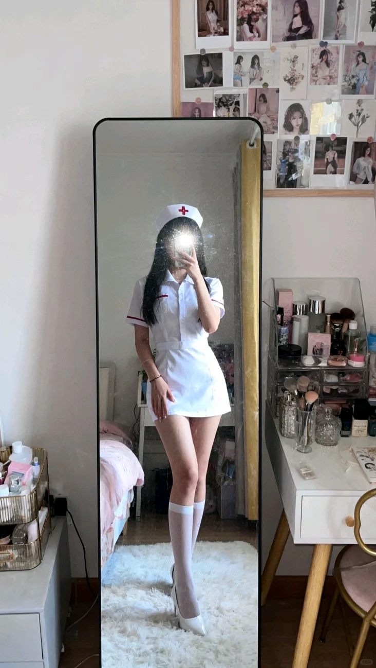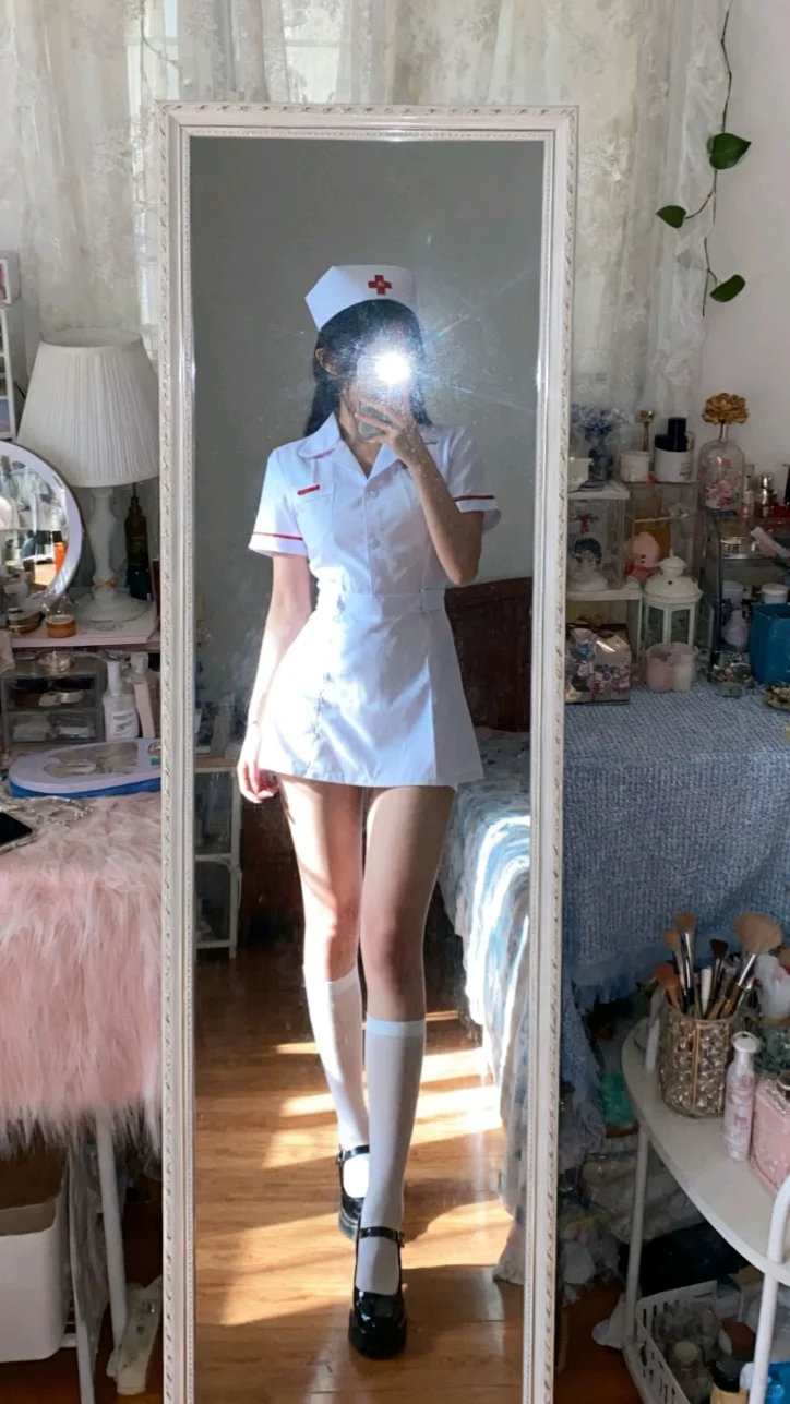今天尝试了护士风格的穿搭,白色制服搭配同色系长袜与高跟鞋,还挺有那味儿~感觉自己瞬间进入了“白衣天使”的角色氛围里,还挺有趣的~