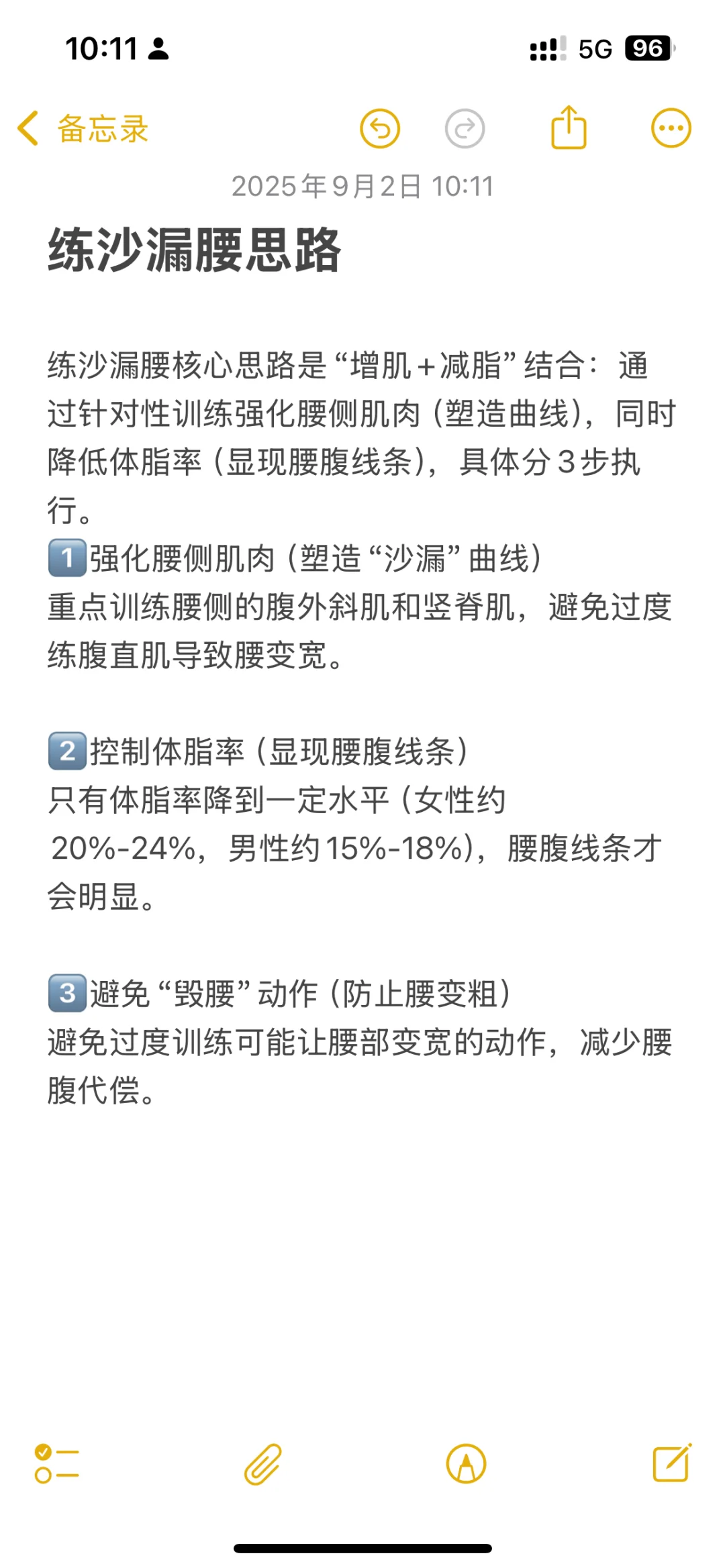 3️⃣找到引发问题的原因(这点超级重要‼️‼️‼️)。问题自测出来后,就去找背后的原因。举个例子,比如腰腹赘肉多,可能是核心力量弱导致脂肪易堆积,也可能是长期久坐、弯腰的不良体态影响,甚至二者都有。只有找到原因,对症训练,瘦腰才会高效。还要注意:看着相似的腰腹问题,原因可能不同,不能一概而论。比如我的腰粗是核心弱导致,你的腰粗是久坐体态问题,两人训练重点就不一样,这也是为什么同样的瘦腰动作有人练有效、有人没效果——练错了重点!找到自己的原因对症训练才是重中之重,盲目跟练又累又没用😂