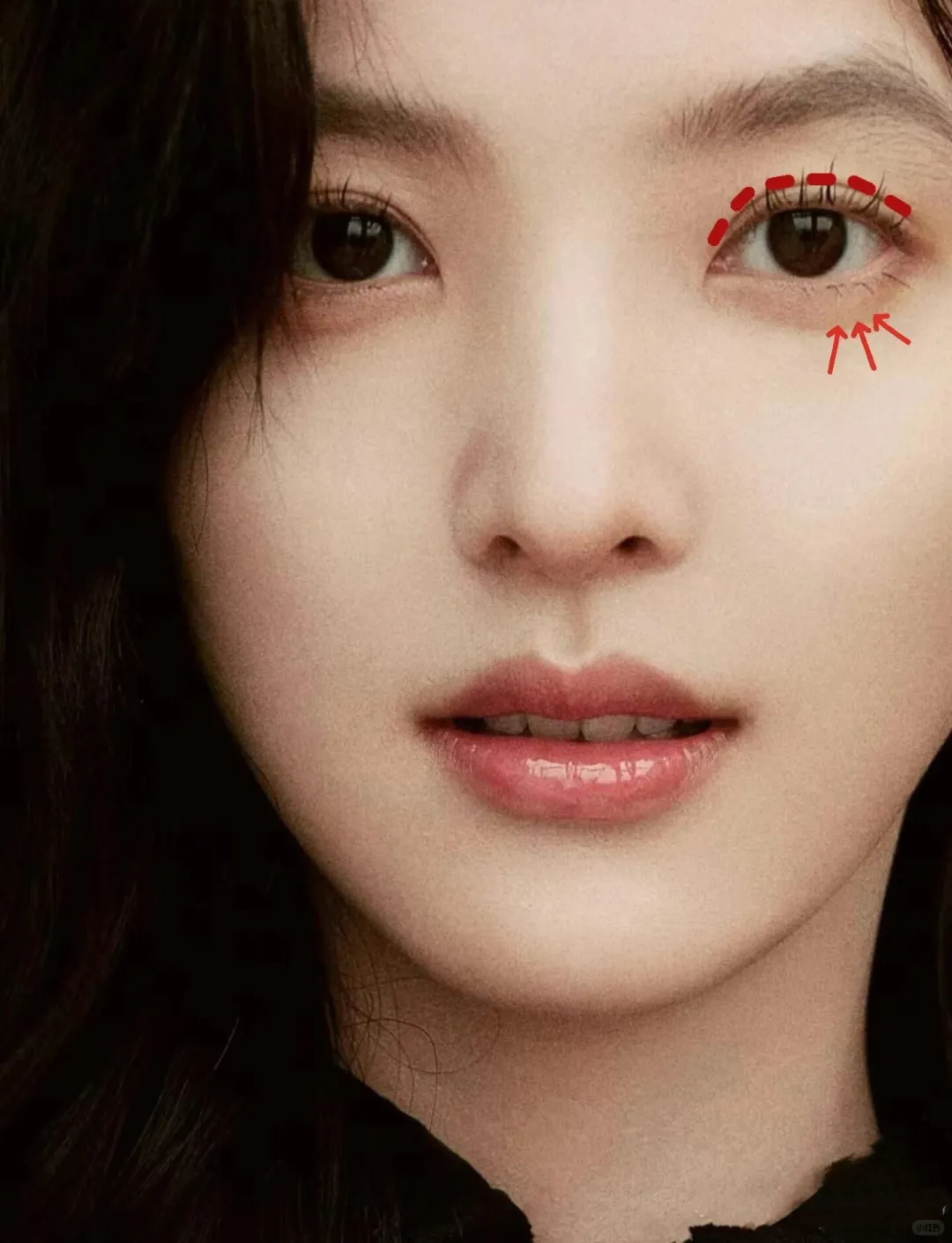 上眼皮前窄后宽的平扇,并且内眼角尖,外眼角圆,整个眼影看起来会更加的可爱,其次是外眼角有一点自然的下至,让眼睛看起来很是无辜~