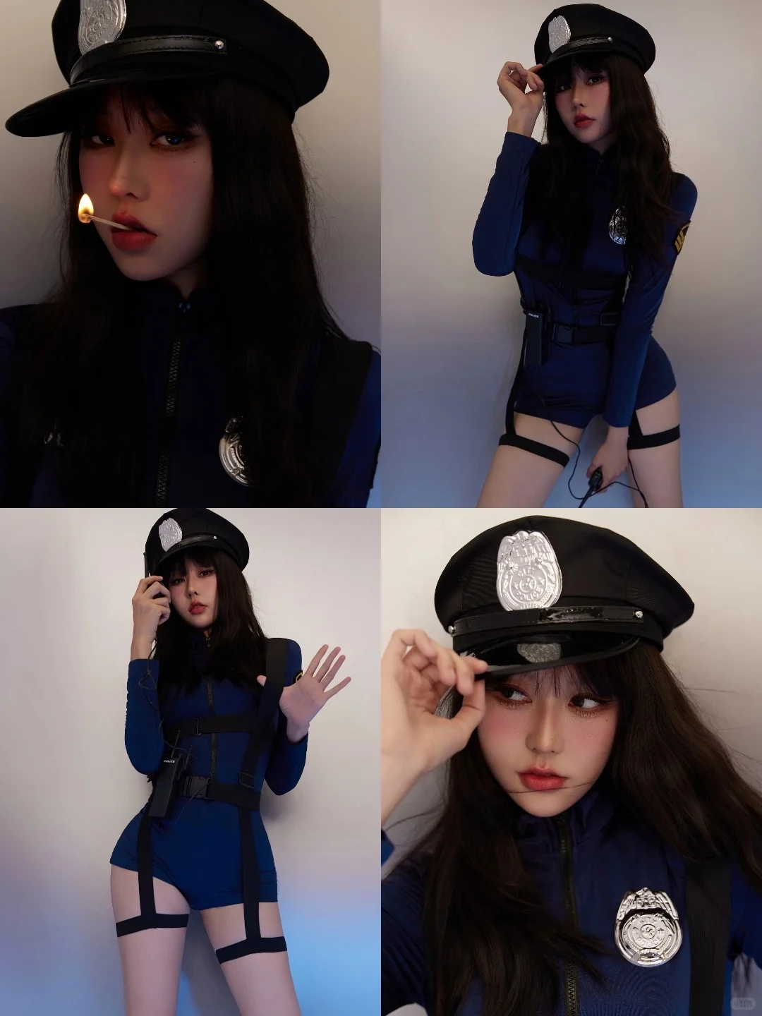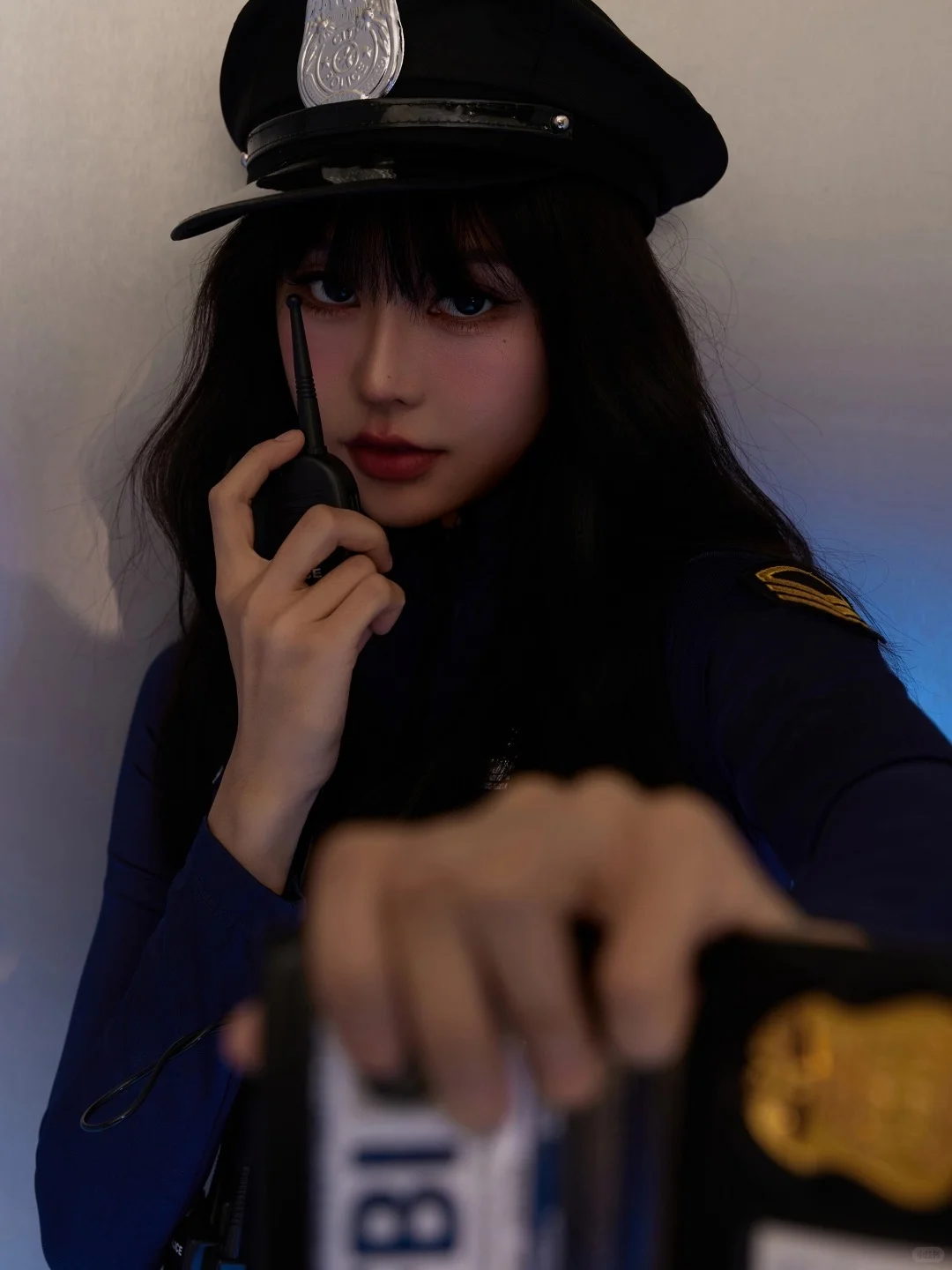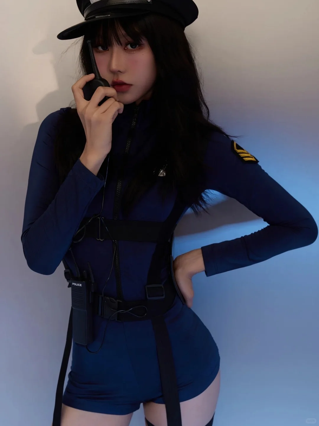一身深蓝FBI定制制服,警帽斜戴增添不羁感,金属对讲机握持瞬间戏精上身!短裤剪裁精准凸显大长腿,搭配黑色战术靴拉长比例~