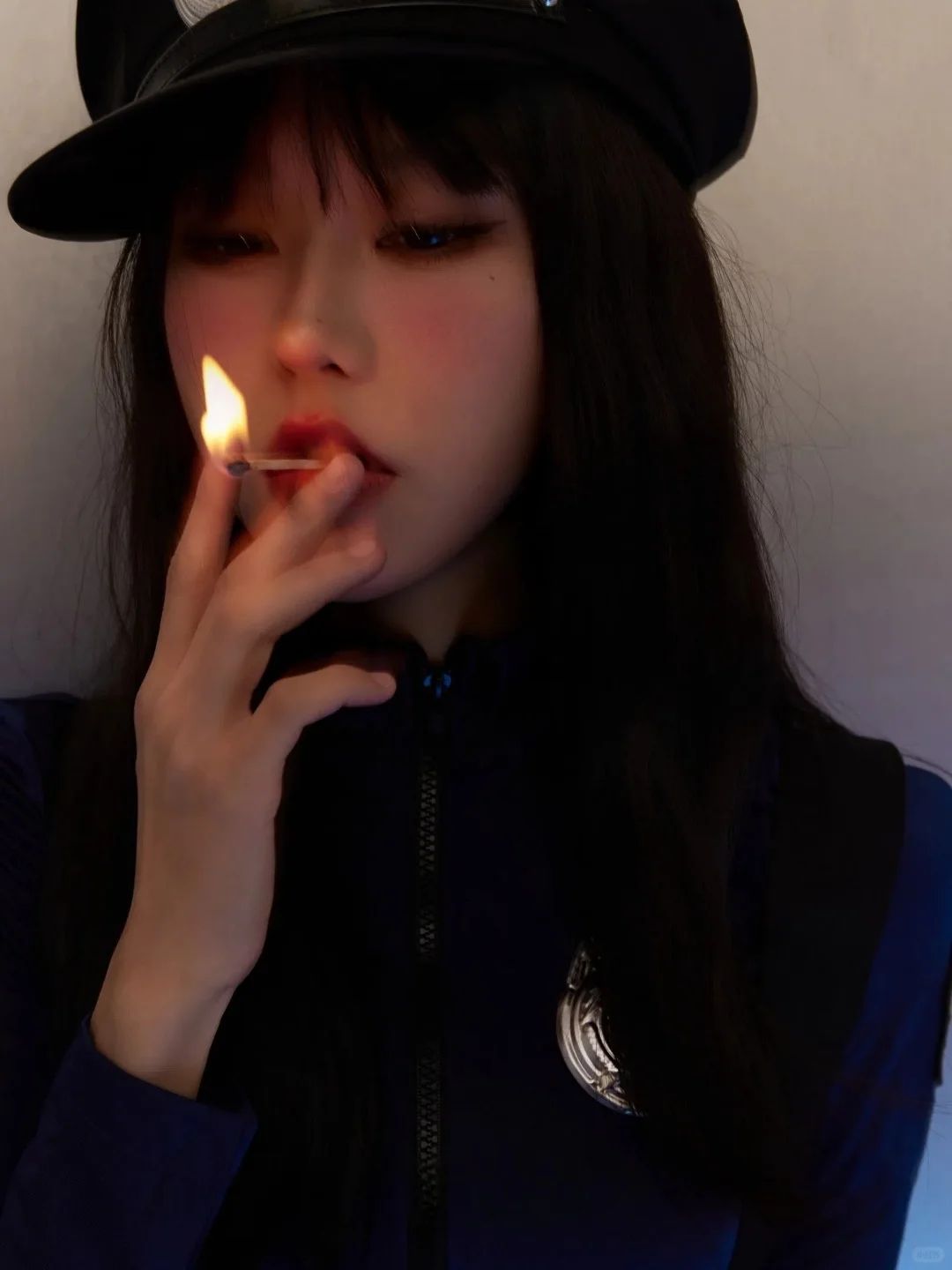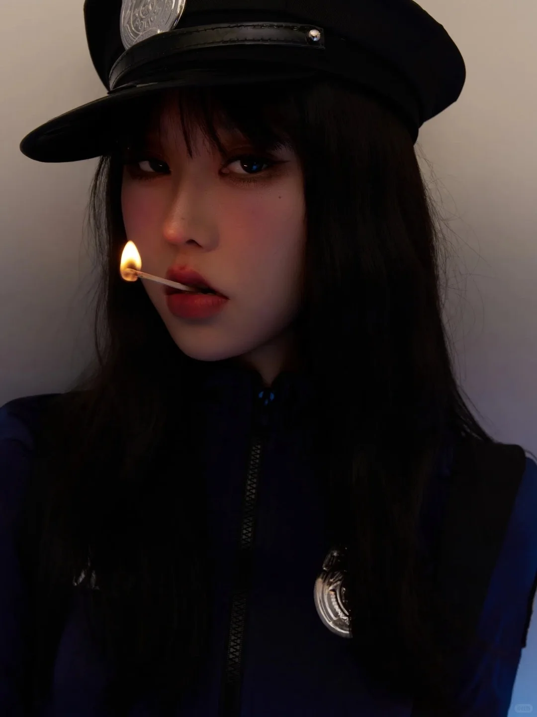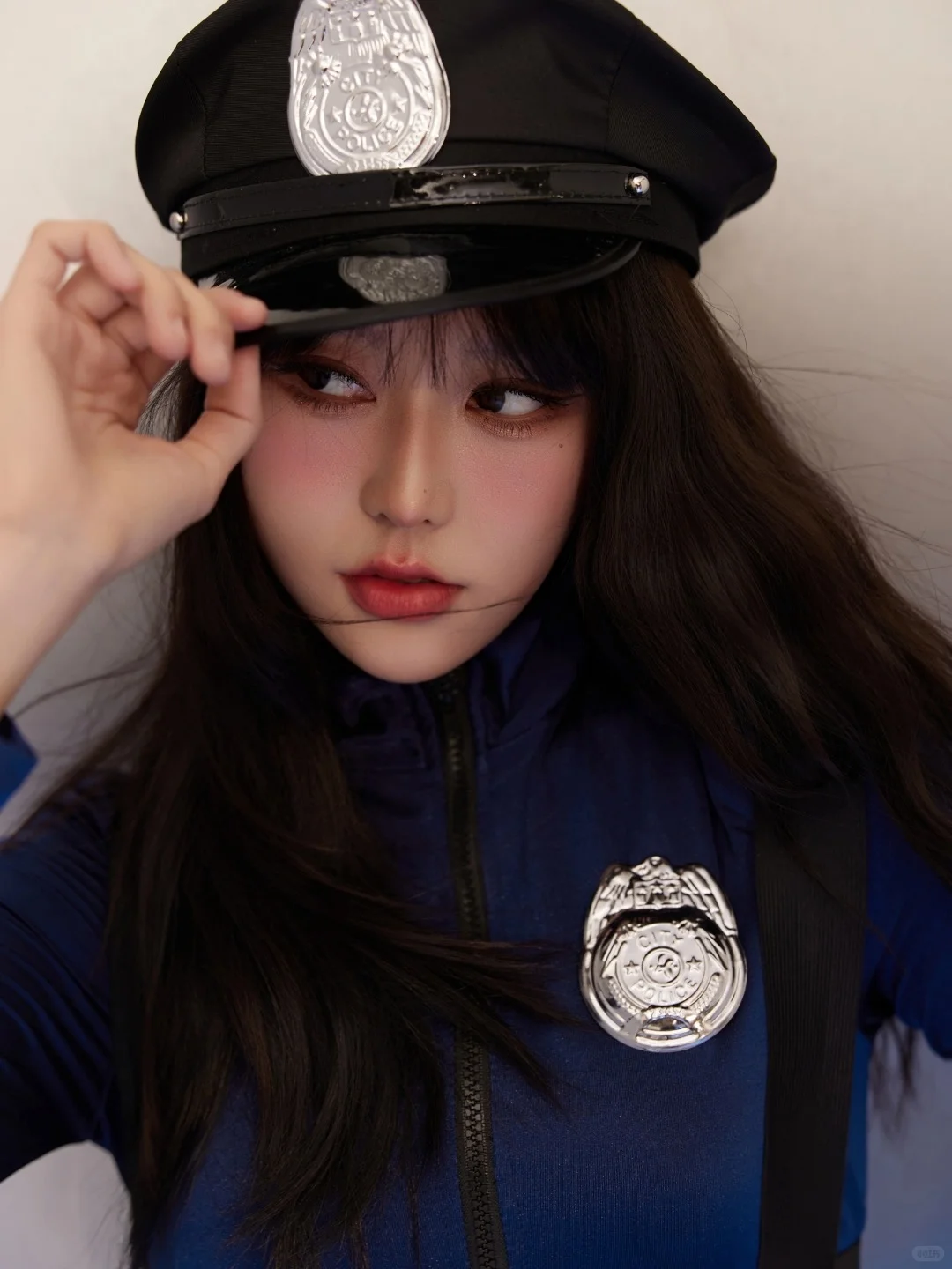 一身深蓝FBI定制制服,警帽斜戴增添不羁感,金属对讲机握持瞬间戏精上身!短裤剪裁精准凸显大长腿,搭配黑色战术靴拉长比例~