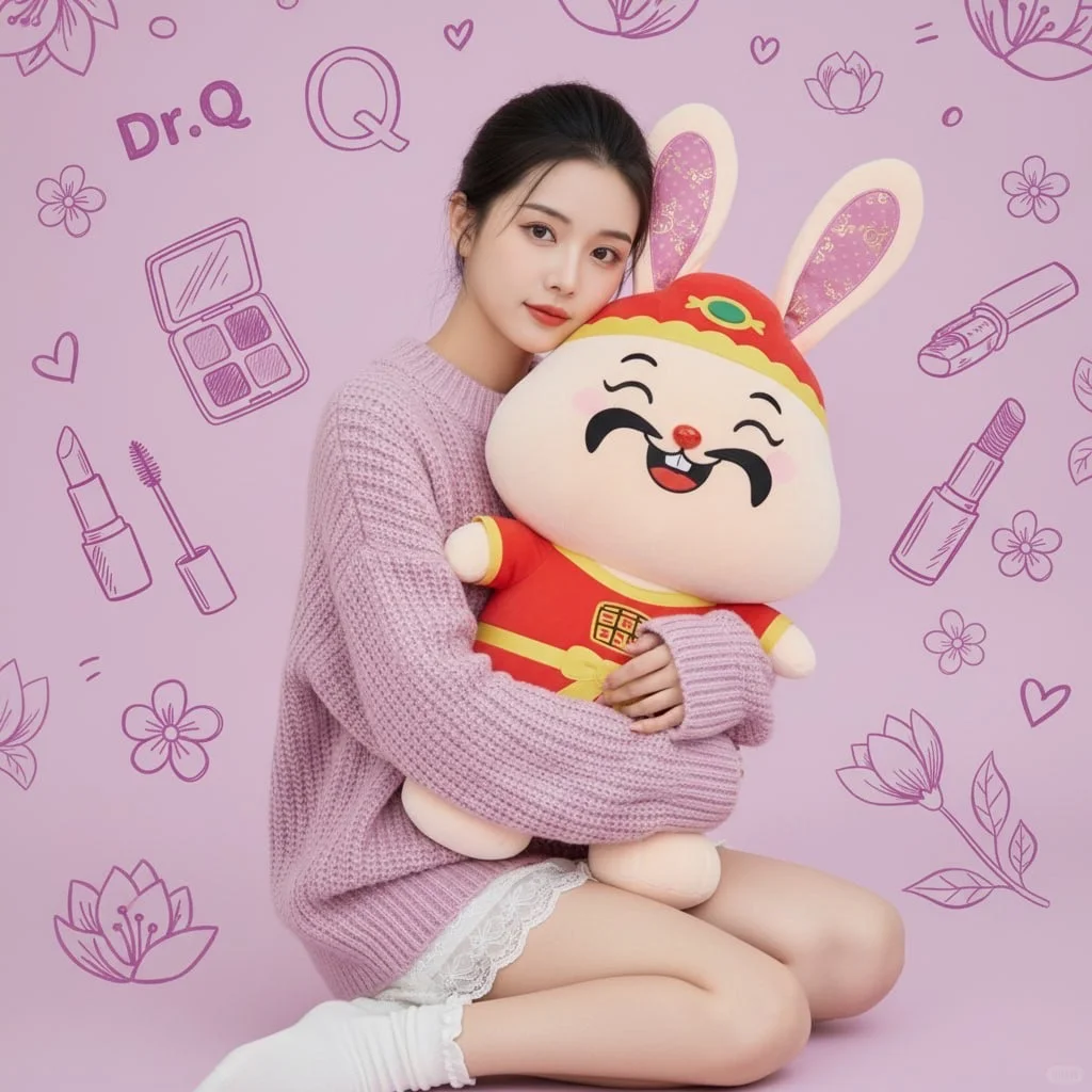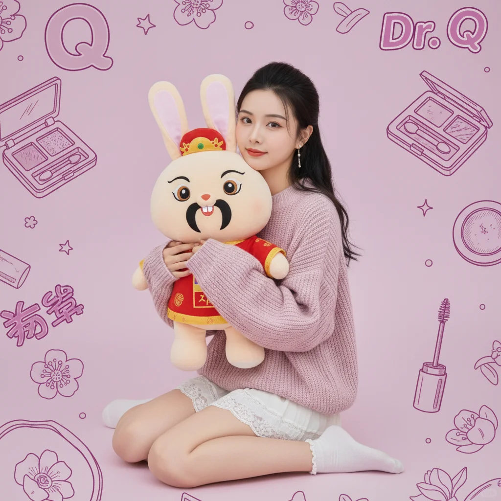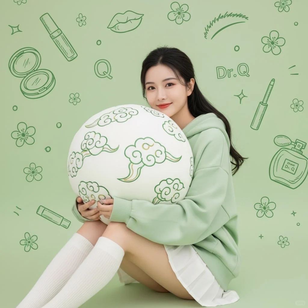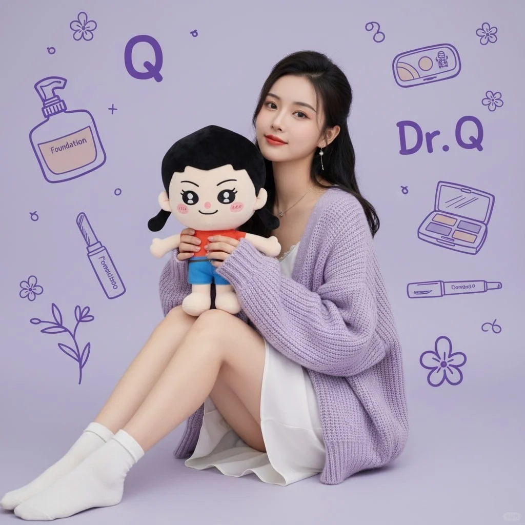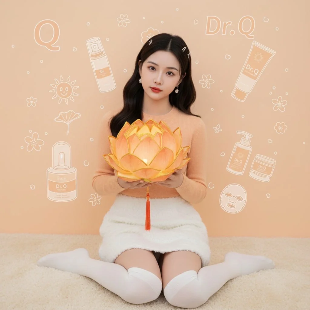 一张具有K-pop风格的全身工作室肖像,主角是一位面部特征与你提供的参考图一致的年轻东亚女性。她优雅地坐在柔和的浅橘色背景前的地毯上,穿着一件质地柔软的淡橘色针织上衣,搭配一条白色蓬蓬裙和白色过膝袜。她怀中抱着一个大号的莲花灯造型的毛绒玩具,眼神充满爱意地注视着相机。背景墙以手绘淡橘色涂鸦和文字作为装饰,内容包括‘Q’、‘Dr. Q’、防晒霜、精华液、面膜、护肤套装以及各种精致的花卉图案。明亮而柔和的光线烘托出一种清新、浪漫的可爱氛围,犹如K-pop艺人的独家写真。