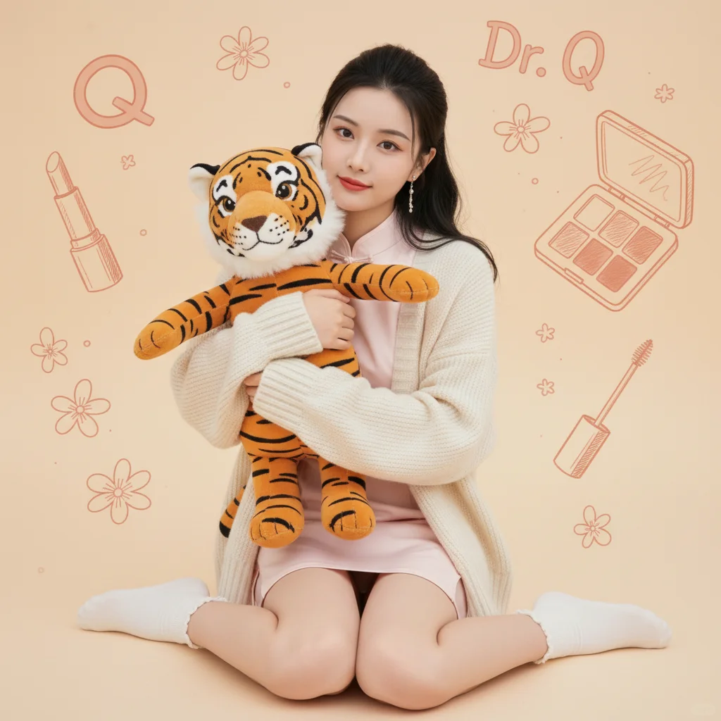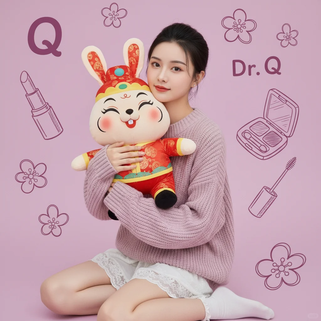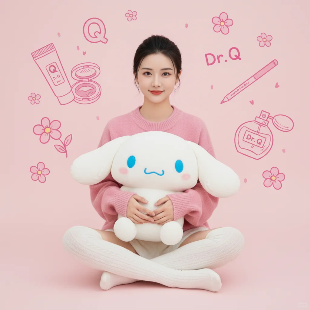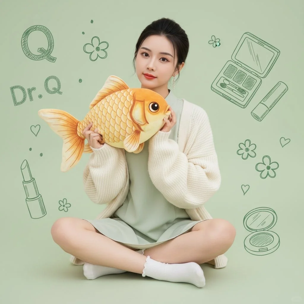 一张具有K-pop风格的全身工作室肖像,主角是一位面部特征与你提供的参考图一致的年轻东亚女性。她优雅地坐在柔和的浅橘色背景前的地毯上,穿着一件质地柔软的淡橘色针织上衣,搭配一条白色蓬蓬裙和白色过膝袜。她怀中抱着一个大号的莲花灯造型的毛绒玩具,眼神充满爱意地注视着相机。背景墙以手绘淡橘色涂鸦和文字作为装饰,内容包括‘Q’、‘Dr. Q’、防晒霜、精华液、面膜、护肤套装以及各种精致的花卉图案。明亮而柔和的光线烘托出一种清新、浪漫的可爱氛围,犹如K-pop艺人的独家写真。