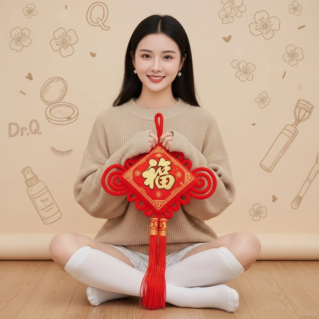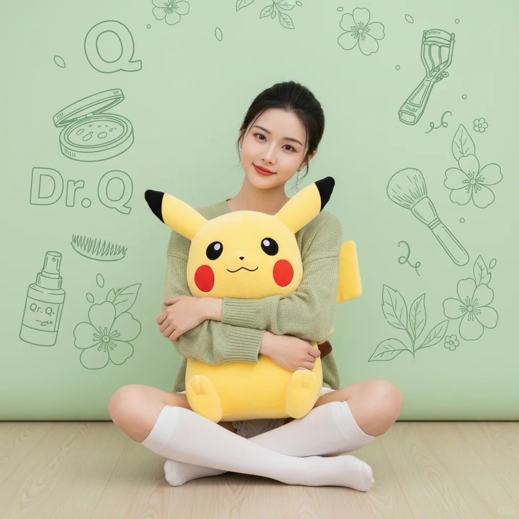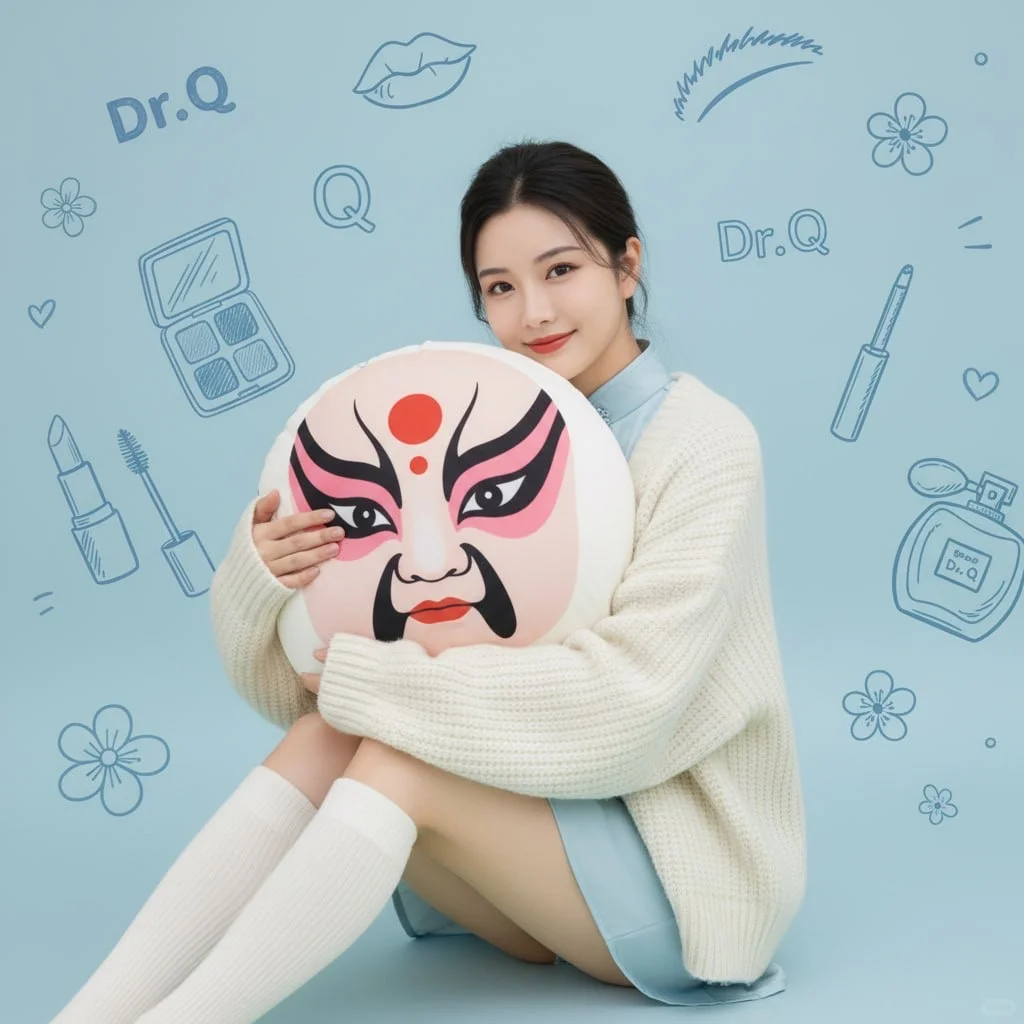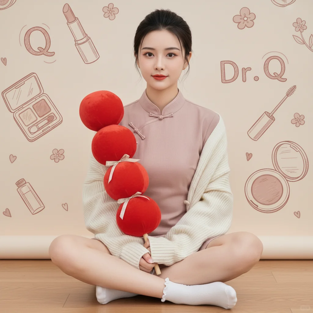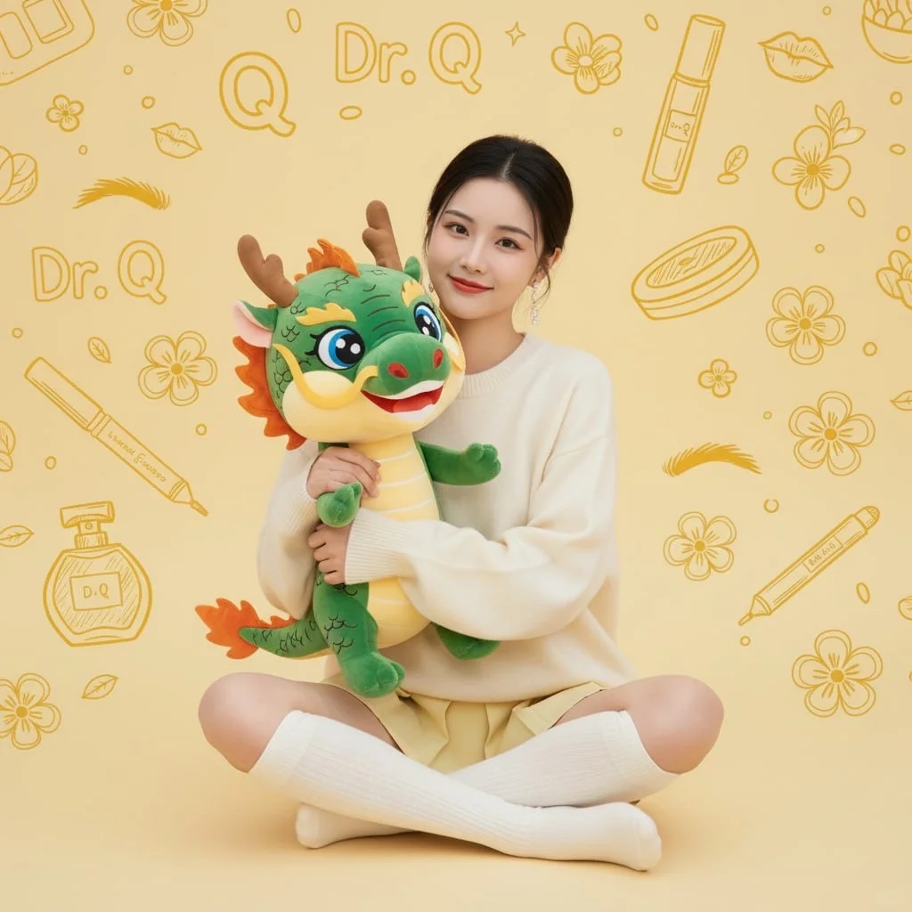 一张具有K-pop风格的全身工作室肖像,主角是一位面部特征与你提供的参考图一致的年轻东亚女性。她优雅地坐在柔和的浅橘色背景前的地毯上,穿着一件质地柔软的淡橘色针织上衣,搭配一条白色蓬蓬裙和白色过膝袜。她怀中抱着一个大号的莲花灯造型的毛绒玩具,眼神充满爱意地注视着相机。背景墙以手绘淡橘色涂鸦和文字作为装饰,内容包括‘Q’、‘Dr. Q’、防晒霜、精华液、面膜、护肤套装以及各种精致的花卉图案。明亮而柔和的光线烘托出一种清新、浪漫的可爱氛围,犹如K-pop艺人的独家写真。