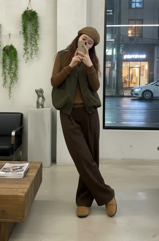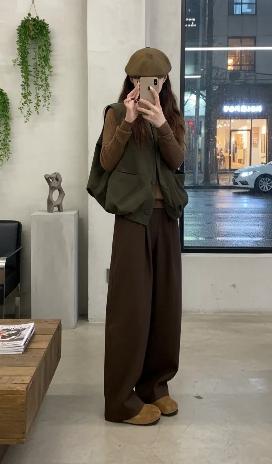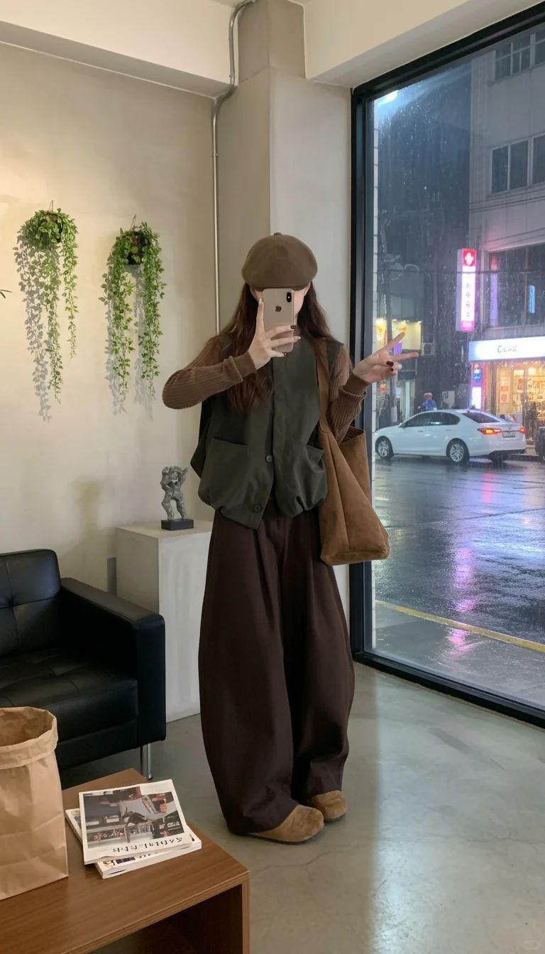 提示词 背景环境是一处兼具工业风与温馨感的室内空间: 墙面为浅灰色水泥质感,简洁质朴;左侧悬挂着几簇翠绿的垂吊植物,为空间注入自然生机。旁边立着水泥材质的展示台,台上摆放着一件抽象风格的小雕塑,颇具艺术感;左侧还能看到部分黑色家具(疑似沙发),丰富了空间层次。 前景有一张木质小桌,桌上放着牛皮纸袋与几本杂志,生活气息浓厚。右侧是一扇大窗户,窗外是雨夜的城市街道:湿润的路面反射着灯光,一辆白色汽车正在行驶,街道旁商铺灯火通明,营造出都市雨夜中静谧与繁华交融的氛围。