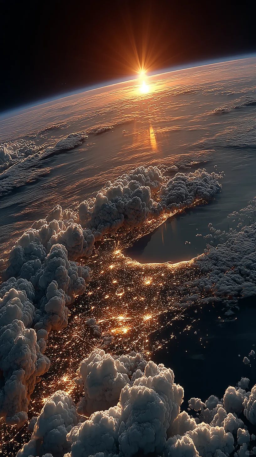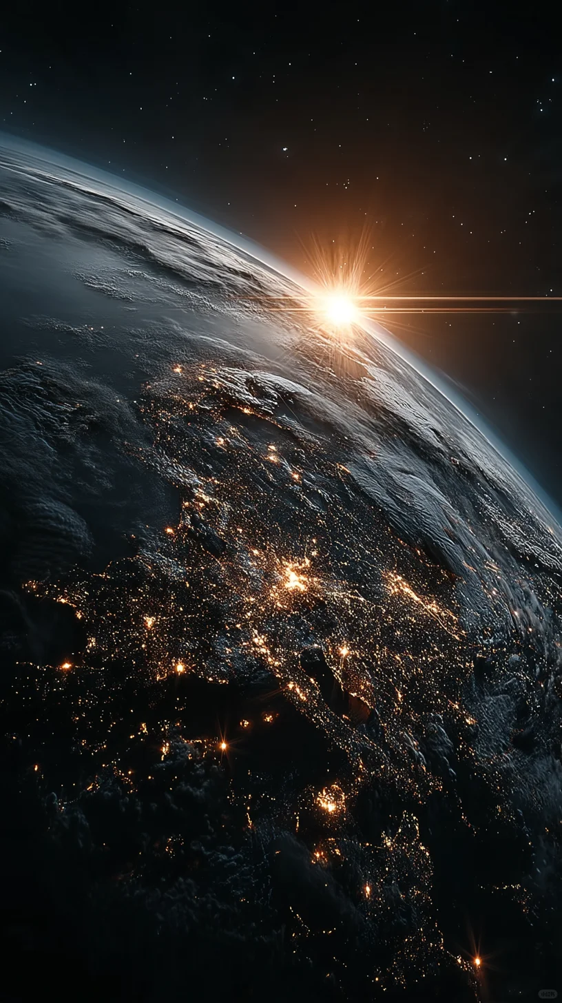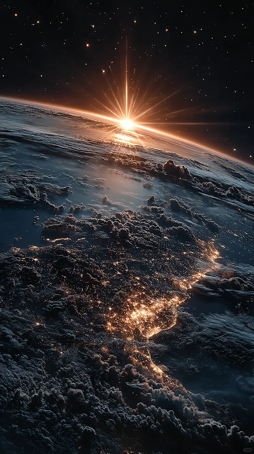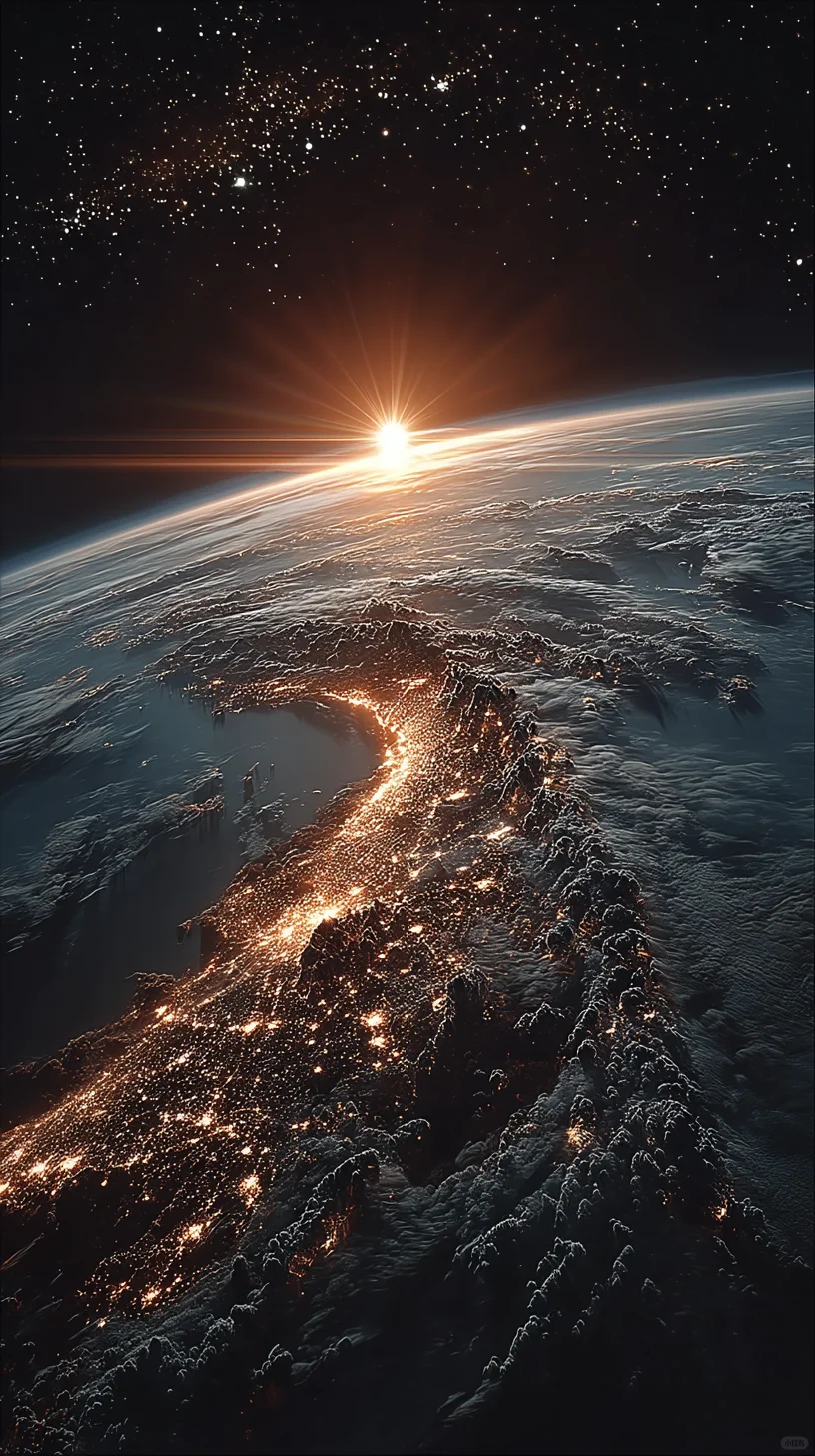 当第一缕金色的阳光☀️冲破地平线,瞬间点亮了地球的轮廓,那道绝美的蓝色大气辉光,简直像是地球的守护光环。云层☁️在晨曦中被镶上了金边,而我们脚下的这片土地,在沉睡中依然闪耀着温暖的城市灯火,像不像散落在夜幕上的繁星?✨