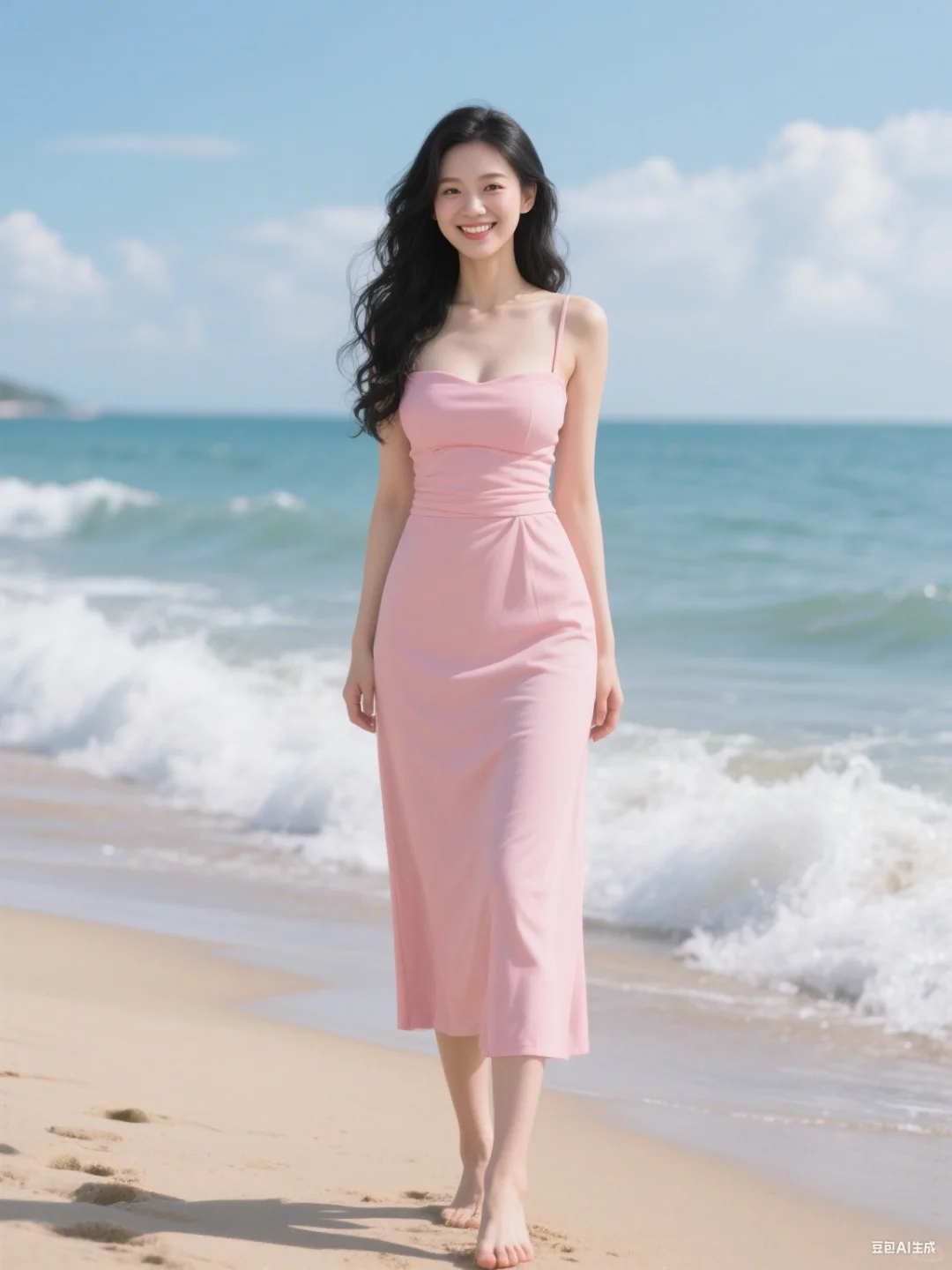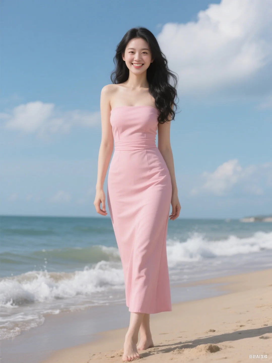 赤脚漫步沙滩上,一袭粉裙如春日繁花绽于海天间。抹胸设计勾勒柔美肩颈,长裙贴合身姿,随海风轻摆。笑靥明亮,长发微扬,将海滨的浪漫与粉裙的温柔,揉成专属的明媚风景,每一步都似踏在诗意里。