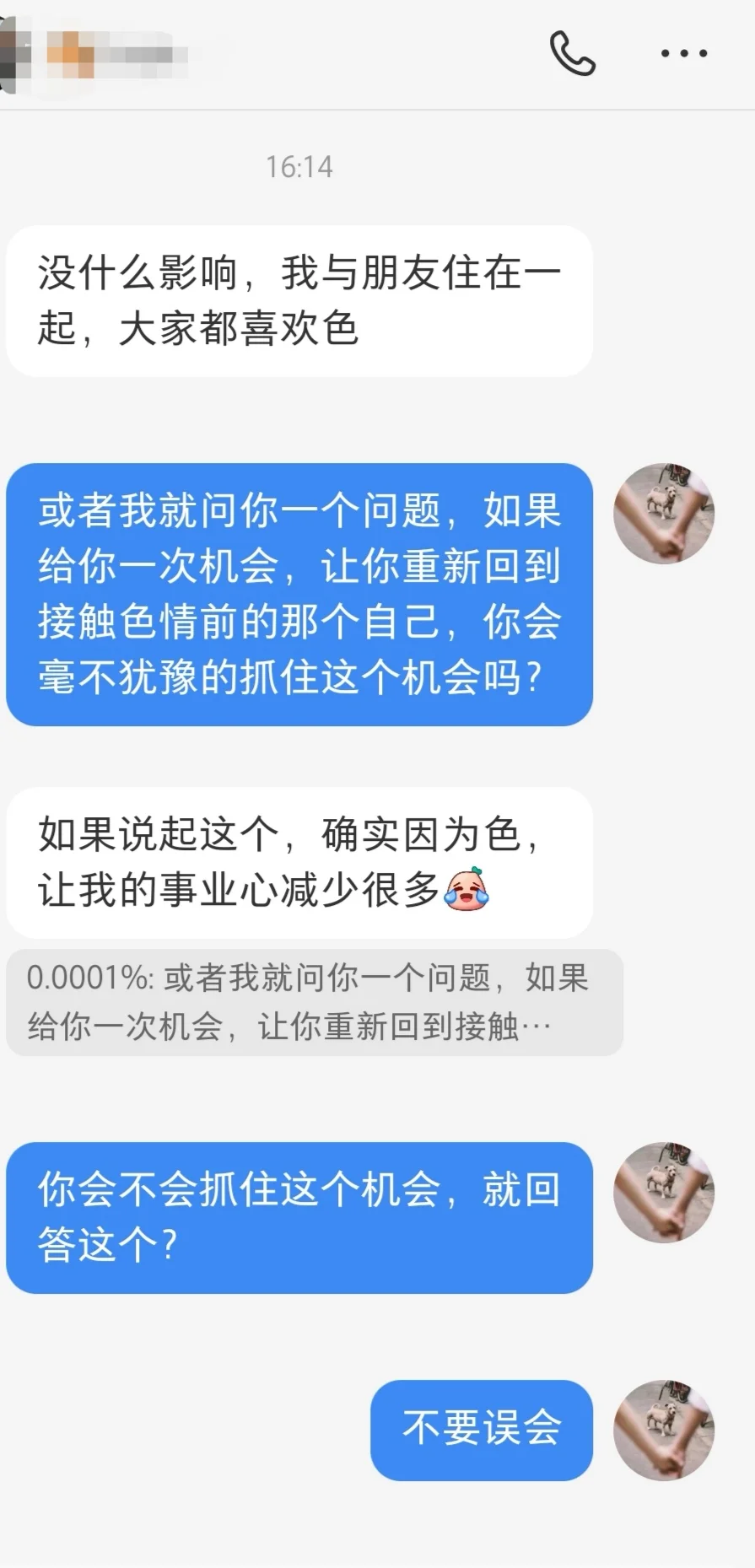 他说的话大部分都是我第一次开始jie se 的观点,当你沉浸在se qing 的世界中,你以为的真相全是se qing想给你看到的。只有自己能救自己,你以为你发现了新大陆沾沾自喜,却不知你已经掉落陷阱中。正如chou yan的人认为比别人多享受了chou yan的快乐,其实正常人所拥有的快乐,他是永远体会不到的,或者他已经忘记了自己chou yan之前的快乐是怎样的。