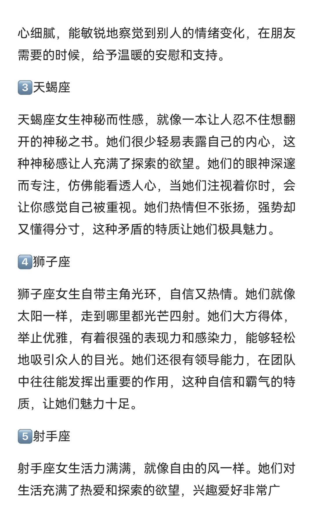 天秤座优雅友善,双鱼座浪漫细腻,天蝎座神秘性感,狮子座自信热情,射手座活力独立。这些星座女生各有独特魅力,让人难以忘怀。