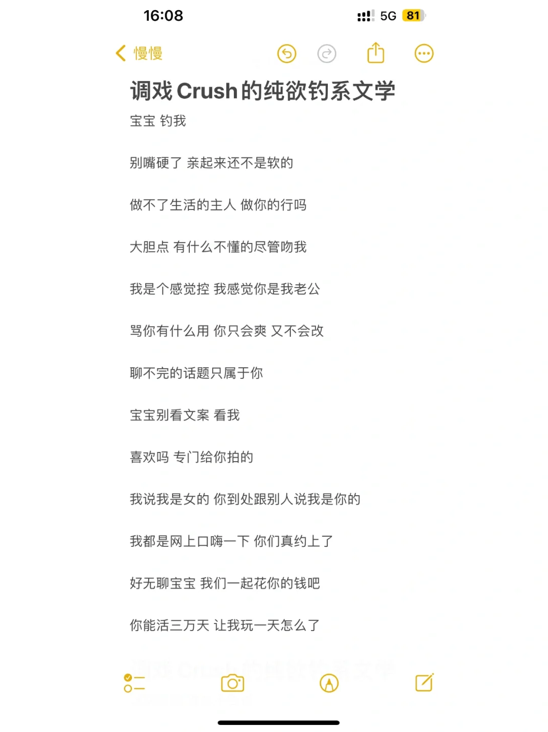 #和crush聊天 #打直球 #关于我的crush #追男生 #我被文字打动 #文字 #句子 #分享欲 #文学 #文案 #文案分享 #文案馆 #手写文案 #小众文案 #恋爱 #恋爱日常 #恋爱小技巧 #关于我的crush #crush #和crush聊天 #甜妹 #显眼包文案 #文字素材分享 #浪漫 #发疯文学 #朋友圈官宣文案 #幸福感 #幸福感爆棚 #笨蛋美女 #自拍 #和crush打直球